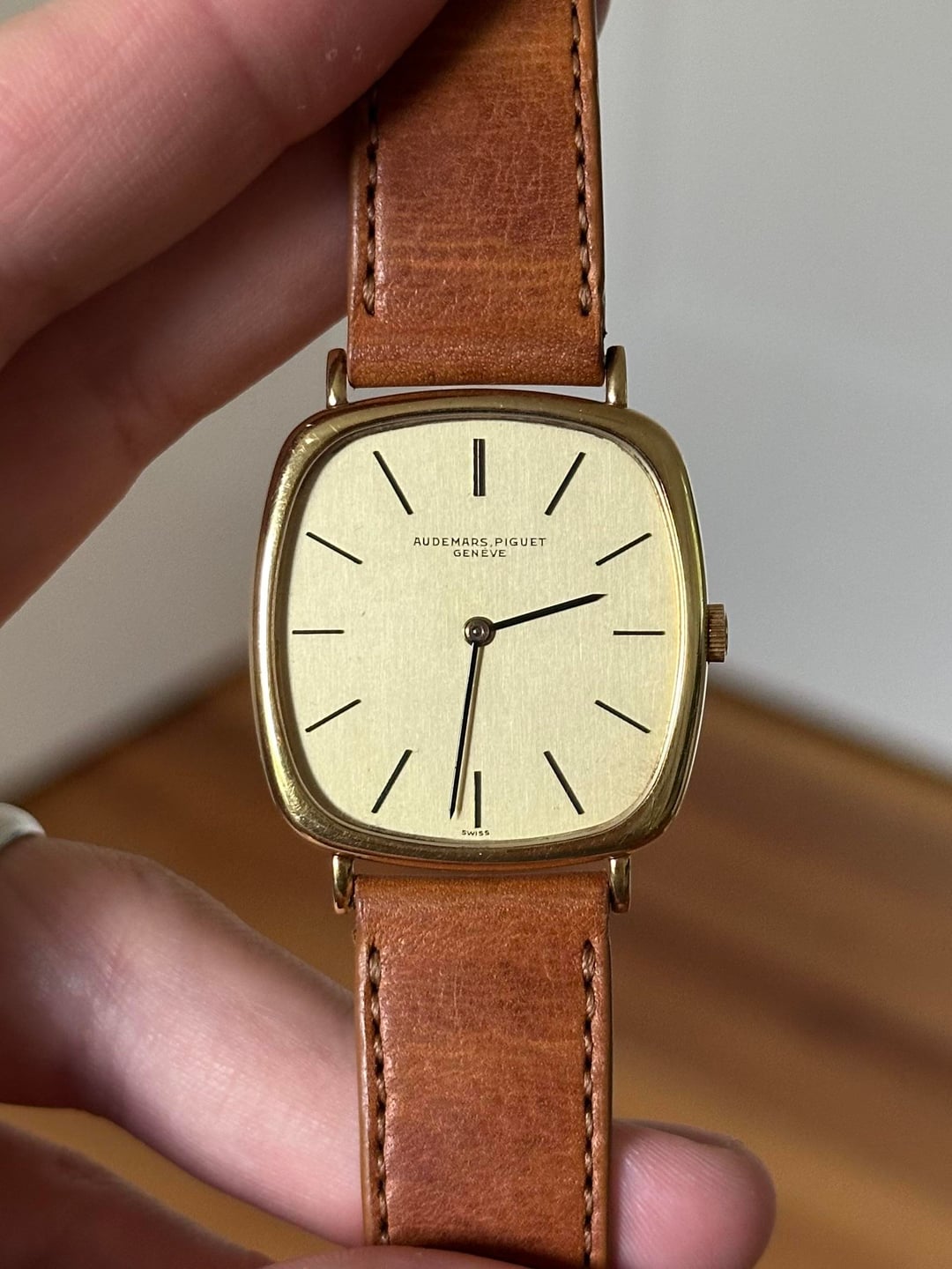 Up for sale is a 1970s Audemars Piguet cushion case in 18k yellow gold. The watch is in beautiful condition, featuring a yellow dial and black markers. Many of these watches have dial degradation--this one has a very clean light tapestry dial without any significant marks. The 18k yellow gold case is similarly in very good shape. It has some very minor signs of wear, but no significant marks or damage whatsoever. The watch features a manual wind, Caliber 2001 Audemars Piguet movement. The movement is currently running excellently at -8.5 seconds per day. The case is on the verge of "ultra thin," measuring in at approximately 5.5mm in terms of thickness. The dial is 34mm x 32mm. This wears with classic dress watch proportions. I love vintage APs because they are very often unique or close to unique pieces. Add in the fact that they are precious metal and use some of the thinnest movements of the time (and still almost of today), and I think you have a recipe for magic. This is one of those watches. **Price:** $4,550 **Timestamp:** in photos **Videos:** I can send a video of the watch through my instagram, @WarmDials **Payment and Shipping:** to be agreed upon by the buyer and myself, taking the buyer's purchase history into consideration. I'm located in the United States and frequent user in this community. I have bought and sold often, and I'm happy to answer any questions you may have / provide more photos or a video. You can find me on instagram at @WarmDials. Don't hesitate to reach out if you have any questions or want to chat
