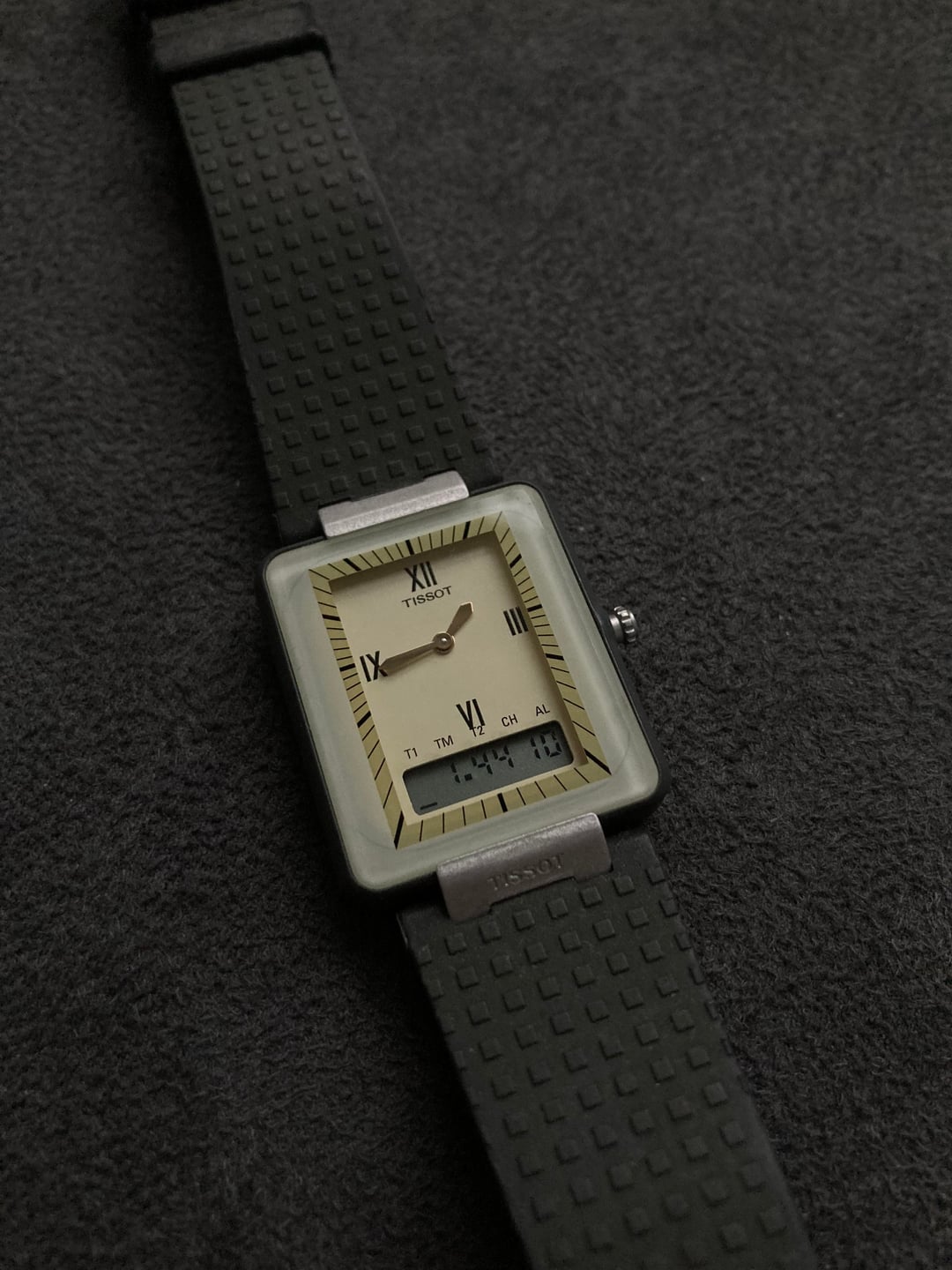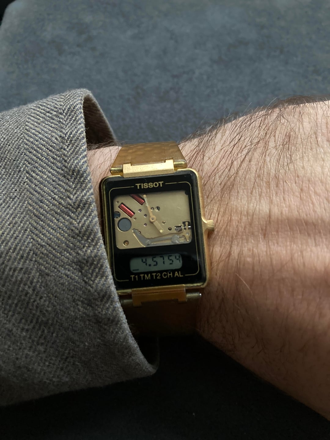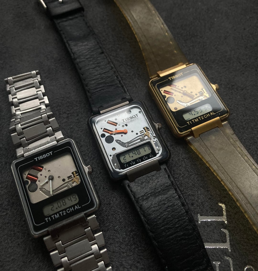 Selling these beautiful late 19980s or early 1990s Vintage Tissot Two Timers. **All watches are in fully functional condition and prices are slightly negotiable and net to me. All watches are true vintage with ranging levels of condition.** TIMESTAMP: [https://imgur.com/a/3rfXysy](https://imgur.com/a/3rfXysy) Worldwide shipping available at buyers cost. Payment via Wire, Wise or PayPal G&S (+fees) for established users. \#1 Silver Two Timer Skeleton with a Tissot printed crystal, a silver metal bracelet and white hands. Asking: 260€ \#2 Gunmetal Two Timer Skeleton with a Tissot printed ghost crystal, a black leather strap and signal orange hands. Asking: 265€ \#3 Gold Two Timer Skeleton with a Tissot printed crystal, a gold rubber strap and gold hands. Strap is a bit stiff due to age but still works fine. Asking: 230€ \#4 Silver Two Timer Skeleton with a Tissot printed crystal, a black leather strap and signal orange hands. Asking: 230€ \#5 Silver Two Timer Skeleton with a Tissot printed crystal, a silver metal bracelet and grey and white hands. Asking: 260€ \#6 Gunmetal Two Timer Skeleton with a Tissot printed crystal, a black leather strap and black and grey hands. Asking: 220€ \#7 Gold Two Timer Skeleton with a Tissot printed crystal, a black leather strap and black hands. Asking: 230€ \#8 Shiny Gunmetal Two Timer Skeleton with a Tissot printed crystal, a grey leather strap and black and grey hands. Asking: 220€ \#9 Gunmetal Two Timer with a Tissot printed crystal, a black dial with red Tissot printing, a black rubber strap and black hands. Asking: 220€ \#10 Grey Two Timer with a printed crystal, a creme dial, a black rubber strap and silver hands. Asking: 100€ \#11 Black Two Timer with a printed crystal, a yellow tapisserie dial, a black leather strap and black hands. Heavy scratch marks Asking: 80€
