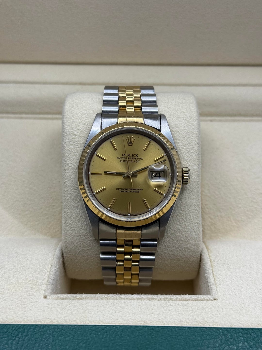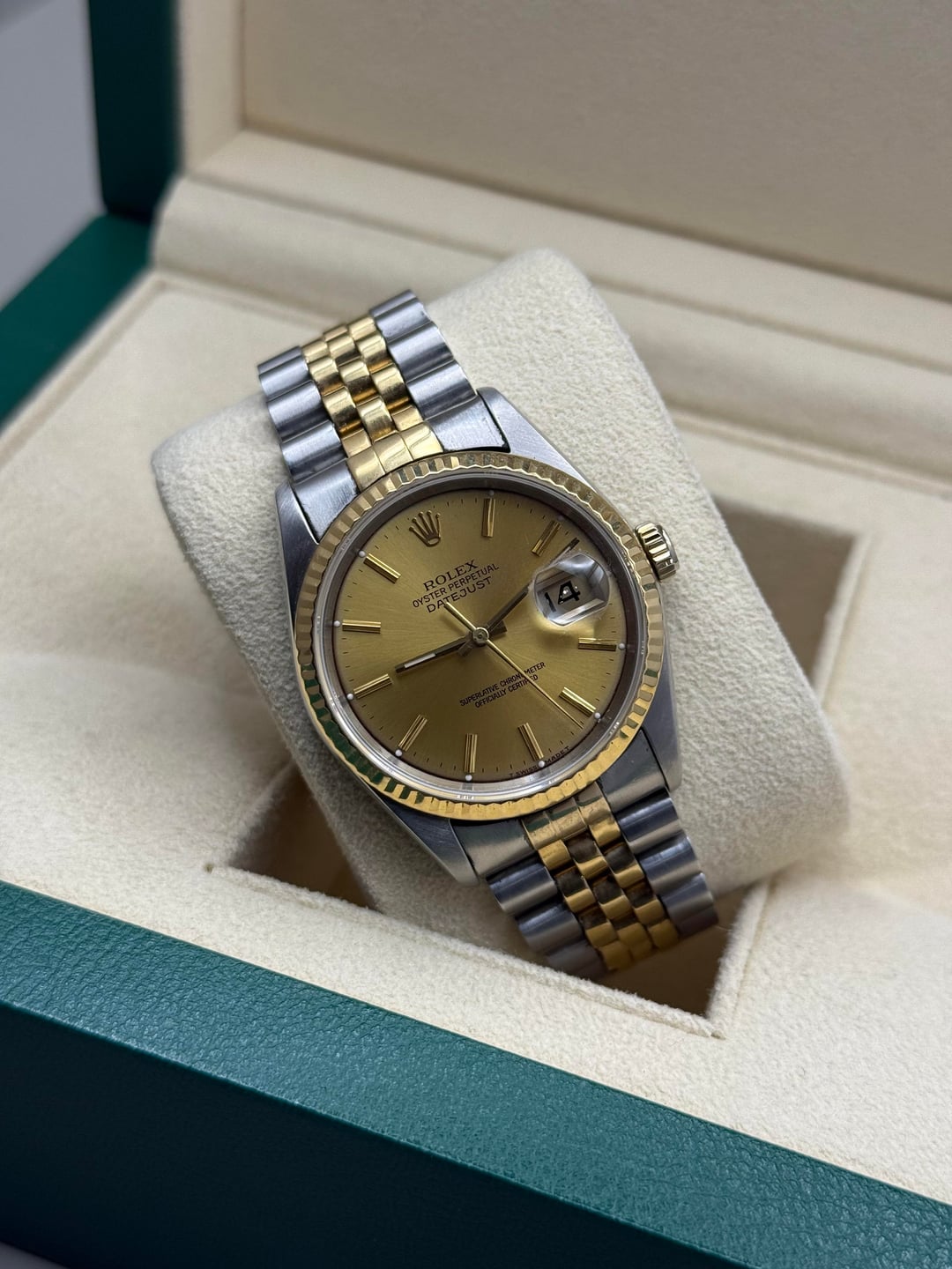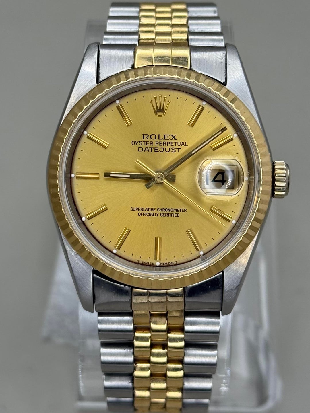 | ROLEX, DateJust 36mm case, gold dial, fluted bezel, jubilee bracelet; Mod# 16233 igotitall13 (989) |