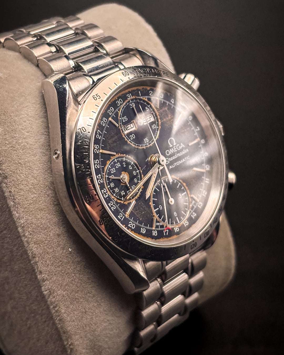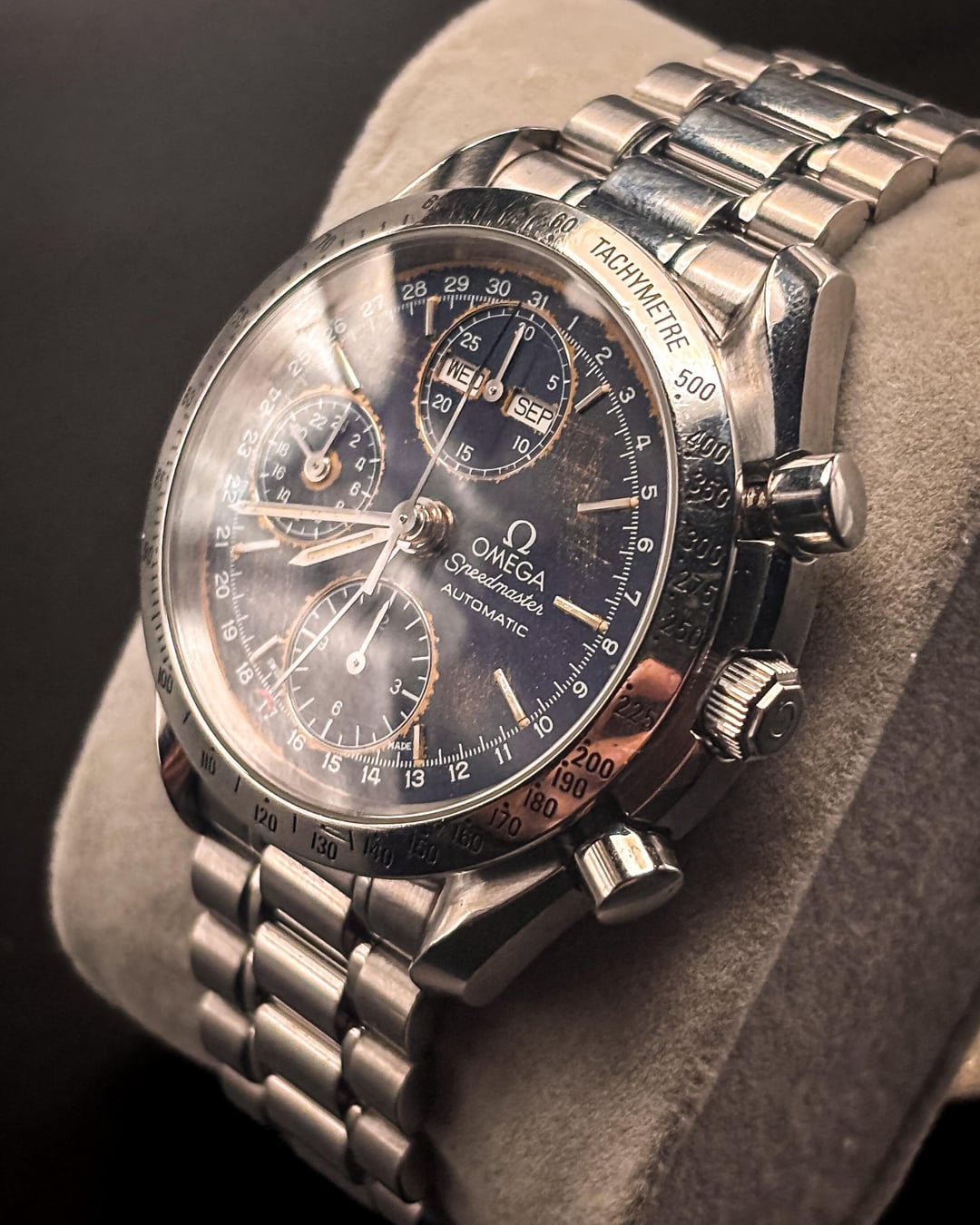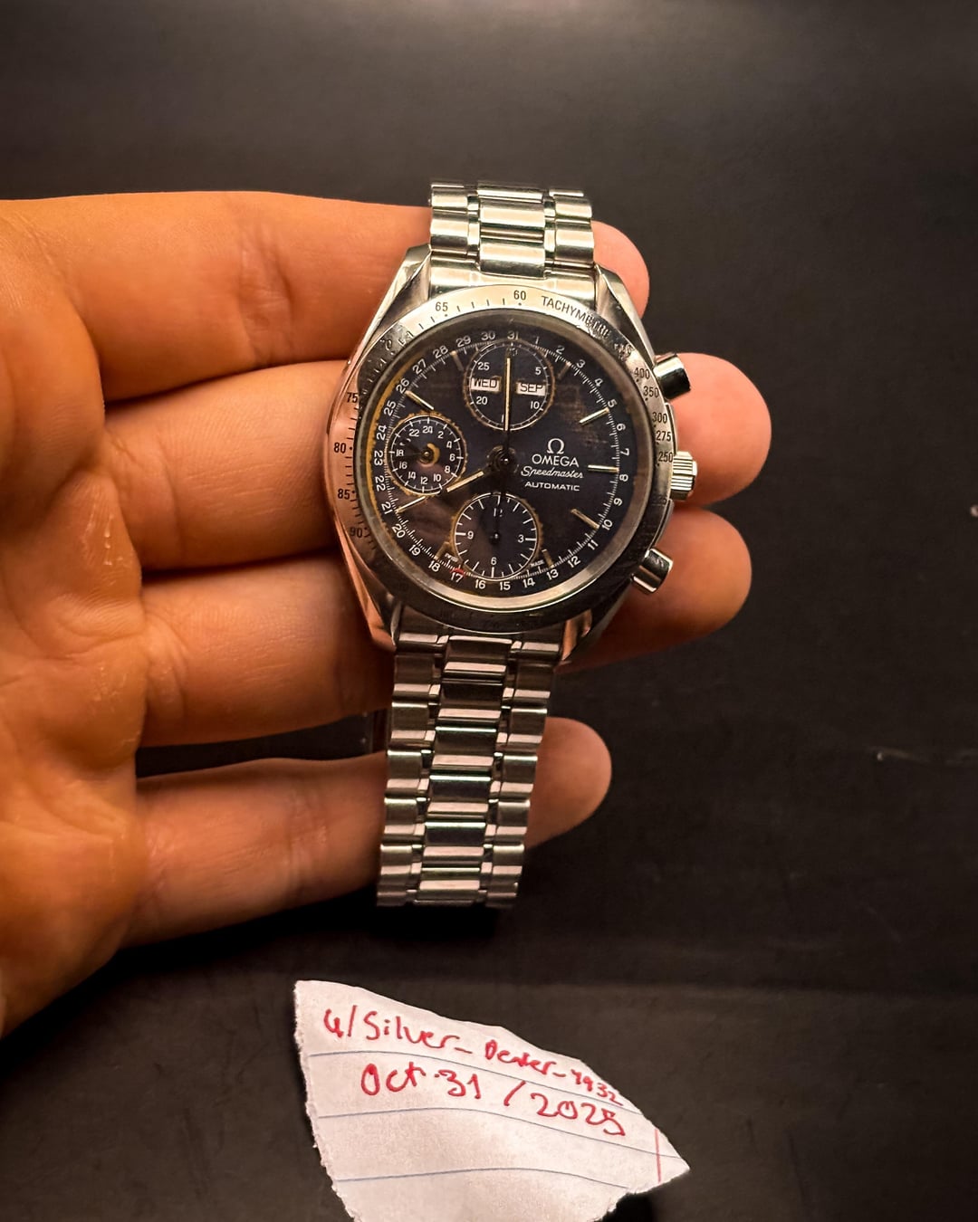 Condition: Light surface wear on case and bracelet. No dents or deep scratches. Crystal is clean. Crown and pushers operate smoothly, and the automatic chronograph runs well. Bracelet brushing intact with light desk wear, clasp closes securely. Accessories: Watch only + Sized for a 7.2” wrist. Price: $1,599 (Zelle or Wire). Apple Pay +15 | Venmo +25 Shipping: Buyer provides shipping label or $50 for a fully insured Fed ex 2 day label. Timestamp: Included in photos above. Overview: Omega Speedmaster Triple Date (Ref. 3521.80) featuring a 39mm stainless steel case, blue sunburst dial with triple calendar (day, date, month), and warm patina on gold-tone accents. Powered by the Omega Calibre 1151 automatic chronograph (Valjoux 7751 base). Complete with signed Omega bracelet and clasp.