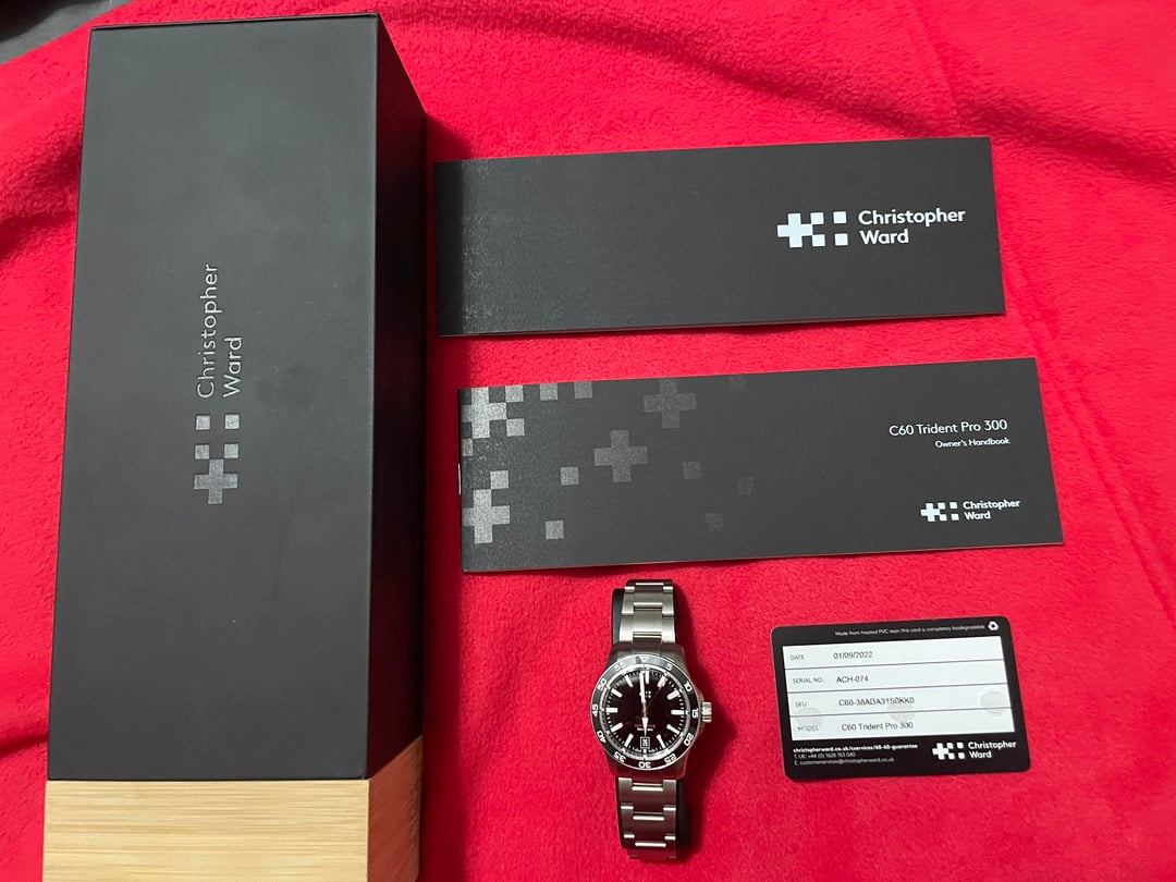 For sale: C60 Trident Pro 300 Condition: Pre-owned Includes: Original box and all papers Price: $700 Payment: PayPal F&F, Venmo Shipping: Free shipping within CONUS. Trades: No trades at this time Handbook: [https://www.christopherward.com/on/demandware.static/-/Library-Sites-cw-library/default/dw63ef6d0b/pdfs/Dive/c60-trident-pro-300-web-pages.pdf](https://www.christopherward.com/on/demandware.static/-/Library-Sites-cw-library/default/dw63ef6d0b/pdfs/Dive/c60-trident-pro-300-web-pages.pdf) Technical Information Calibre Sellita SW200-1 Case 316L stainless steel Diameter 38mm Weight 61g (38mm) Water resistance 30 ATM (300 metres) Vibrations 28,800 per hour (4Hz) Timing tolerance -20/+20 seconds per day Lume Super-LumiNova® Grade X1 BL C1