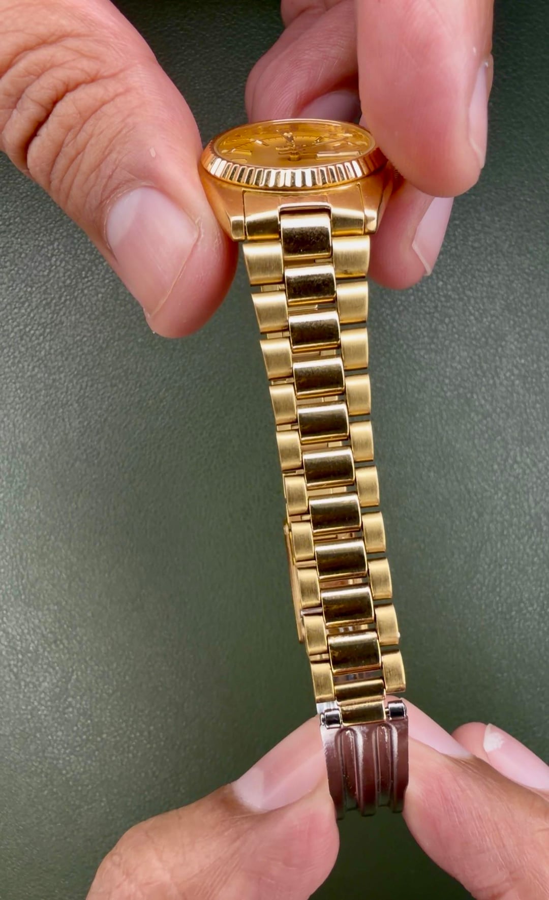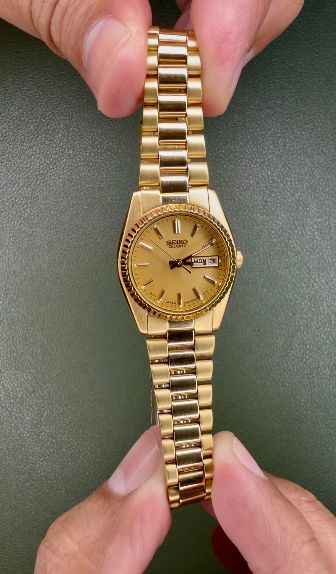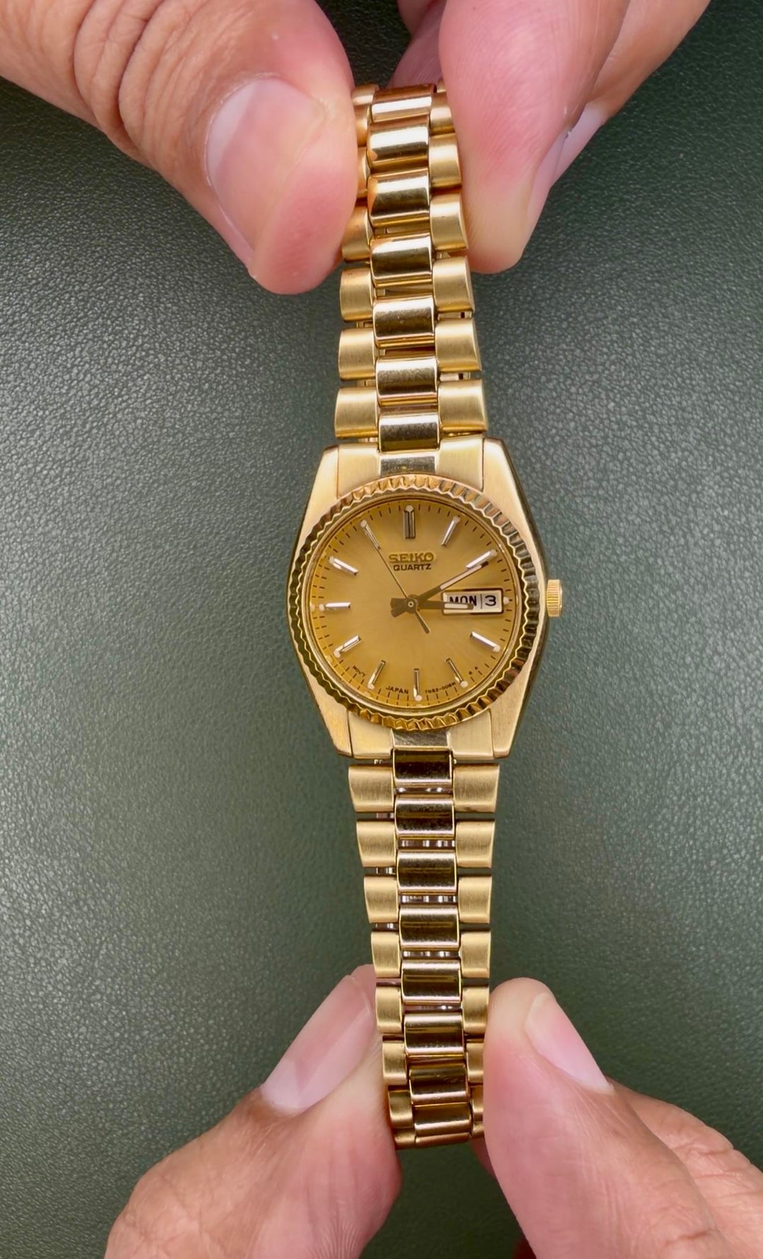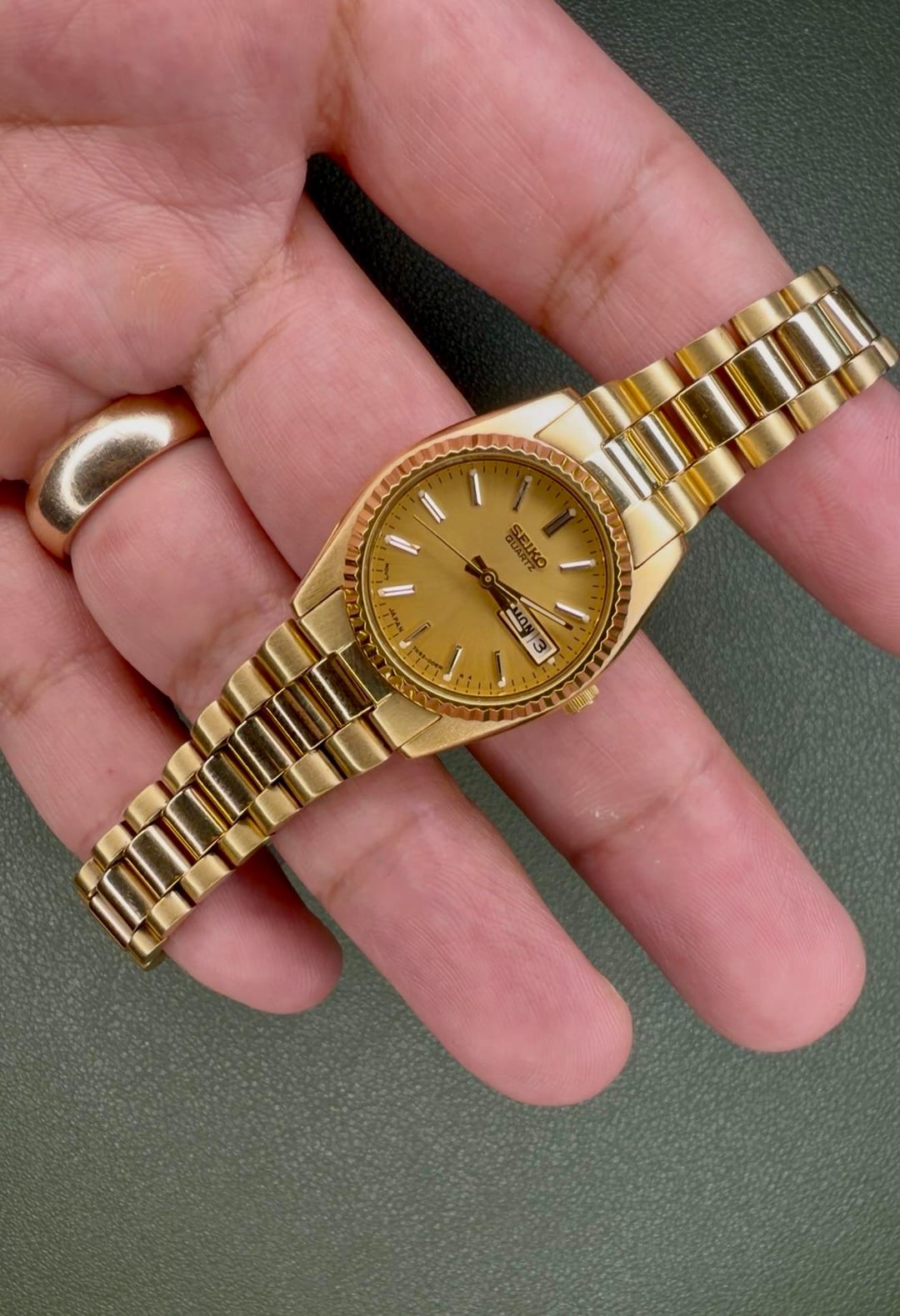 Ladies Seiko 7N83 in Gold -Details: This beautiful ladies Seiko comes in the gold colorway with a flutted bezel, day and date function, presidential style bracelet. For any lady looking to elevate their style, or as a gift! This piece is in pristine condition!Watch only. -$99 USD -Includes shipping (US). I accept Venmo, Zelle, CashApp, and PayPal (+4% if using G&S) -Case size: 23mm -Movement: Quartz -Timestamp: https://imgur.com/a/lmzoTyH -Location: Downtown Los Angeles -IG: @ColeccionDeLosSantos -TikTok: Chris.DeLosSantos