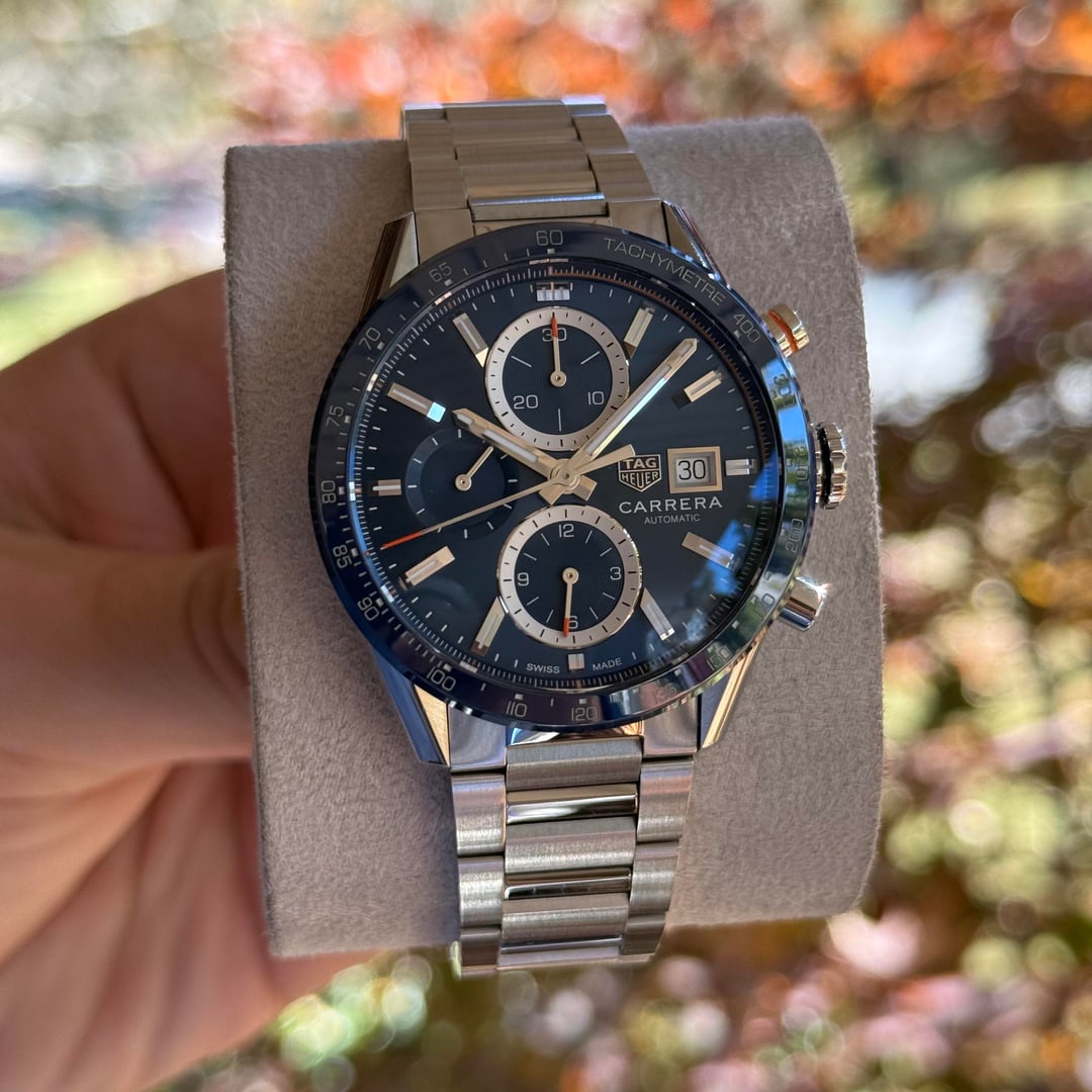 Tag Heuer Carrera CBM2112 BLUE Info: 41mm Case size. Caliber 16 movement. 42hour power reserve. 100m water resistance Included: Watch/ Boxes/ Booklet/ Authenticity paper Condition: Good preowned condition. Normal scratches on bracelet, some hairlines on case and AR. Runs well. Clean bezel. 7.75” max wrist size. Price: 💰1️⃣9️⃣9️⃣9️⃣ + ship cost *FIRM* Payment: Zelle/ wire Tagged photo: https://imgur.com/a/dIekVCD#U4Pn5MJ