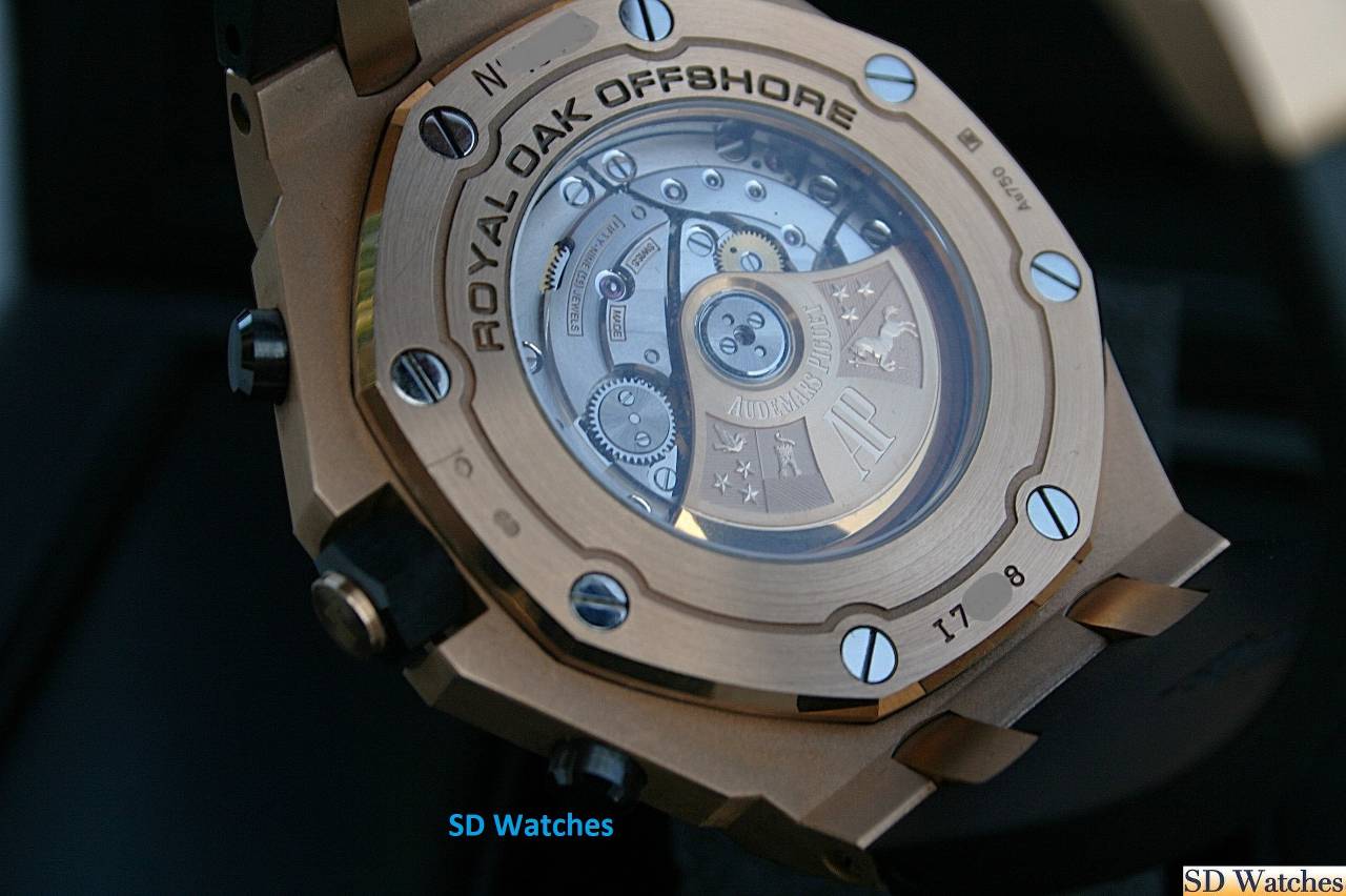 This AP has an impressive 42mm solid 18ct rose gold case and bezel, with black ceramic crown and pushers. It is fitted on a black rubber strap with a rose gold pin or tange buckle. The dial is a rose gold tone dial with the iconic Méga Tapisserie pattern, with black chronograph sub-dials & arabic numerals with a date window at three o'clock. Its automatic calibre 3126 / 3840 can be seen in all its glory behind its sapphire crystal-clear display back.