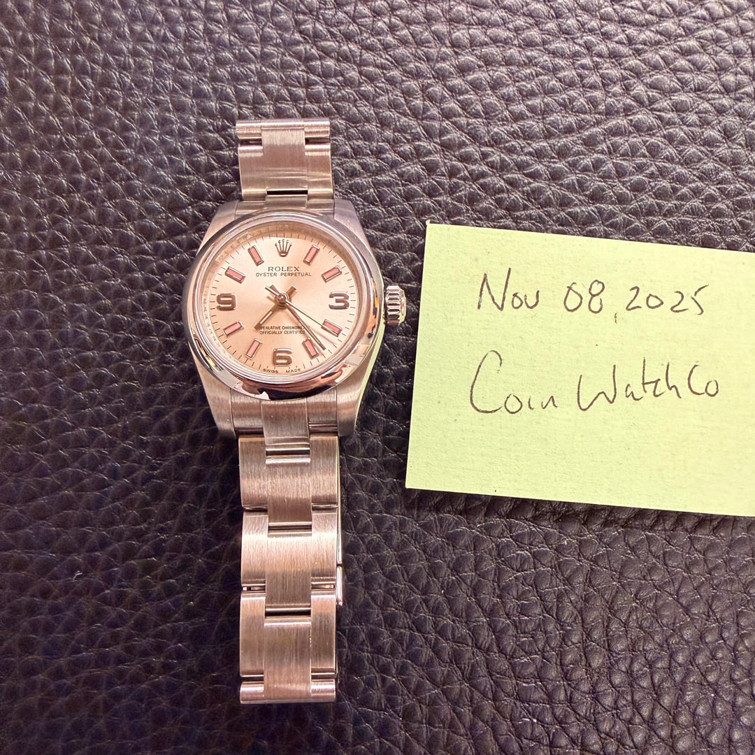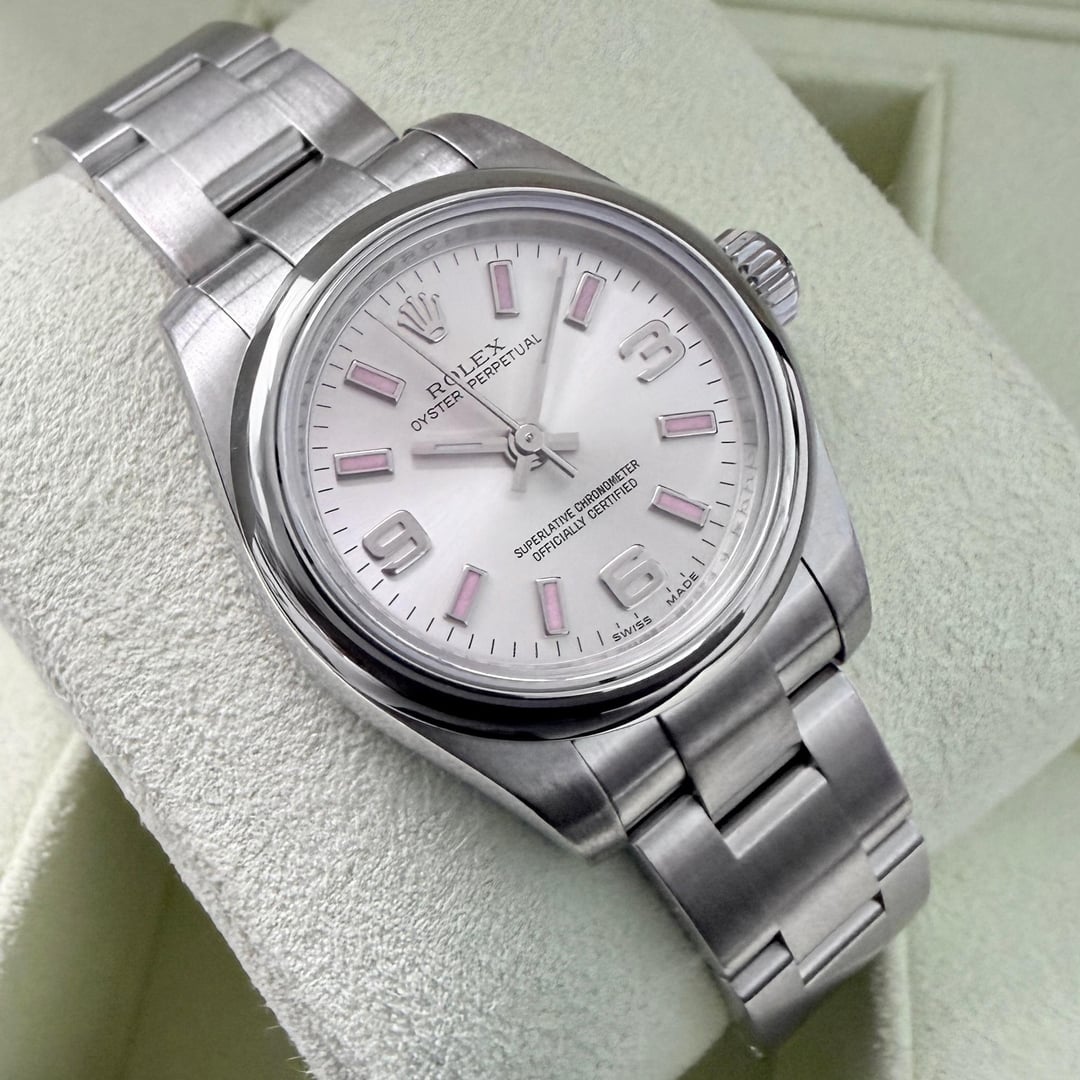 This Rolex Oyster Perpetual is a beautifully balanced ladies’ timepiece that blends modern style with classic Rolex reliability. It features a clean silver dial accented by subtle pink hour markers and the signature 3/6/9 Arabic numerals, giving it a fresh, contemporary look without being overly flashy. The proportions are elegant and easy to wear, making it a perfect everyday watch that transitions effortlessly from casual to dressy. This example has been professionally polished and fully serviced by our watchmaker, so it’s running perfectly and ready to be enjoyed right away. With its timeless design and comfortable Oyster bracelet, it’s a great choice for anyone looking for a refined, modern Rolex they can rely on for years to come. **THE DETAILS** **Case:** 26mm Stainless steel case which has been polished by our watchmaker back to factory original Rolex condition and is ready to be worn and enjoyed! **Dial/Hands:** Original Rolex silver dial with pink marks and is stunning condition and has aged to a pale cream colour. Original hands in attractive condition **Caseback:** Original stainless steel case which is in attractive condition **Movement:** Original Rolex automatic winding movement, which has been serviced by our watchmaker and is currently running +8 seconds per day **Bracelet/Strap:** Original Rolex stainless steel oyster bracelet which has been polished by our watchmaker back to factory original Rolex condition and is ready to be worn and enjoyed!. This watch will fit an 6.8 inch wrist. **Crystal:** Original sapphire in attractive condition. **Accessories:** The watch comes with box, booklets, outer box and original warranty papers dated 2011 Available for sale us 4380