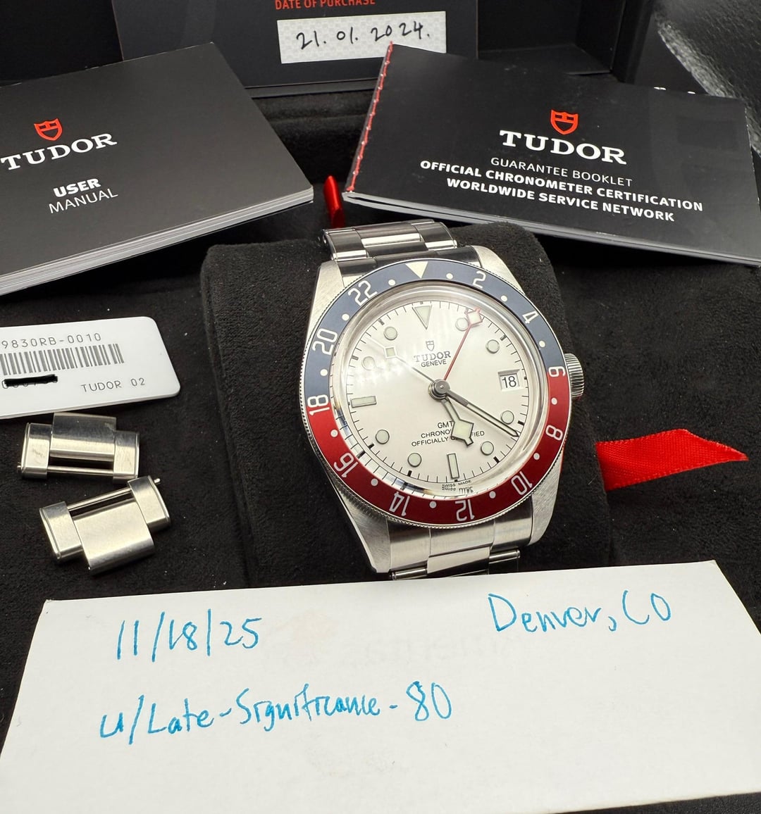 Tudor Black Bay GMT Opaline – 79830RB-0010(Full Set) Selling my 2024 Tudor Black Bay GMT Opaline (ref. 79830RB). Excellent condition, runs perfectly, and comes with the full set: tudor sleeve, outer box, inner box, warranty card, booklets, and all links. Specs: • 41mm stainless steel • Red/blue “Pepsi” GMT bezel • White opaline dial • In-house MT5652 movement • Sapphire crystal Great everyday watch with true GMT function and 70-hour power reserve. No issues, no surprises. Fully polished to look brand new. 💰 Price: $3,300 Shipped 🇺🇸 📍 Located in Denver, CO. Zelle, PayPal F&F, or Venmo payment only. Message me for more pics. Happy to FT or Video call!