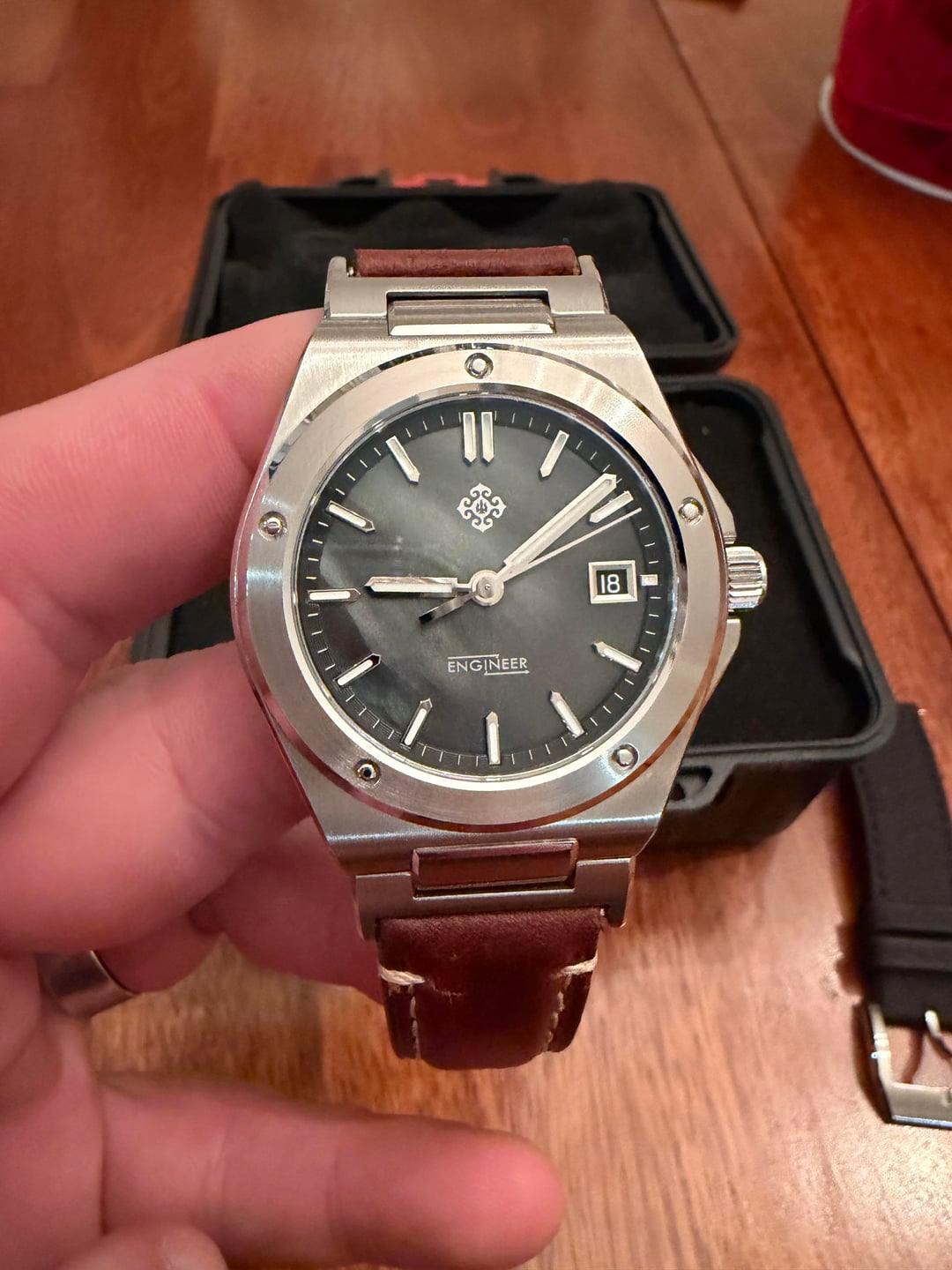 For sale IXDAO Engineer MOP dial comes on a leather strap with deployment clasp and the original sail cloth strap. It comes full kit box and papers with a pt5000 movement. 200$ shipped