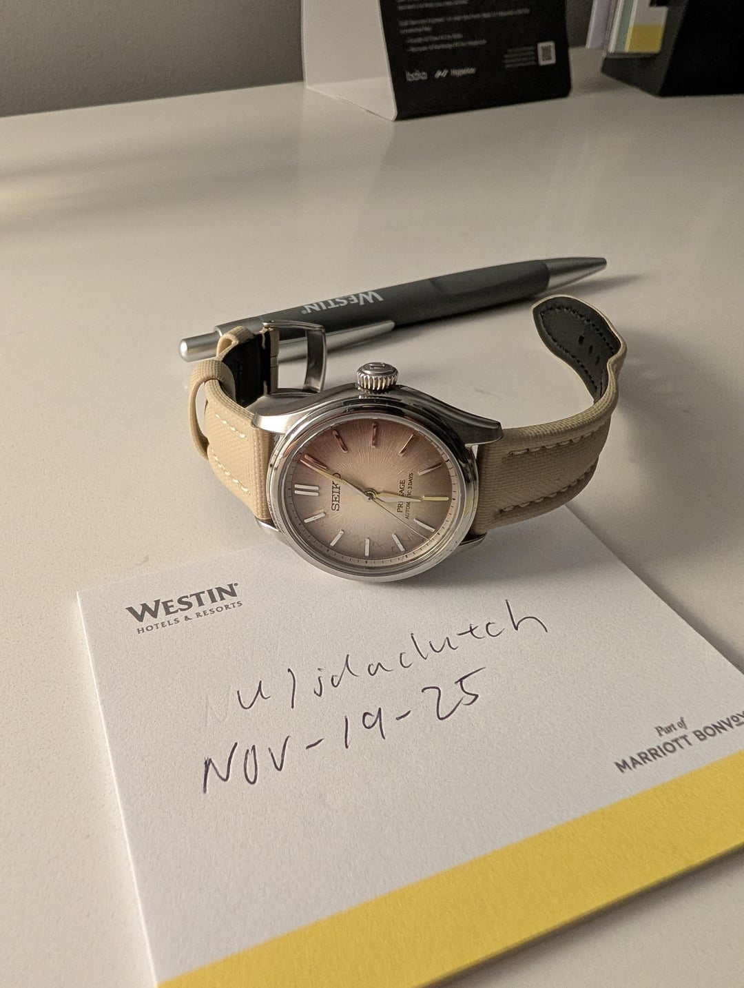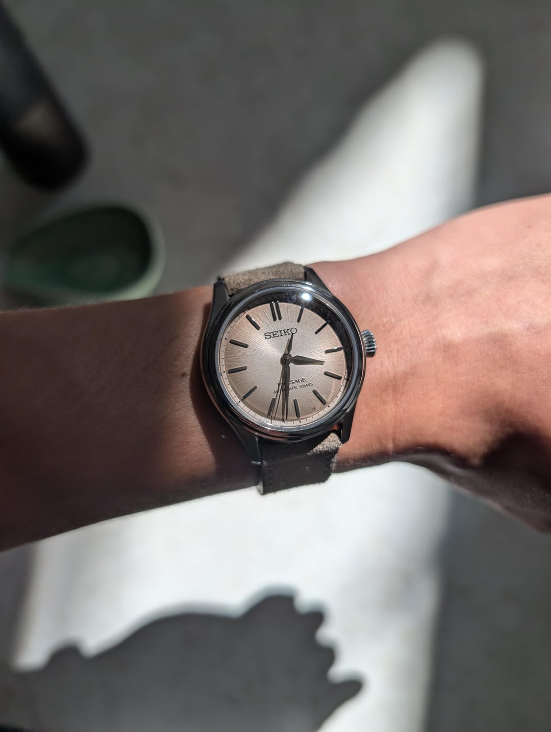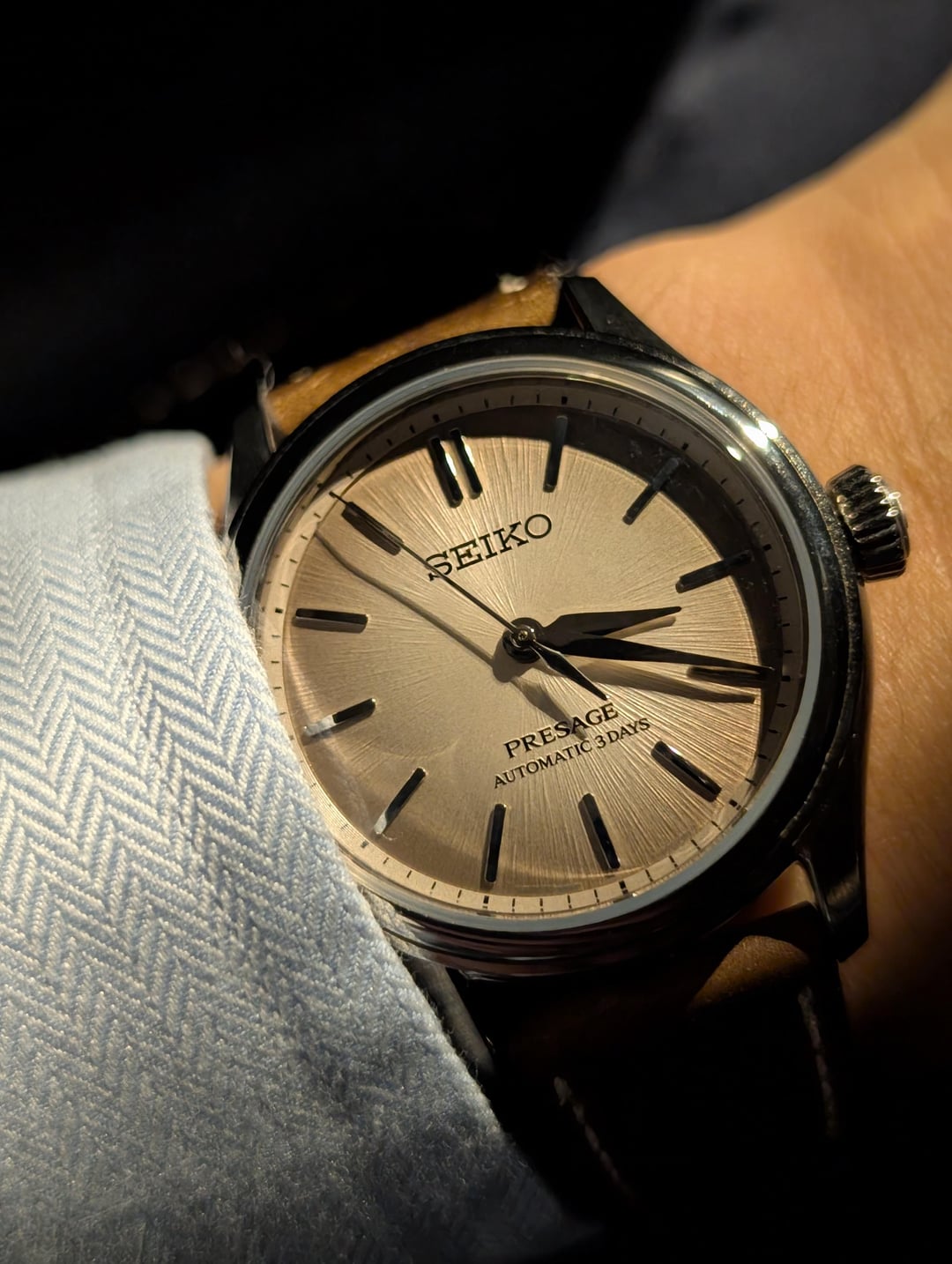 Hey WatchEx, It’s me again. In anticipation of the arrival of a new piece tomorrow... my new piece is finally arriving from Montreal Canada after 3 weeks in transit .... with my one in one out rule, I'm letting go of this beautiful Seiko Presage SPB523, a beautiful piece from the Classic Collection in the Seiko Presage line-up, one of three new additions featuring the signature Edo Silk inspired dial textures, in a brown. This piece needs a new home. My loss is your gain. Bought in person two months ago at Bic Camera in Tokyo — went all the way there so you don’t have to 😅 Worn daily with care, showing minimal wear. Movement is running amazingly: ±0–1s dial up, +7 dial down, –3 at 3 o’clock up overnight (YMMV). More details on the model: 👉 First Look: Seiko Presage Classic SPB521 / SPB523 / SPB524: https://monochrome-watches.com/seiko-presage-classic-series-edo-silk-36mm-spb521-spb523-spb524-review-price/ Asking: $650 (reduced from $725- 675) shipped within CONUS Save a few hundred + tax + import fees. I believe this is the only SPB523 currently available on the U.S. secondhand market. Includes: Full kit (box, papers, bracelet). Bracelet has light wear — I’m not a bracelet guy. Straps in photos not included, just to show off how versatile this “strap monster” is. Plenty of factory warranty left (bought it in Sept). Please comment before DMing — happy to answer any questions! --- Specs Case: 36mm with a lug to lug of 41.4mm, stainless steel, domed sapphire and sapphire see thru caseback as well, 100m WR Dial: Silk-textured light brown “Fushi-iro” (SPB523/SARX131) Unadvertised slight curved/bented second hands, to avoid minimizes parallax errors. Similar to kurono's, which is pretty cool Seiko diamond shield (Seiko's version of scratch resistance harden coating) Movement: NEW 6R51 no-date, 72h power reserve, hacking seconds Bracelet: 7-link stainless steel, polished/brushed, push-button Have a few planned work trips, so local pick up in downtown Detroit at the end of this month and early next month by the Rencen is a possibility. Otherwise, the watch will be shipped out of North Dallas Texas.