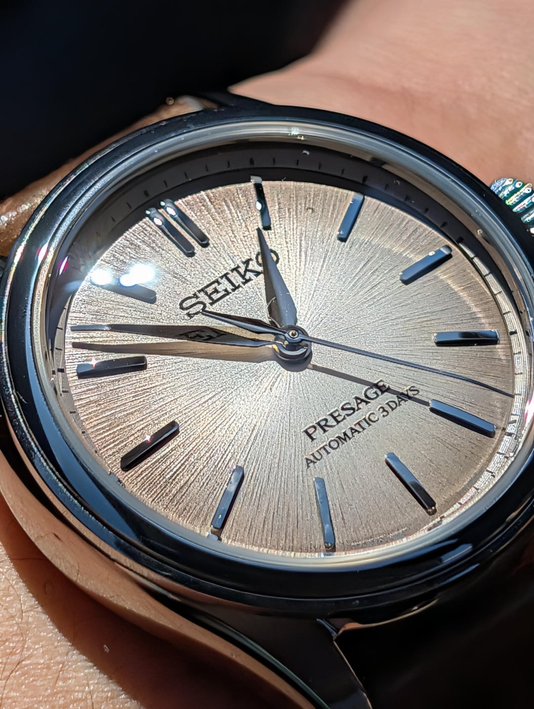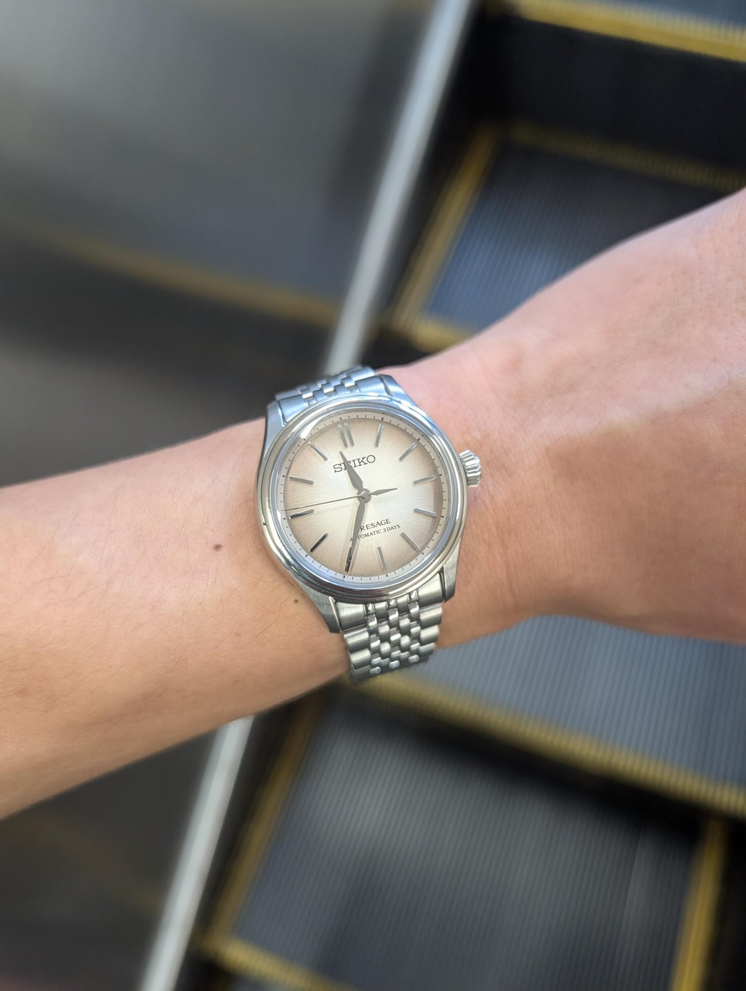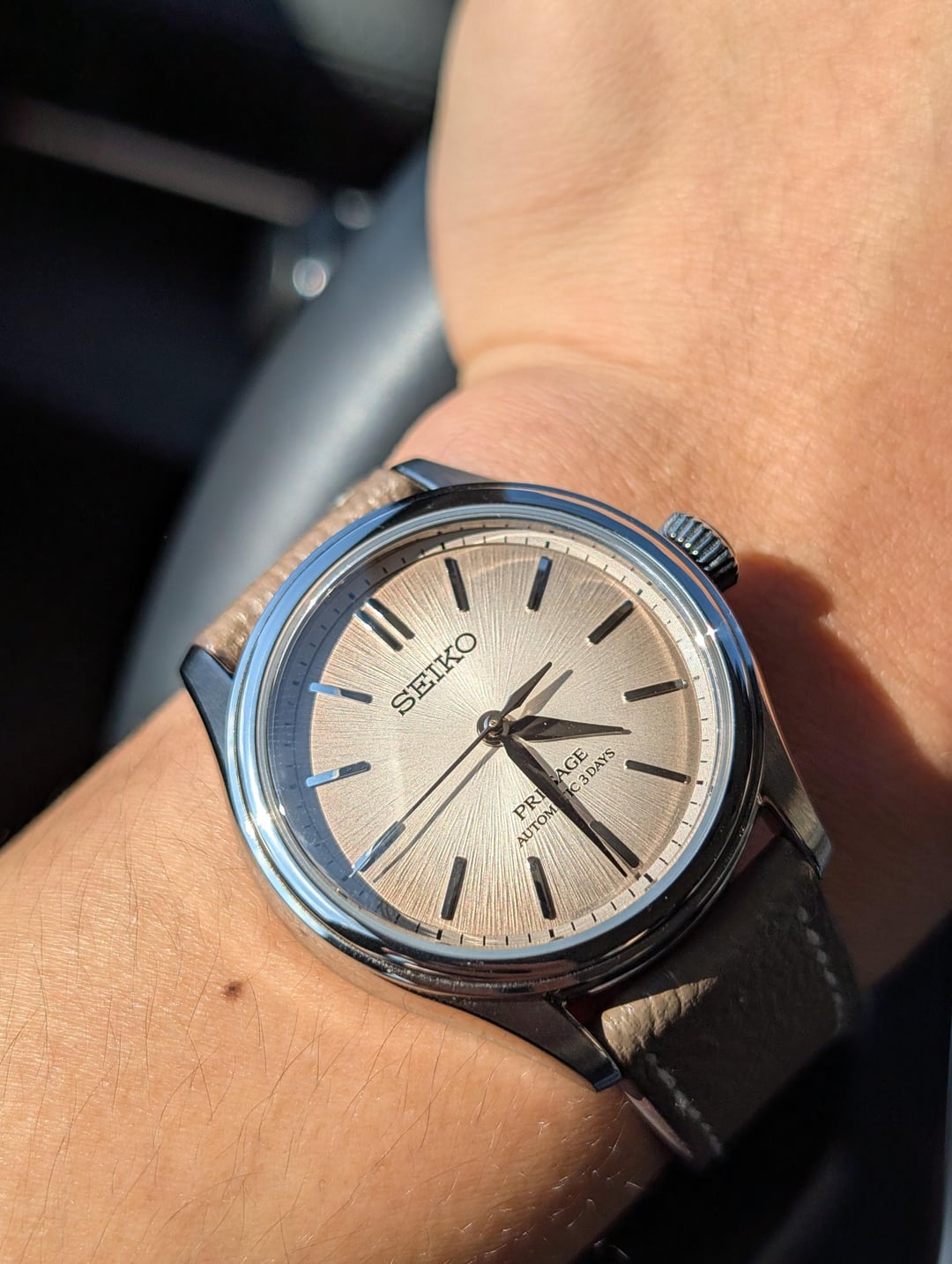 Hey WatchEx, It’s me again. In anticipation of the arrival of a new piece tomorrow... my new piece is finally arriving from Montreal Canada after 3 weeks in transit .... with my one in one out rule, I'm letting go of this beautiful Seiko Presage SPB523, a beautiful piece from the Classic Collection in the Seiko Presage line-up, one of three new additions featuring the signature Edo Silk inspired dial textures, in a brown. This piece needs a new home. My loss is your gain. Bought in person two months ago at Bic Camera in Tokyo — went all the way there so you don’t have to 😅 Worn daily with care, showing minimal wear. Movement is running amazingly: ±0–1s dial up, +7 dial down, –3 at 3 o’clock up overnight (YMMV). More details on the model: 👉 First Look: Seiko Presage Classic SPB521 / SPB523 / SPB524: https://monochrome-watches.com/seiko-presage-classic-series-edo-silk-36mm-spb521-spb523-spb524-review-price/ Asking: $650 (reduced from $725- 675) shipped within CONUS Save a few hundred + tax + import fees. I believe this is the only SPB523 currently available on the U.S. secondhand market. Includes: Full kit (box, papers, bracelet). Bracelet has light wear — I’m not a bracelet guy. Straps in photos not included, just to show off how versatile this “strap monster” is. Plenty of factory warranty left (bought it in Sept). Please comment before DMing — happy to answer any questions! --- Specs Case: 36mm with a lug to lug of 41.4mm, stainless steel, domed sapphire and sapphire see thru caseback as well, 100m WR Dial: Silk-textured light brown “Fushi-iro” (SPB523/SARX131) Unadvertised slight curved/bented second hands, to avoid minimizes parallax errors. Similar to kurono's, which is pretty cool Seiko diamond shield (Seiko's version of scratch resistance harden coating) Movement: NEW 6R51 no-date, 72h power reserve, hacking seconds Bracelet: 7-link stainless steel, polished/brushed, push-button Have a few planned work trips, so local pick up in downtown Detroit at the end of this month and early next month by the Rencen is a possibility. Otherwise, the watch will be shipped out of North Dallas Texas.
