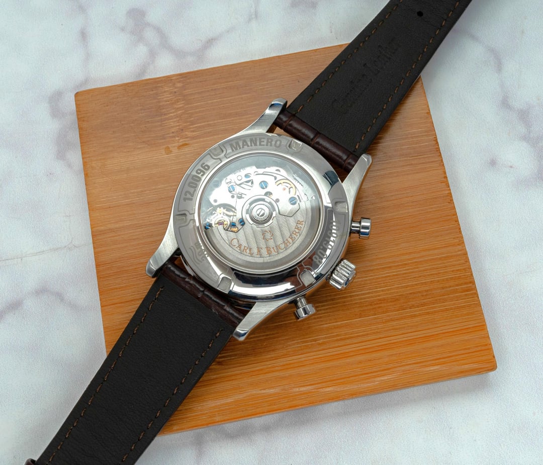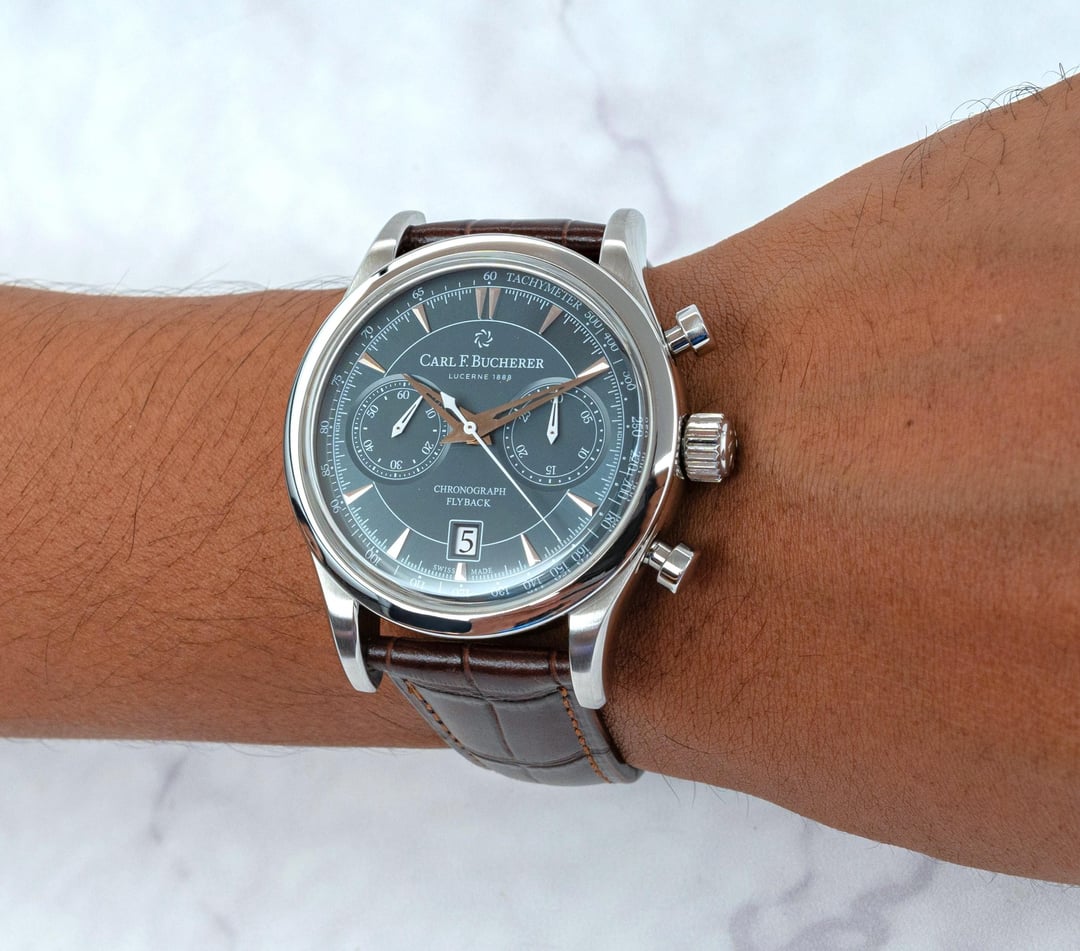 A Carl F Bucherer Manero automatic flyback chronograph watch in good condition. Stunning Bluish Grey sunburst dial with two register chronograph subdials. The dial has some micro dot patina on it. Sharp hands. Robust round shaped case. Very solid build quality. Sapphire crystal. Clear exhibition caseback showcasing the beautiful movement. Working fine and keeping time. Comes an aftermarket leather strap, signed original deployant clasp. Signed crown. Creative design makes it a conversation piece. Overall a great piece at a good price. Pictures don't do justice to this beauty, it should be appreciated upfront to experience at full measure. Official website for this watch: [https://www.carl-f-bucherer.com/en/watches/manero-flyback-00-10919-08-93-01](https://www.carl-f-bucherer.com/en/watches/manero-flyback-00-10919-08-93-01) PRICE: $2499 USD via Paypal, Wise, Crypto. FREE 5 day DHL shipping worldwide. I have a good number of exchanges here for a safe transaction. Check my Instagram: [https://instagram.com/hour.lust](https://instagram.com/hour.lust) * Reference Number: 00.10919.08.93.01 * Case size: 43 mm (w/crown) * Lug to lug: 53 mm * Lug size: 22 mm * Thickness: 15 mm * Movement: CFB 1970 Automatic chronograph Pics: [https://imgur.com/a/58nnNV0](https://imgur.com/a/58nnNV0) TS: [https://imgur.com/a/Ra3pxne](https://imgur.com/a/Ra3pxne)