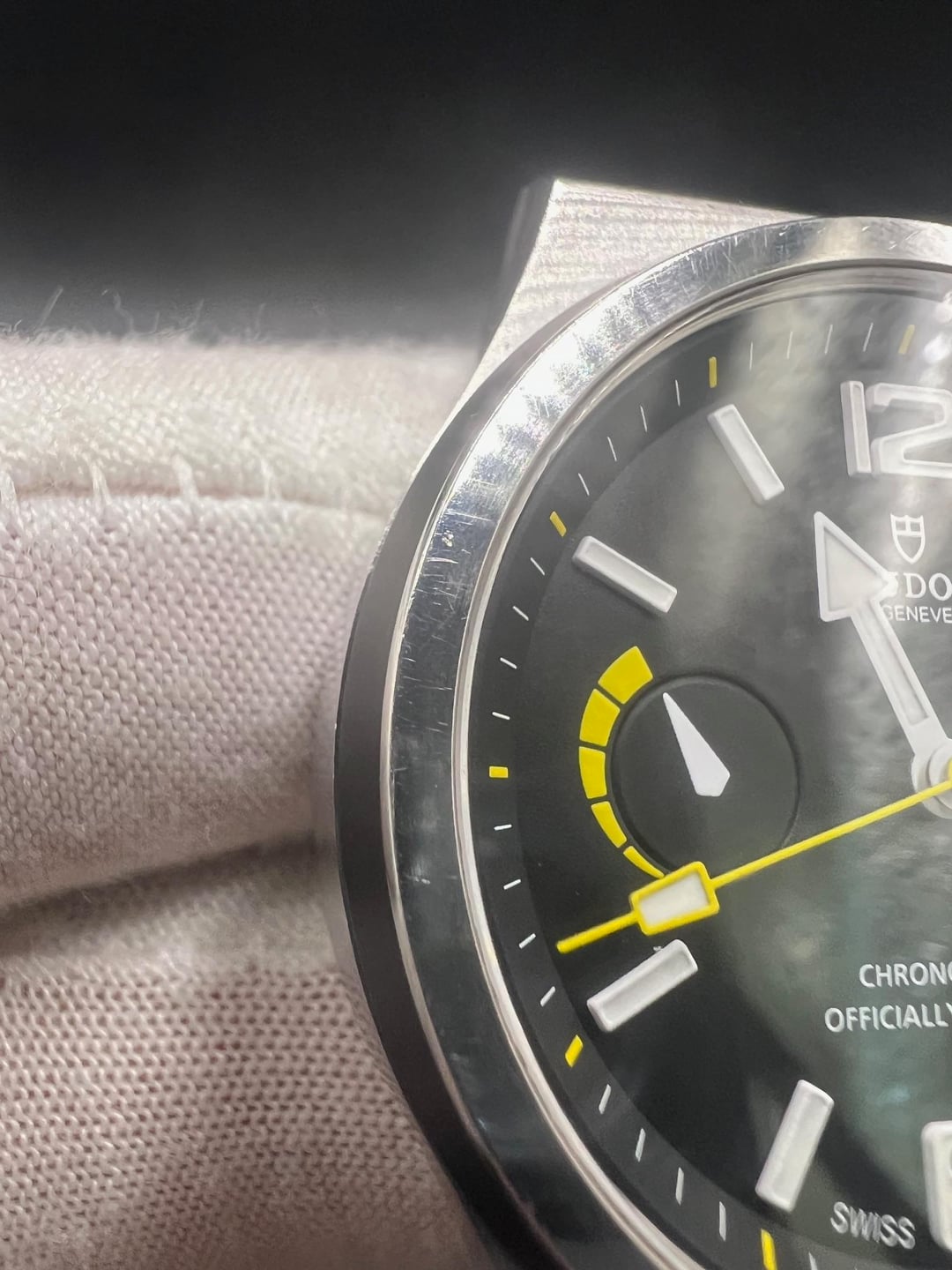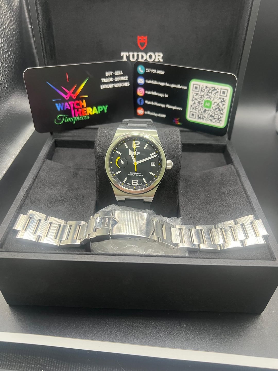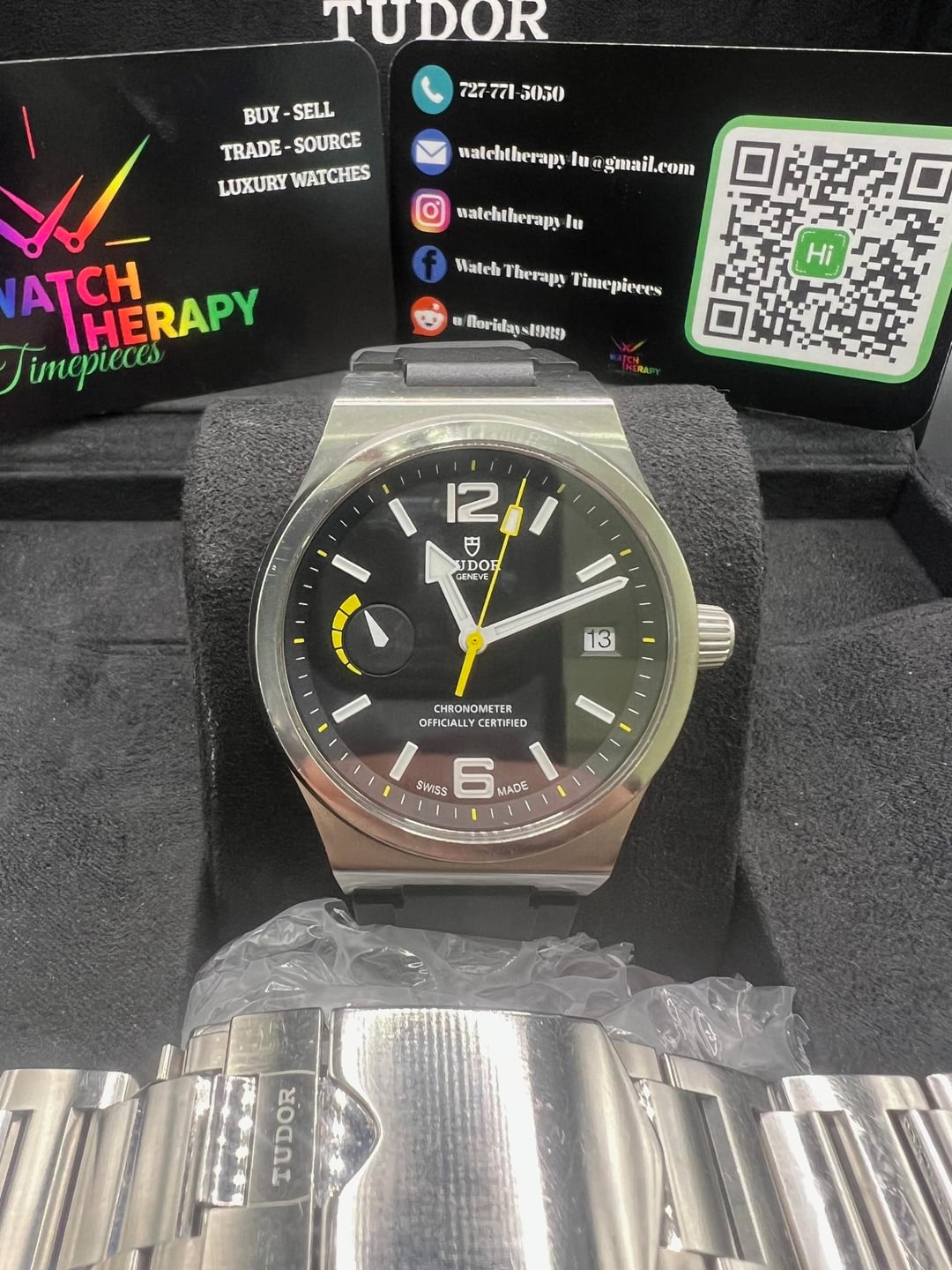 **F/S: Tudor North Flag Ref# 91210N** **Shipping from Florida** **Discontinued model. Hard to come by especially with the bracelet. Watch Only!! I don’t know the year because I don’t have the original warranty card. I wanted to make that’s clear before you ask, “What year it is”? Made 2015-2021** **Specs:** **\*** Beautiful matte black dial w/yellow second hand and power gauge \* Automatic self-winding \* 40mm \* 3 link steel Bracelet \* 100M Water Resistance \* 70-hour power reserve \* MT5621 COSC movement **Includes**: Watch only with bracelet and AM rubber strap, **No box**. **Condition:** Pre-owned condition, with hairlines ang bytes, throughout. A good polish on this and it’ll be like new. **Bracelet has 8 ½ links**. This will someone’s new daily workhorse. Pictures are an accurate representation of the condition. Crystal is clean. Running Fantastic-see pic. **Price: $2,699.00 + Insured shipping to your local FedEx for pick-up in Con US**. I am also open to a face-to-face public transaction in or around the Tampa Florida Region, within reason. I have many strong and viable references within Reddit and from Buy/Sell/Trade Watch Facebook groups. Always willing to jump on a call or meeting link to show you the watch. Thank you and please reach out if you have any questions or concerns. Florida residents may be subject to sales tax w/o a valid reseller cert. ***No Trades, TY*** L**ocation**: Tampa Florida **Payment:** Zelle or Wire Timestamp: [https://imgur.com/a/LN0a6m0](https://imgur.com/a/LN0a6m0) FB: Watch Therapy Timepieces IG: [@watchtherapy4u](https://www.reddit.com/u/watchtherapy4u/)