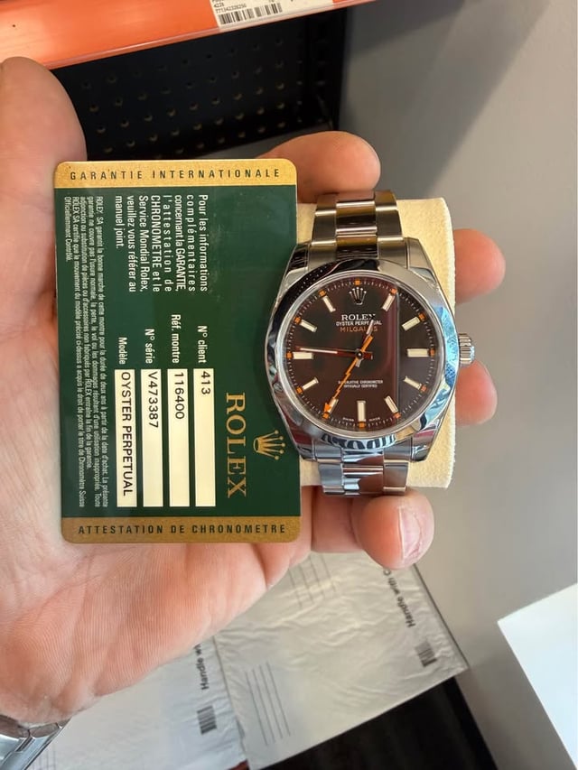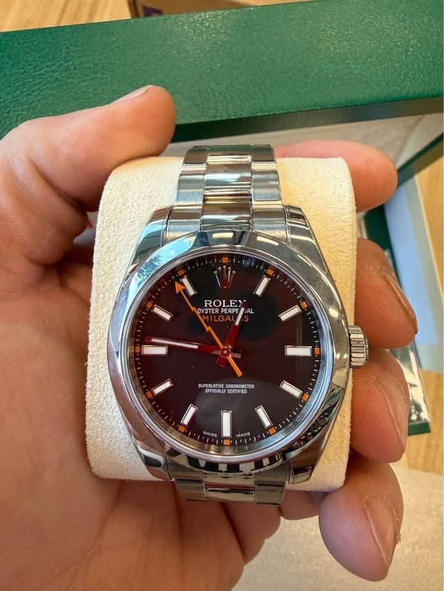 [TIMESTAMP](https://i.imgur.com/HJbR9jX.jpeg) Mint condition w/ protective stickers in place ( not oem) **Specs:** * Model: Rolex Milgauss * Reference: **116400** * Year: 2010 * Dial: Black w/ orange lightning-bolt seconds hand * Bracelet: Oyster – full links included * Set: Box + Card * Condition: Excellent overall, no major scratches or dings. Really hard to see anything on this guy ! * **PRICE $8,000** \+ Ship Firm. I’m located in **Prosper, TX** and can meet locally. Payment accepted: **Wire or Zelle**. Plenty of references available.