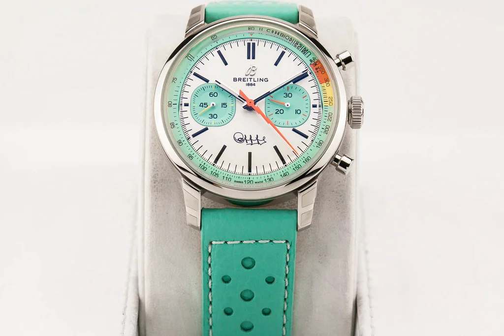 Up for sale is an unworn condition Breitling Top Time B01 Fausto Coppi 41mm White Dial on Turquoise Leather Strap, reference # AB01768A1A1X1. It comes complete with all boxes, papers, booklet, hang tag and Breitling Warranty Card dated July 2025. One of 750 pieces.