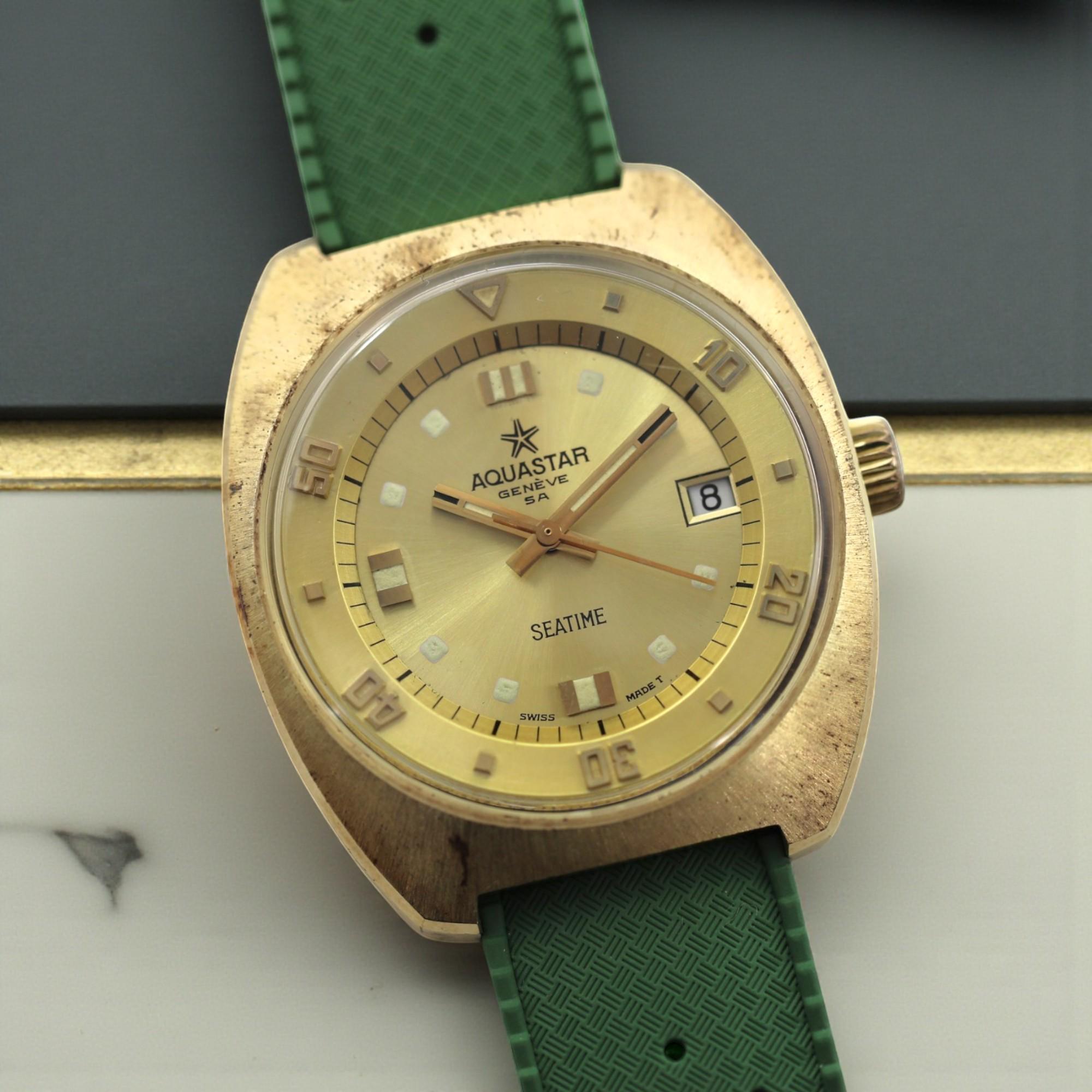 Aquastar was founded in 1962 as a subsidiary of JeanRichard SA, an established Swiss manufacturer at the time. Aquastar used the backbone of JeanRichard to quickly deliver to market in the early 1960s some of the most capable water sport watches of the era. This watch has an internal rotating bezel that is operated by the non-screw down crown. Brand: Aquastar Model: Seatime Reference: 1000 Year: Circa 1970 Case: 40mm Box & papers: No Location: Los Angeles Price: ONLY $999! Web/IG: [keepiece.co](http://keepiece.co/) Pictures/Timestamp: [https://imgur.com/a/lHBjcVz](https://imgur.com/a/lHBjcVz) CONDITION & SERVICING \- The case in excellent like new old stock condition. The case has started to take on a patina. \- Hands and markers are matching. \- Recently serviced by our watchmaker.