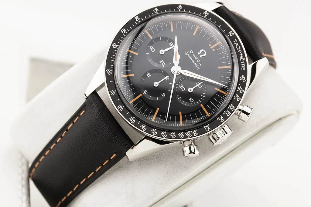 Up for sale is a brand new Omega Speedmaster 3861 Anniversary Series 39.7mm First Omega in Space ( FOIS ) on Black Leather Strap, reference # 310.32.40.50.06.001. It comes complete with all boxes, papers, booklets, hang tag, and Omega Warranty Card dated September 2025.