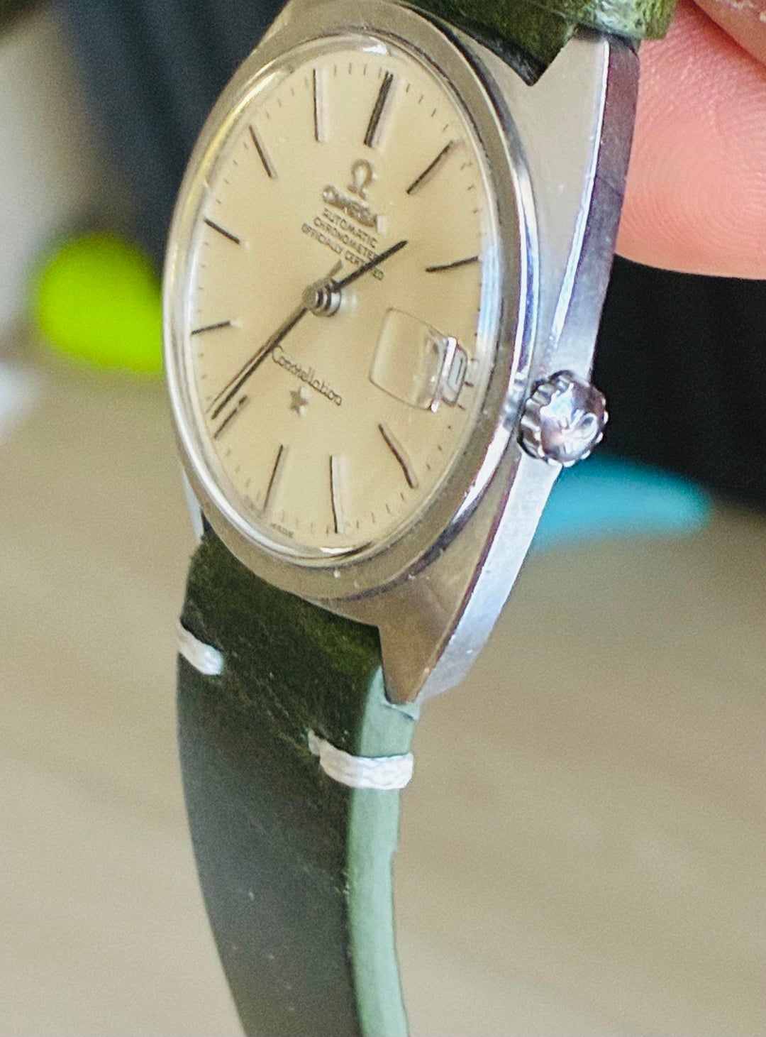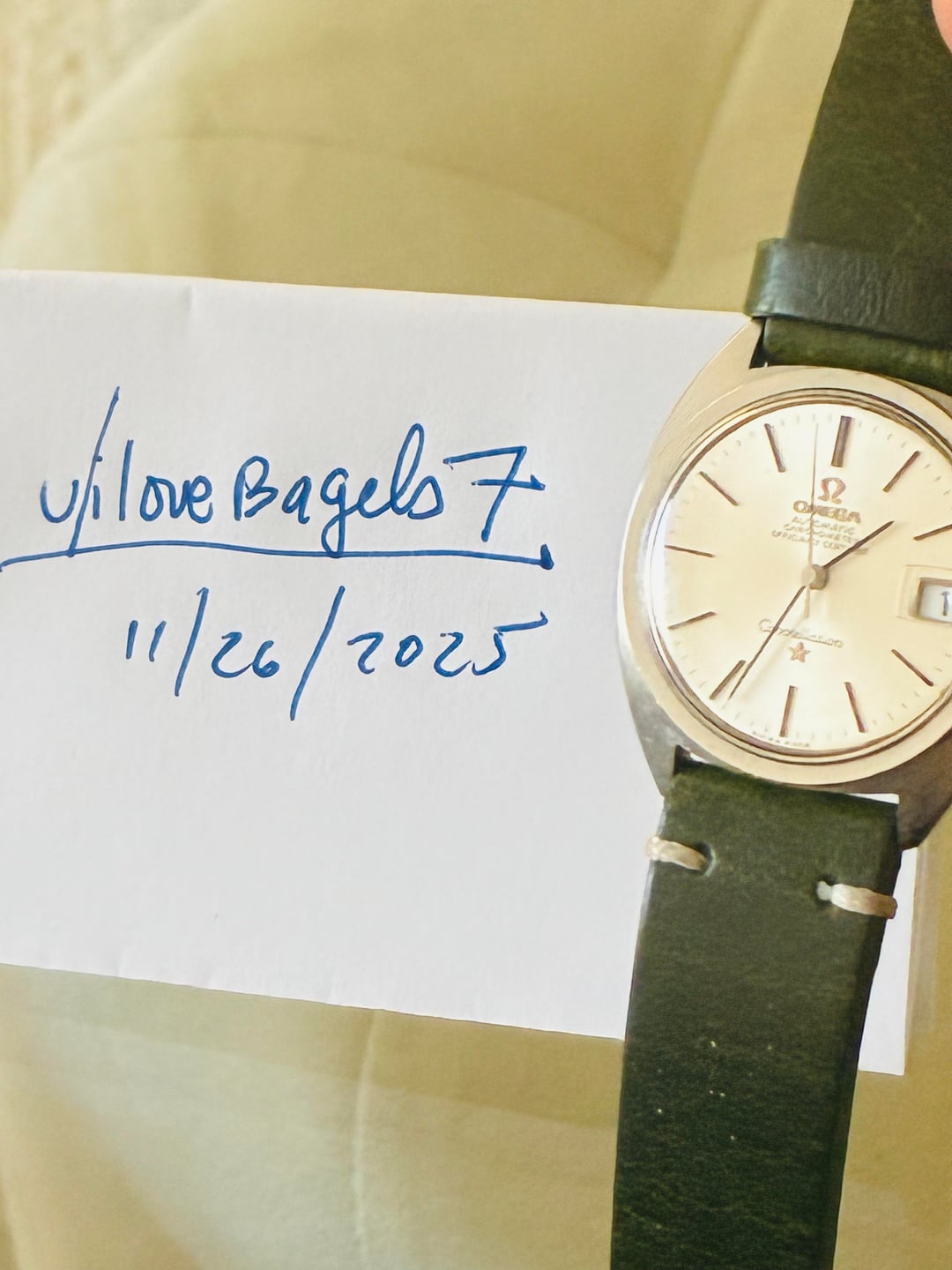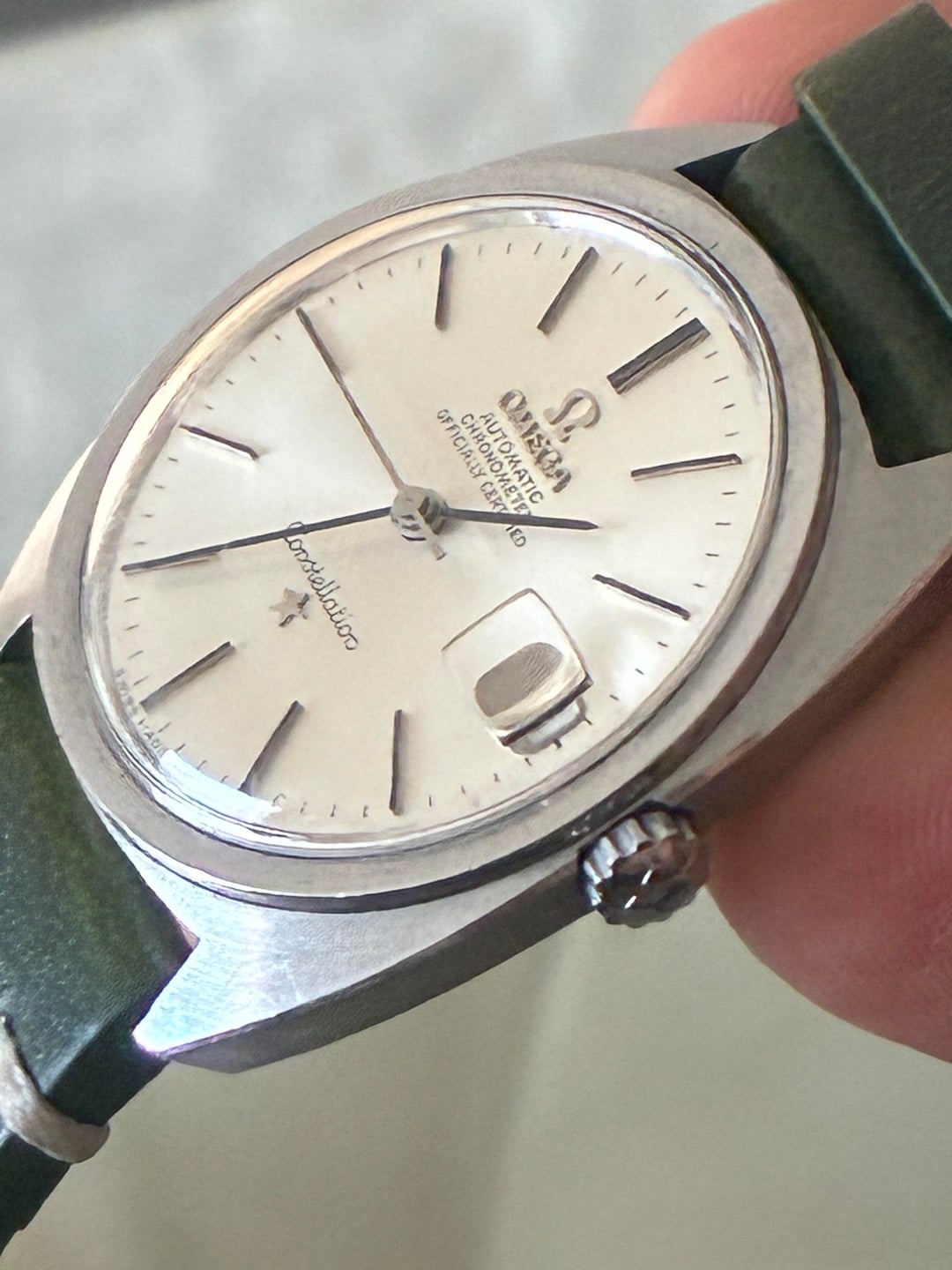 Omega Constellation Estate Sale Men's Vintage Watch, 1960s . Estate sale piece CleanRuns great Rose gold movement runs great Cal 631Appears to be an unpolished case 35.5-36 crown Estate purchase from a few years back New Hunter green strap 19mm Asking $1100 shipped . Zelle Venmo Wire