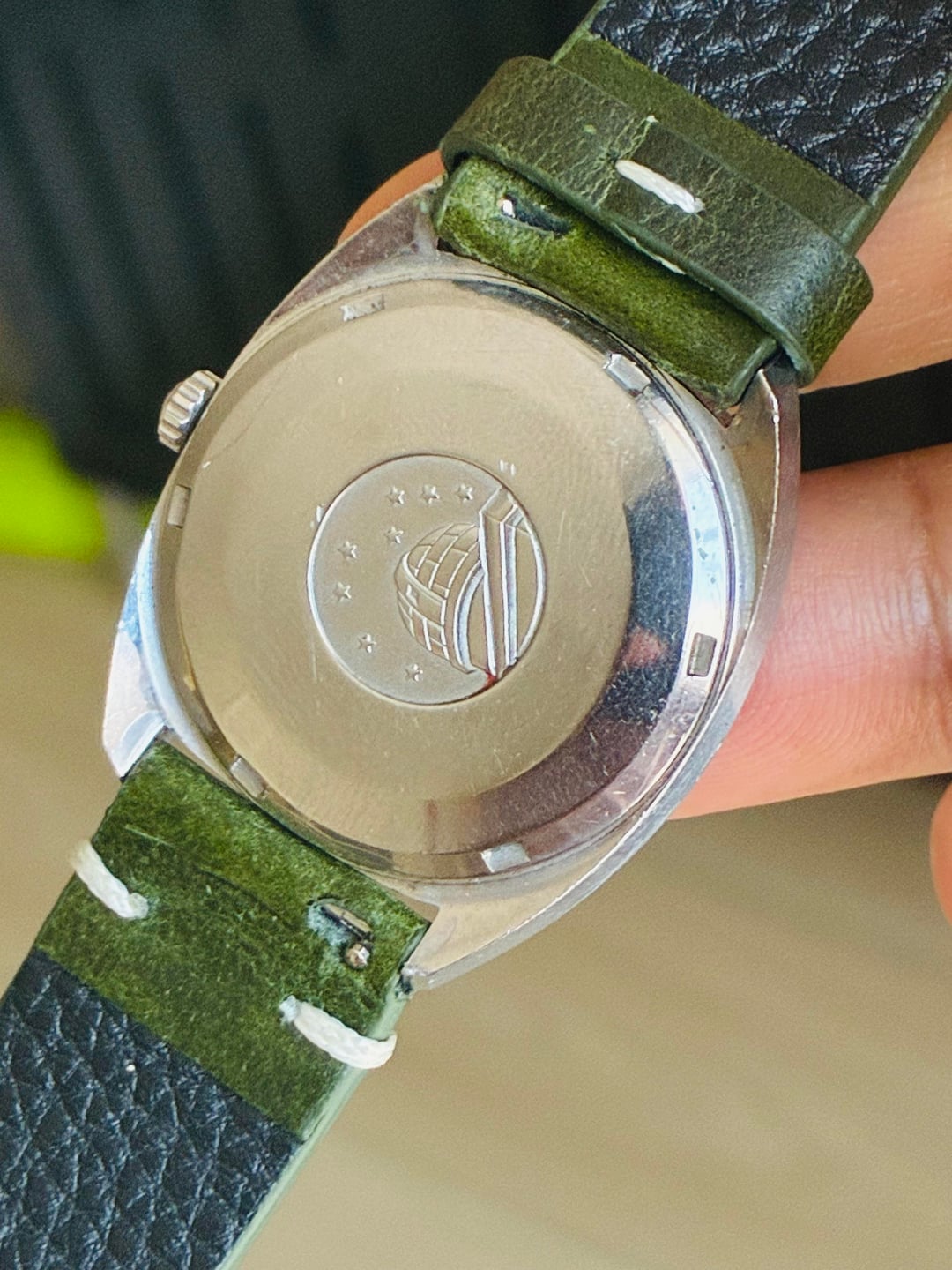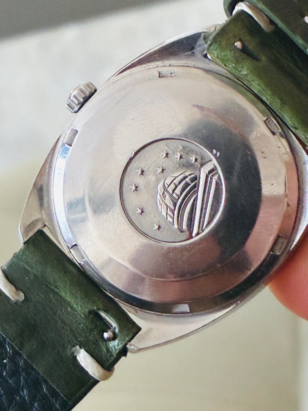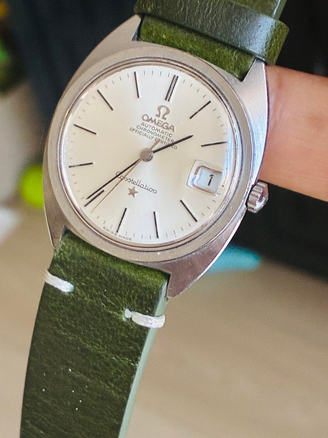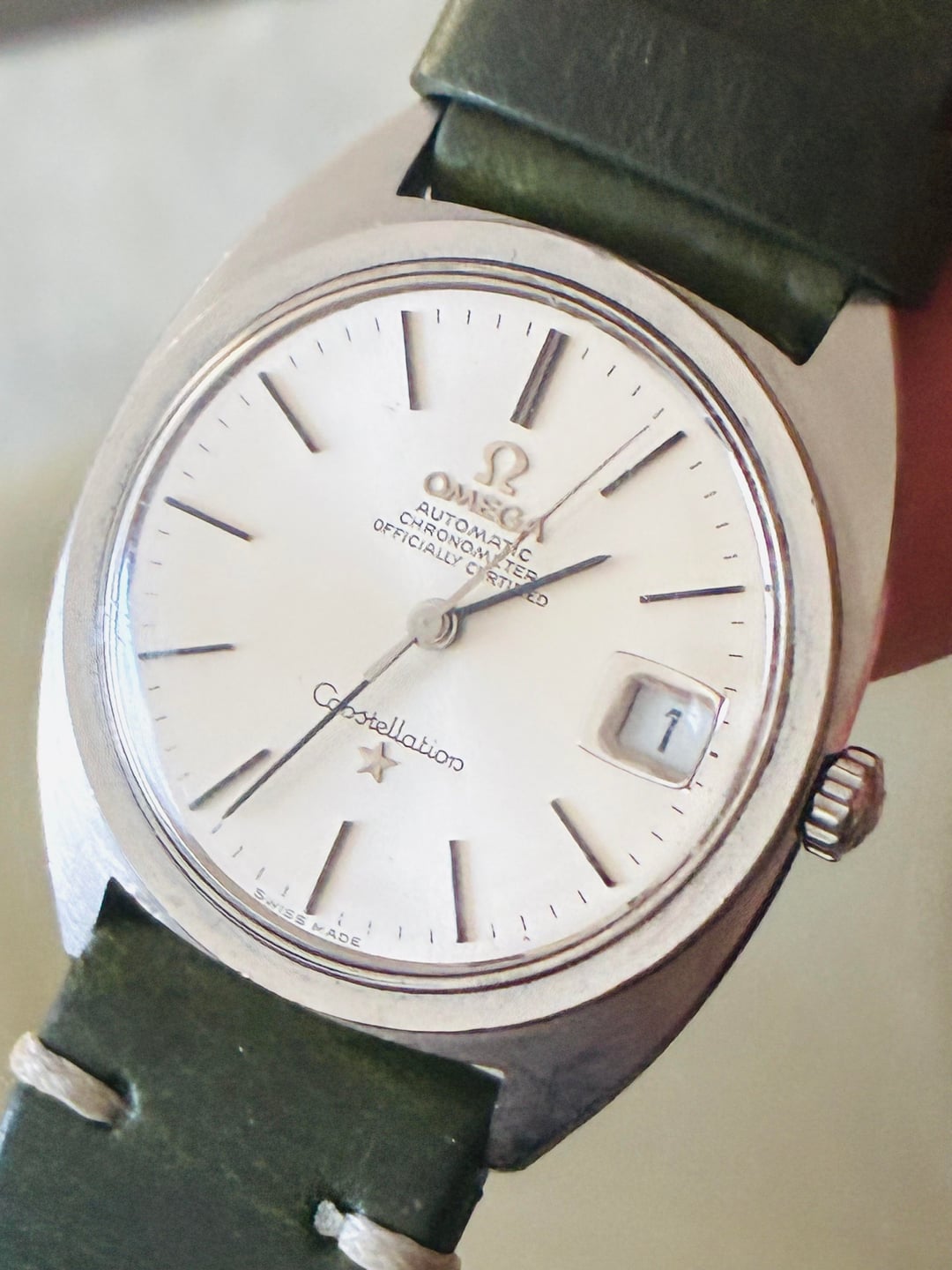 Omega Constellation Estate Sale Men's Vintage Watch, 1960s . Estate sale piece CleanRuns great Rose gold movement runs great Cal 631Appears to be an unpolished case 35.5-36 crown Estate purchase from a few years back New Hunter green strap 19mm Asking $1100 shipped . Zelle Venmo Wire