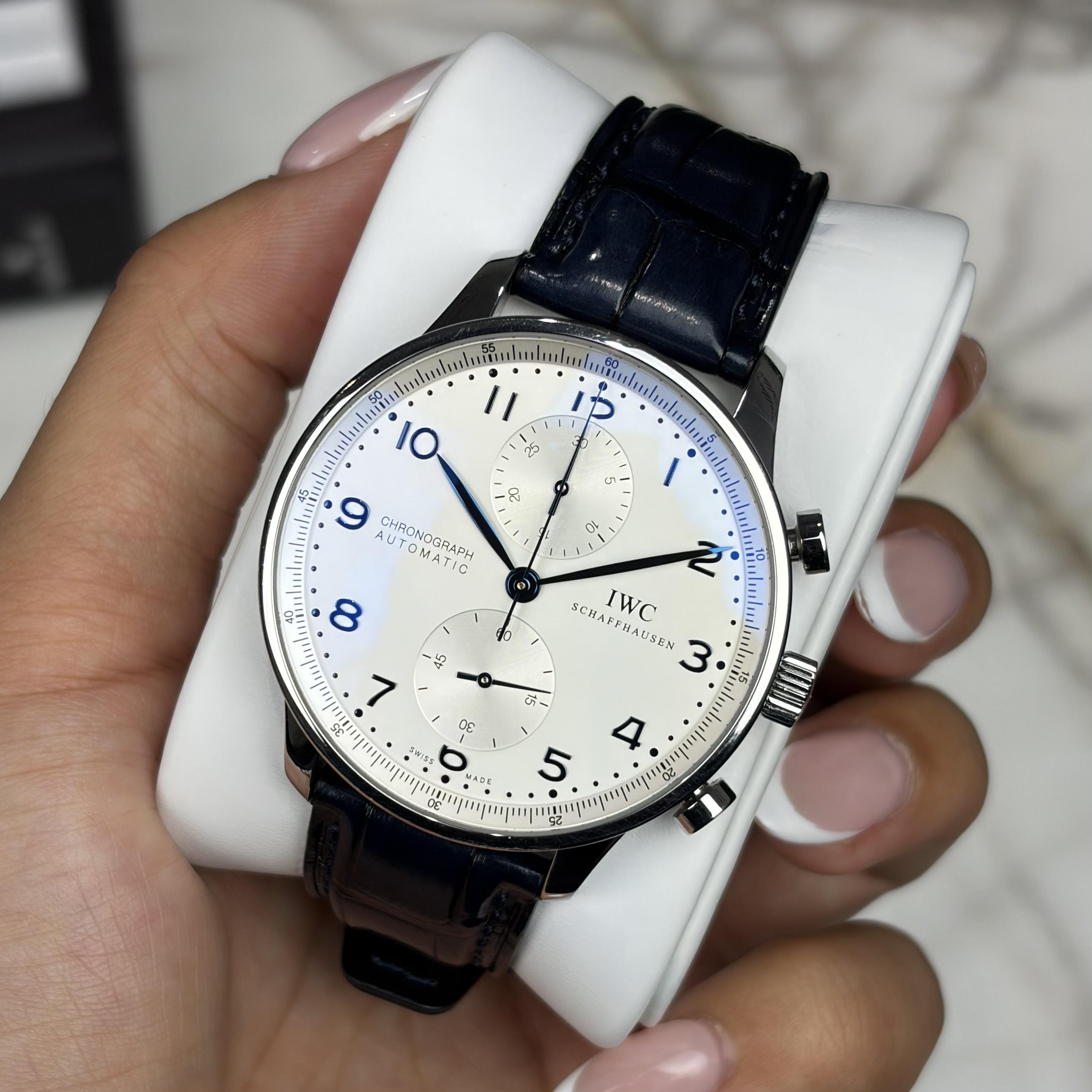Timestamp: https://imgur.com/a/802LcGn Album: https://imgur.com/a/M2r2FNb ________________________________________________________________________________________ The IWC Portuguese Chronograph IW371446 (2018) showcases the brand’s iconic dress-sport design with a clean silver dial, elegant applied numerals, and striking blue feuille hands. Its balanced bicompax layout and polished stainless steel case give it a timeless, refined presence on the wrist. This example is in mint condition with extremely light signs of wear on bezel and lugs and includes the original box and papers, making it an excellent addition for collectors and enthusiasts alike.   This watch measures 41mm diameter, 47mm lug to lug, and 13.1mm thick.   **Condition:** Mint condition with extremely light signs of wear on bezel and lugs. See pictures for the most accurate representation of condition.   **Includes:** This example comes as a complete set with its original box, papers & accessories. _________________________________________________________________________________________ **Price:** **4,000**   **Shipping:** Free shipping to US addresses! I'm willing to ship internationally at an additional cost to the buyer. *Local pickup available at our Scottsdale, AZ office. Sales tax may apply.*   **Payment:** Wire, Zelle, Crypto, or CC (with 4% fee).   **Trades:** Yes, open to trades up or down for modern Rolex, AP, or Patek Philippe.   Thank you for your consideration and feel free to reach out with any questions! -Aneisa