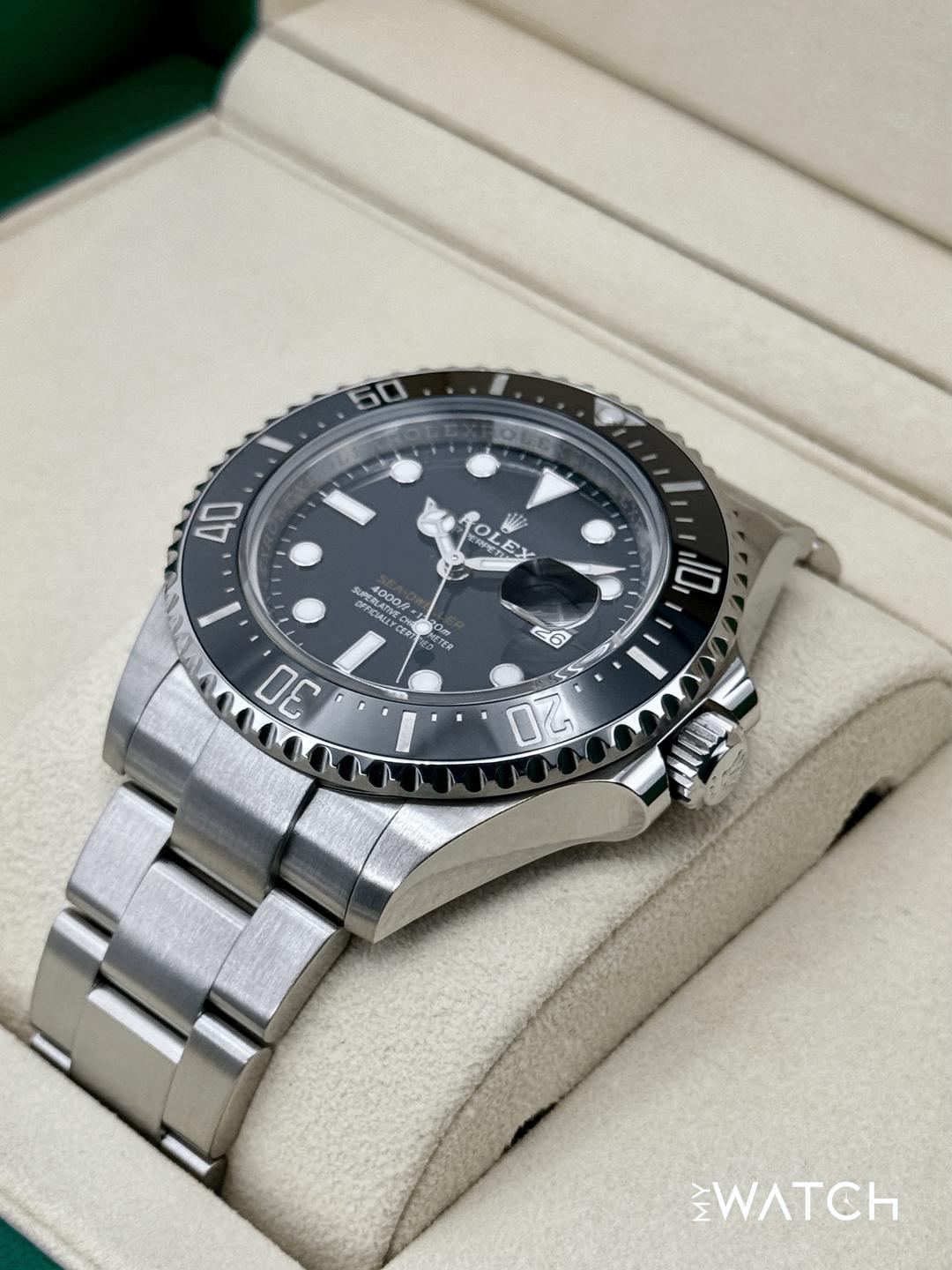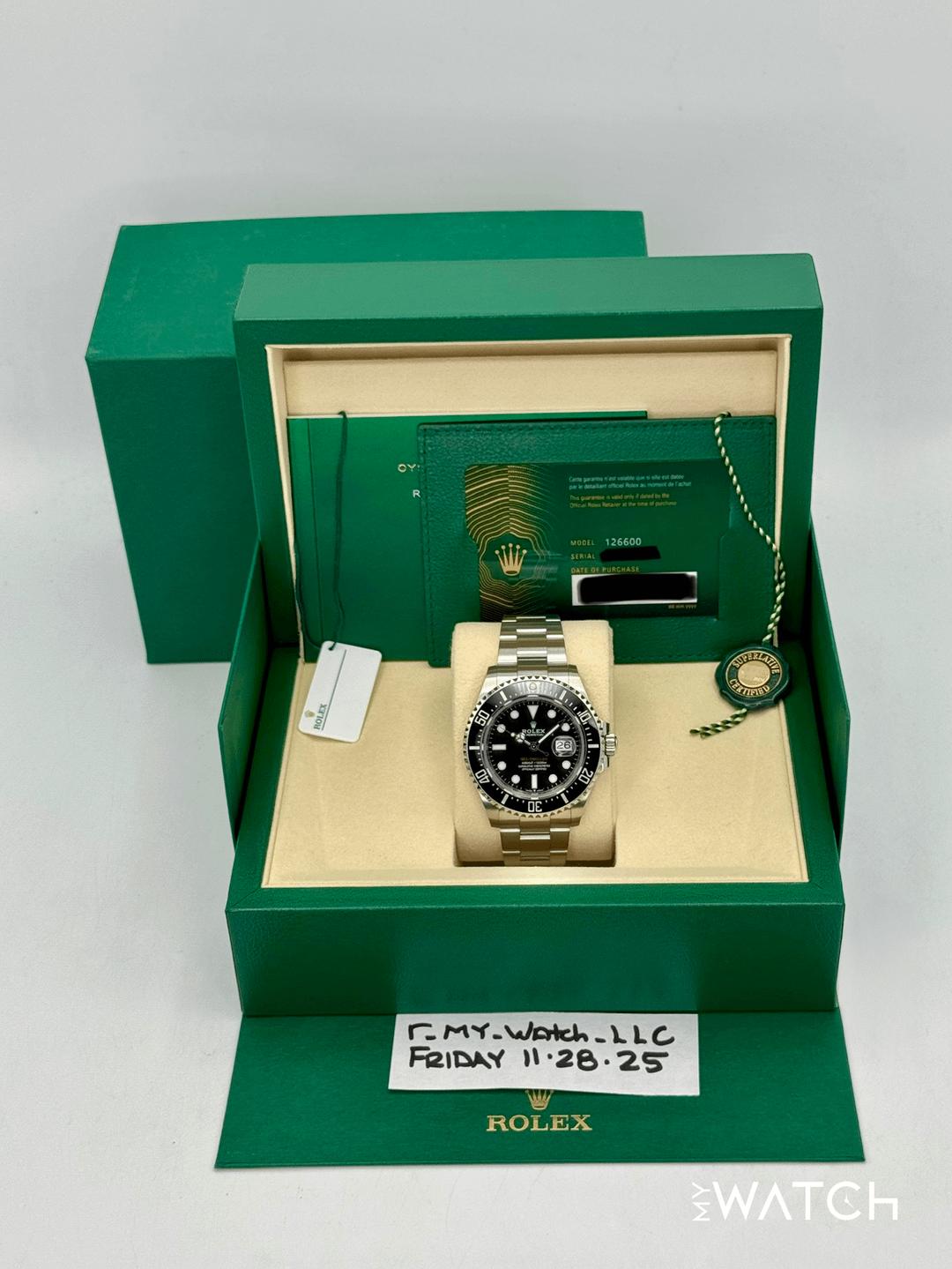 🔵**2025 Rolex Sea-Dweller 43mm 126600 Stainless Steel Oyster Bracelet Black Dial** 🔵**TRADE or SELL us your luxury watch, all brands considered. Message me details.** **Includes the following:** **✔️BRAND NEW 2025 UPDATED ROLEX BOX (Double Boxed)** **✔️Box and Papers - Yes** **✔️Warranty card dated April 2025** **✔️Manual and Warranty booklets** **✔️Green and White Hang Tags included** **✔️Material: Oystersteel** **✔️Size: 8.25inch wrist (Full Links)** **✔️Watch is in excellent overall condition. Please see photos for details.** **✔️**[**Trades**](https://mywatchllc.com/pages/sell-rolex-watch) **welcome** Business Name: **My Watch LLC** LOCATION: Oak Park, Michigan ✔️[MyWatchLLC.com](http://mywatchllc.com/) for current inventory ✔️Google Business Listing [https://g.co/kgs/Cmd6FPW](https://g.co/kgs/Cmd6FPW) ✔️Business Hours M-F 9-6 ✔️Facetime/Video chat/calls welcome to view the watch interested. ✔️Contact: 248-422-0909 via text or call for quickest response. 🟢TERMS: Visit [MyWatchLLC.Com](http://mywatchllc.com/) for payments accepted 🟢REFERENCES/REVIEWS: We are well reviewed on all platforms from google, trust pilot, rolexforums, additionally we have 300+ reference in multiple FaceBook watch groups, reference checks welcome. 🟢SHIPPING: If you are not local, we offer Fully Insured FedEx overnight shipping in the USA for a fee. International shipping available. [https://mywatchllc.com/products/2025-rolex-sea-dweller-43mm-126600-black-dial](https://mywatchllc.com/products/2025-rolex-sea-dweller-43mm-126600-black-dial)