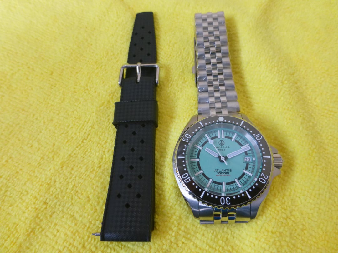 Here we have an excellent condition Tactico Atlantis dive watch with blue dial (some might see this as more of a green dial, depending). Tactico is a microbrand out of Spain and a sister brand to Crepas. It should be noted that all 3 colors of the Atlantis model are sold out and no longer available. This watch features a Ronda R150 automatic movement which is similar in design to an ETA 2824. Includes original watch roll. The metal bracelet has never been worn or sized and still has the plastic wrap on it. Also included is a black tropic-style rubber strap. The only signs of wear that I see are some light scratches on the back of the lugs from strap changes. When available these sold for 719 Euros, approximately $835 USD at today’s exchange rate. Add to this tariffs and shipper brokerage fees and you are looking at about $960. Price lowered to **$400 shipped in the continental US** for this gently used one in fantastic condition, sorry no trades. Specs are: Diameter of the bezel: 40mm, Thickness with crystal: 13.80mm, Length: 47.30mm Thickness of the crystal: 3.7mm, Diameter of the crystal: 30.5mm, Lug width: 20mm Crown diameter 6mm, Thickness of the bezel: 3.55mm, Thickness of the case back cover: 2,35mm Clasp width: 18mm Case, bezel, crown and case cover made of stainless steel 316L with brushed and polished finished Sapphire crystal, Bezel inlay made of ceramic, Gaskets made of Viton and Tefzel Solid stainless steel 316L bracelet with solid clasp Hands, dial and bezel with BGW9 Superluminova