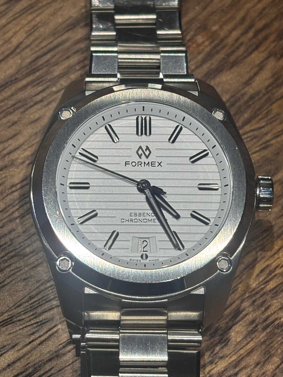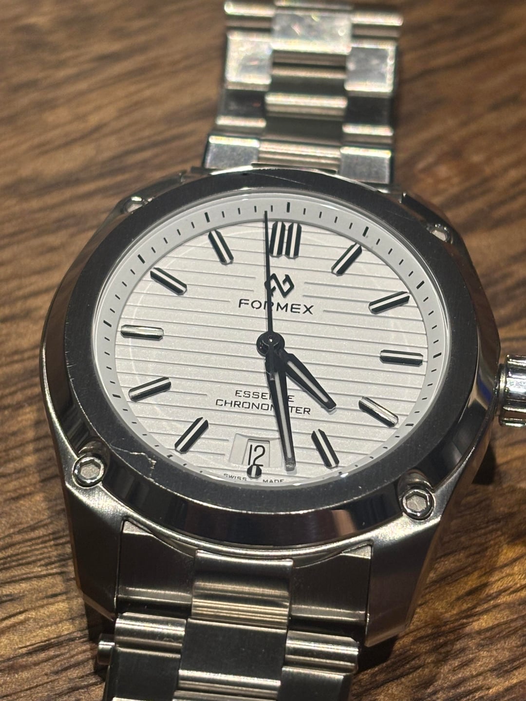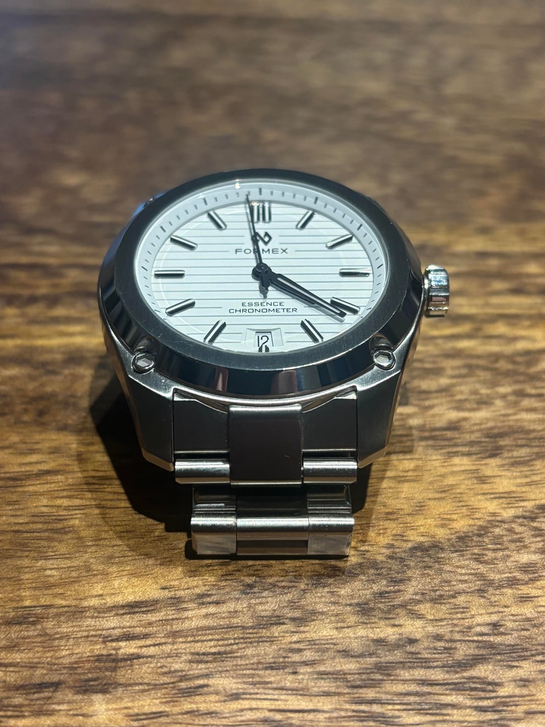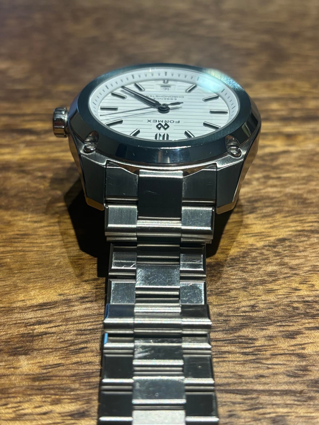 Hello! Relisting a Formex Essence 39 in white, with a reduced asking price. Another great example of Formex's often praised quality for money. For those unaware, Formex's sister brands produce cases/bezels/dials for other well known (more expensive) luxury brands (e.g. GP, Montblanc, etc.). Overall, watch is in great shape, but with minor scuffs/hairlines on the bezel and bracelet/clasp. I've done my best to reflect condition in provided photos. Fits like a dream, currently sized for a 7.25" wrist. Watch comes with full kit as shown in timestamp, including: bracelet (with two spare links), box, papers, and COSC measurements. Additional details below: — Case Size: 39mm — Case Thickness: 10mm — Lug Width: 20mm — Crystal Material: Sapphire — Water Resistance: 100m — Movement: Chronometer Grade SW200-1, visible through display caseback Timestamp: [https://flic.kr/p/2rGSMJQ](https://flic.kr/p/2rGSMJQ) Asking **~~$1,100~~** **$1,050** shipped within the CONUS. Preferred payment methods are Venmo, Zelle, or Paypal F&F (G&S considered for buyers with an established transaction history). Please feel free to reach out with any questions. Thanks!