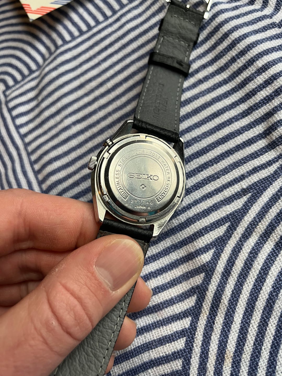 Watch is in great condition, super clean dial and handset, sharp edges. Runs well and the alarm is still quite loud. Purchased on the exchange and they had it serviced last year. Winding and crisp crown operation attest to that. Dial is sunburst gray that’s vibrant in sunlight and more chalk black in lowlight. Original bracelet will fit about 6.25 inch wrist. $320 conus, will send elsewhere with positive transaction history, PayPal (buyer pays for g/s), Venmo, Zelle. Will look at trades because I’m addicted, mostly looking for a Seiko Tuna plus cash, but will look at anything. Thanks.