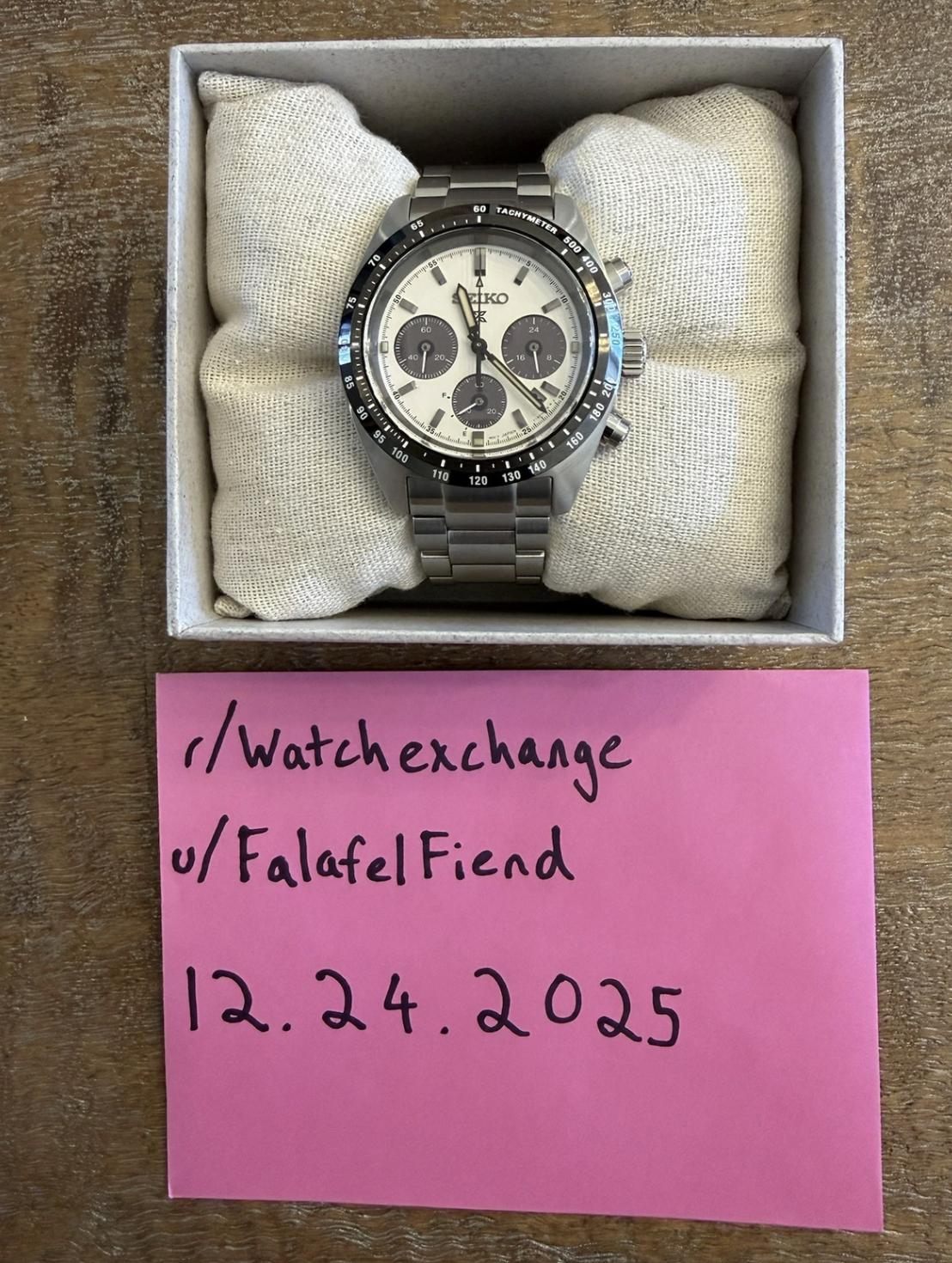 Hi all — up for sale is my **Seiko Prospex Speedtimer SSC813**. This is Seiko’s modern take on a classic racing chronograph: super wearable size, clean panda-style dial, and an incredibly practical movement. **Why it’s worth having** * **Solar chronograph convenience**: it’s powered by light, so you get quartz accuracy without regular battery swaps. * **Versatile design**: sporty but not loud — works on bracelet, leather, or a strap. **Movement / functionality** * **Seiko V192 solar quartz chronograph** * Chronograph with **central seconds**, **60-minute totalizer**, plus **running seconds** and a **24-hour subdial** * **Date** at \~4:30 * **Tachymeter bezel** for timing/speed calculations **Specs (quick hits)** * **39mm** case (very wearable) * **Sapphire crystal** * **100m water resistance** * **All links included** (full bracelet) **Condition** Like new. I got it as a gift, had it **sized**, and **wore it once** before realizing it’s just not something I’ll reach for given what else I have in my collection. No issues — it presents extremely clean. **Price** **$425 OBO + shipping**. Prefer shipping within the **continental US**. Happy to send more pictures, a video, or do a FaceTime—whatever you’d like to see for peace of mind. Will be shipping from NY state **More Images:** [https://imgur.com/a/watchexchange-qZwUIh8](https://imgur.com/a/watchexchange-qZwUIh8)