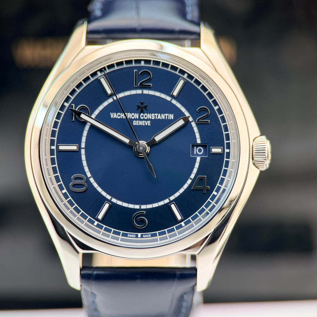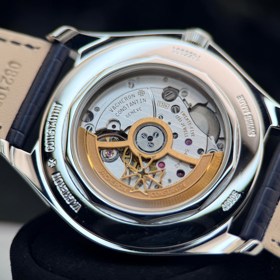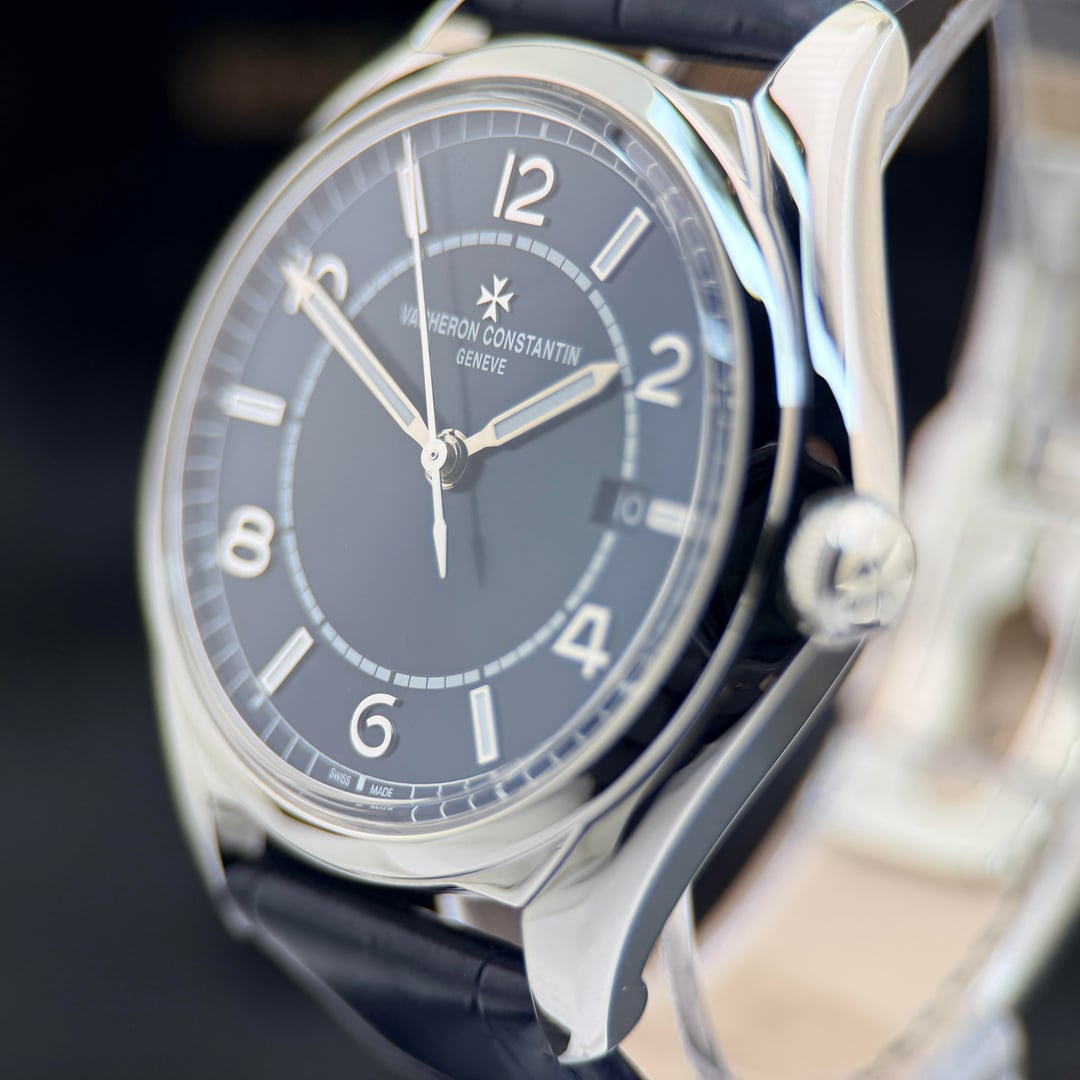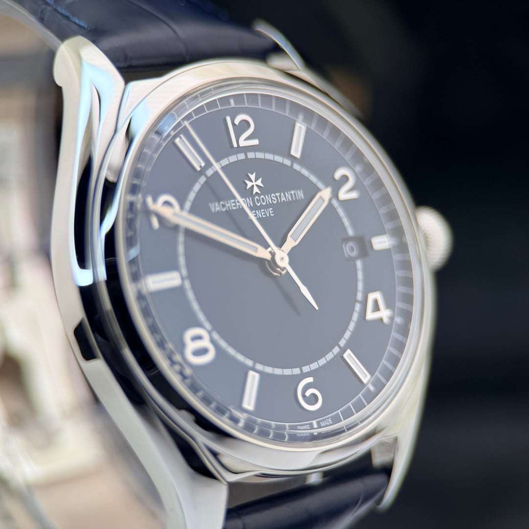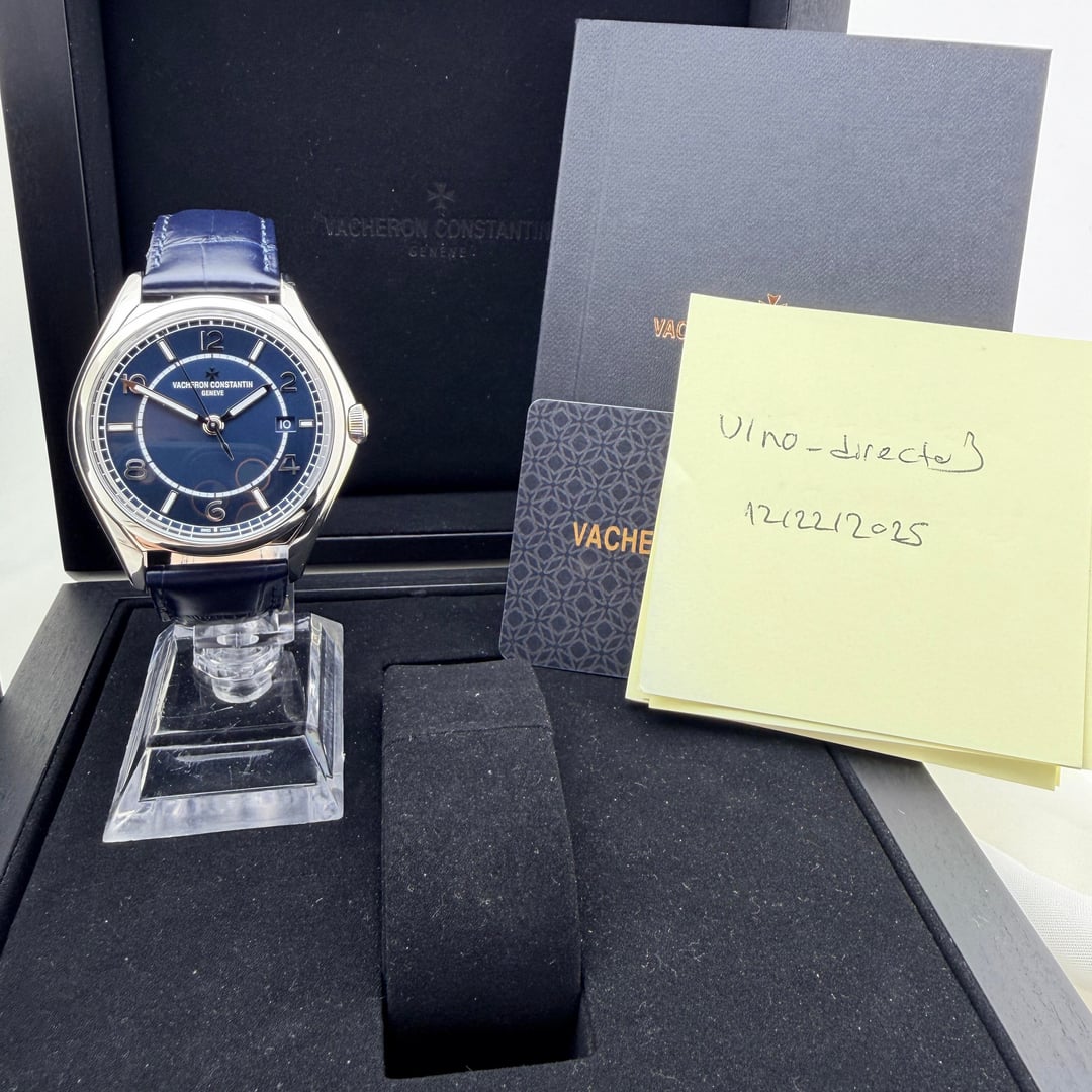 Vacheron Constantin Fiftysix | 4600E/000A-B487 | 2020 Full Set | Mint Condition Price : 11450 The Vacheron Constantin Fiftysix 4600E/000A-B487 elegantly bridges traditional Genevan craftsmanship with a modern, versatile spirit. Inspired by a 1956 Vacheron model, this reference reflects the maison’s ability to reinterpret heritage through contemporary design cues. The 40mm stainless steel case features a refined mix of brushed and polished surfaces, creating subtle contrasts that highlight its rounded lugs and signature Maltese cross-inspired case shape. Its most desired petroleum blue dial offers rich depth with sunburst finishing, applied white-gold hour markers, and luminous hands for perfect legibility. A sector-style minute track lends a vintage touch while maintaining a crisp, balanced aesthetic. Powered by the in-house automatic Caliber 1326, the movement is visible through the sapphire caseback, showcasing Geneva’s haute horlogerie finishing and a 48-hour power reserve. Completing the look is a matching blue alligator strap with a polished steel deployant clasp. Condition: Mint overall condition. The case, crystal, and buckle remain clean with no notable wear. The strap shows only light handling. Running accurately and performing within Vacheron standards. Includes: Full set — inner and outer boxes, warranty card dated 2020, manuals, and original strap & clasp. Excellent entry model to the oldest watchmaker in the Holy Trinity swiss watchmaking maisons.