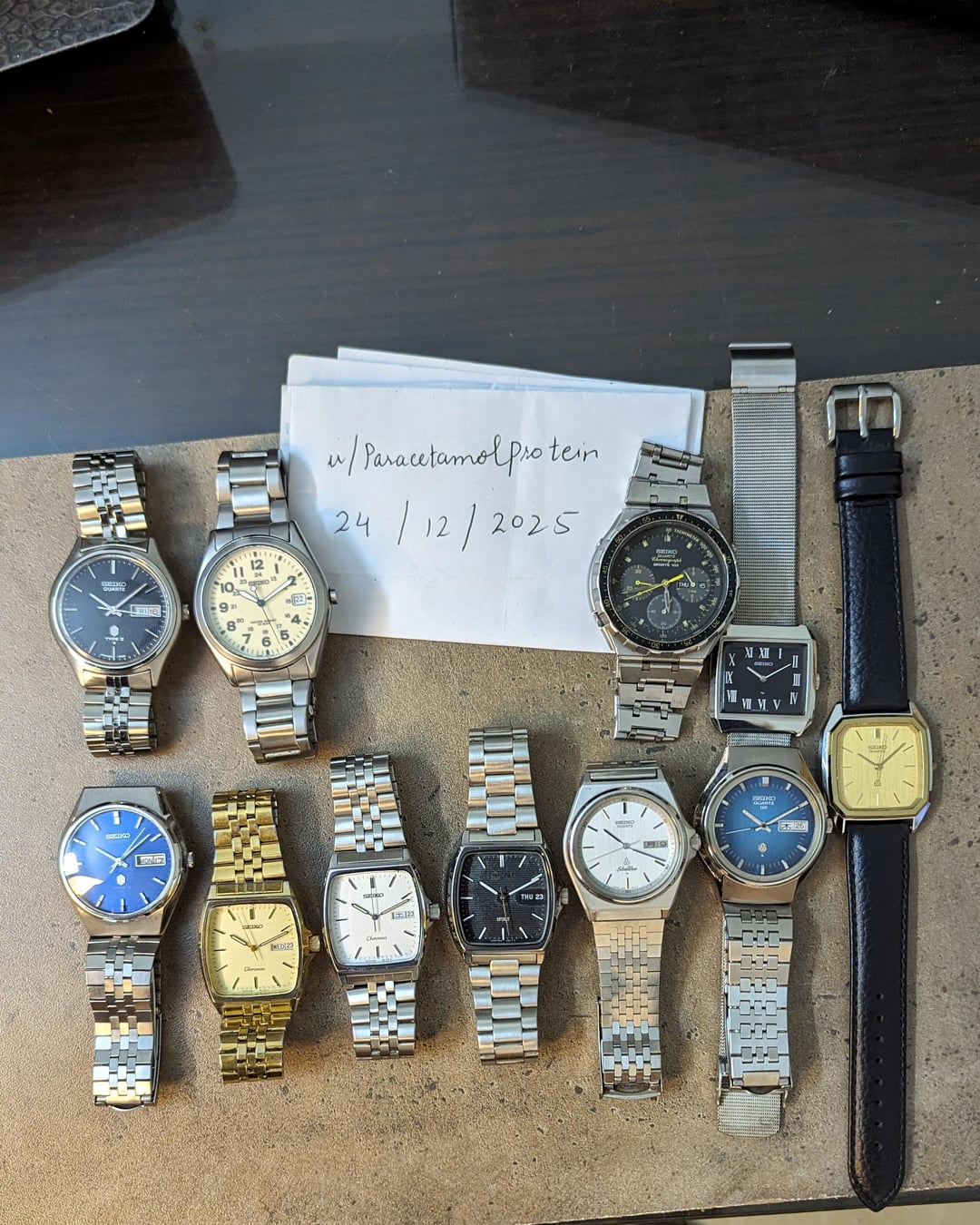 Hey folks. Here's the pre-Christmas sale post with incredible Seikos \*\*\*\* 1. Timestamp 2. Seiko Radium Arabic numerals - $175 3. Seiko Type II blue textured dial kanji day calendar - $194 4. Seiko Chariot roman dial $179 5. Rare Seiko quartz dolce twin quartz - $299 6. Seiko Chronos gold plated $149 7. Seiko type II black textured lining dial - $189 8. Seiko Spirit black textured dial tank $149 9. Seiko quartz QR blue dial $225 10. Seiko silverwave - $155 11. Seiko Chronos radiator dial tank - $149 12. Seiko Chronograph Sports $399 \*\*\*\* Payment: PayPal G&S Shipping: $20 to standard addresses worldwide