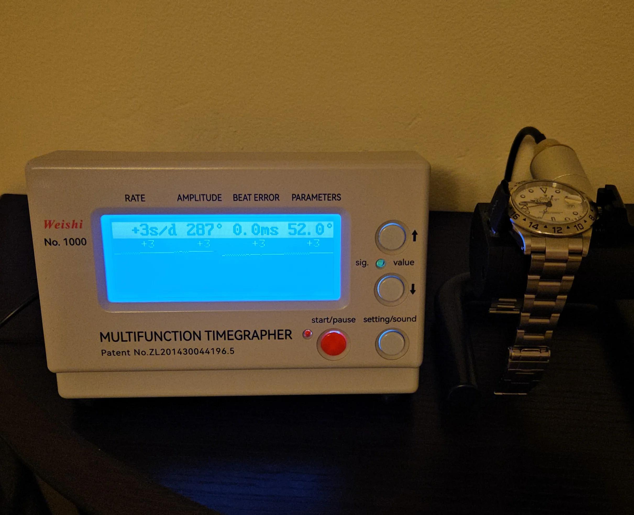 Mechanical Condition: Running very well at +3 sec/day at 287 degrees amplitude in the dial up position. Crown winds smooth. The jumping hour hand and date change over, are both in good working order.