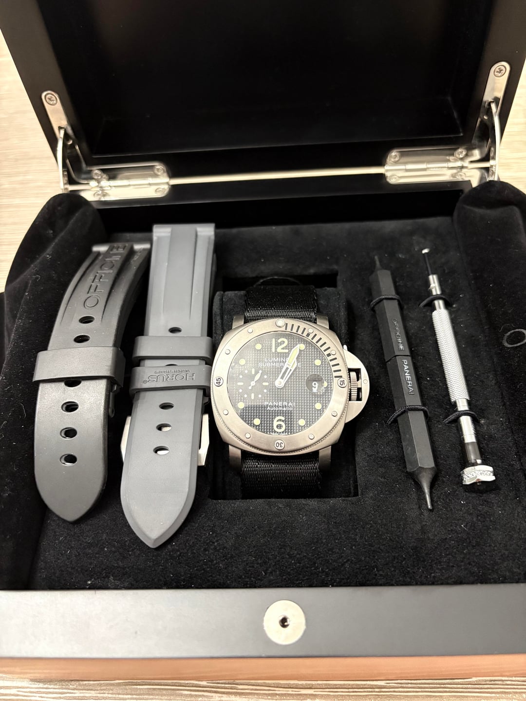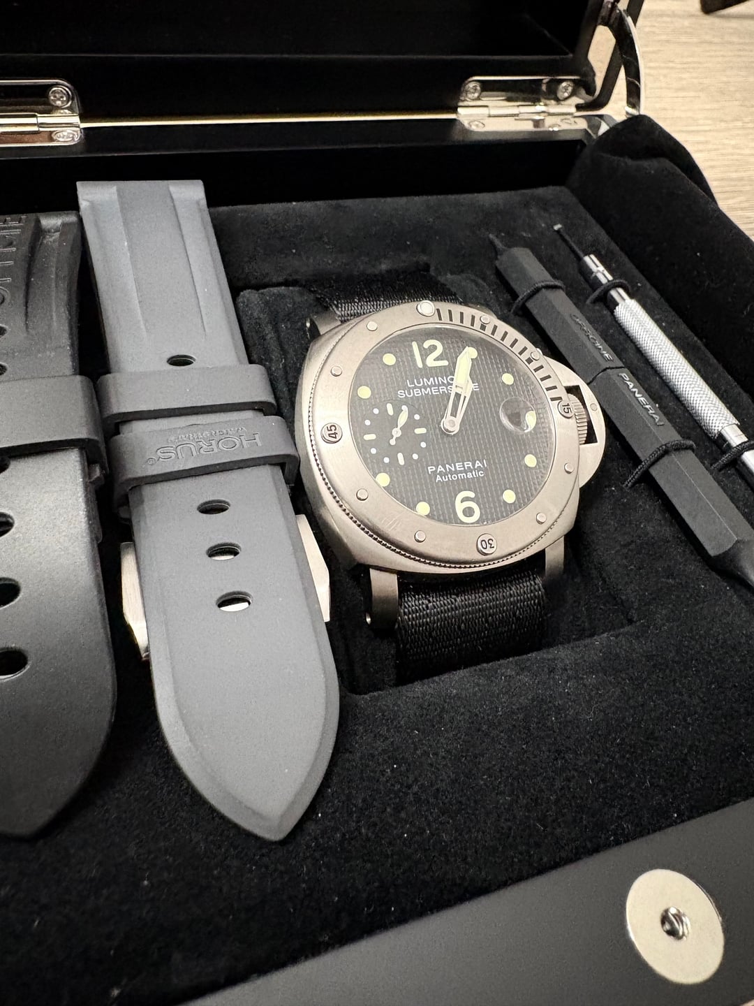 Panerai PAM025 in great condition. Comes with original box and warranty card. Original black strap, Horus grey strap, and 1 black nato strap are included. I purchased it from Chrono a few months ago and have decided to look into a newer model. I am happy to Facetime or send more images if needed. I will insure the shipping via FedEx. Zelle is accepted. Price is $3,200 shipped.
