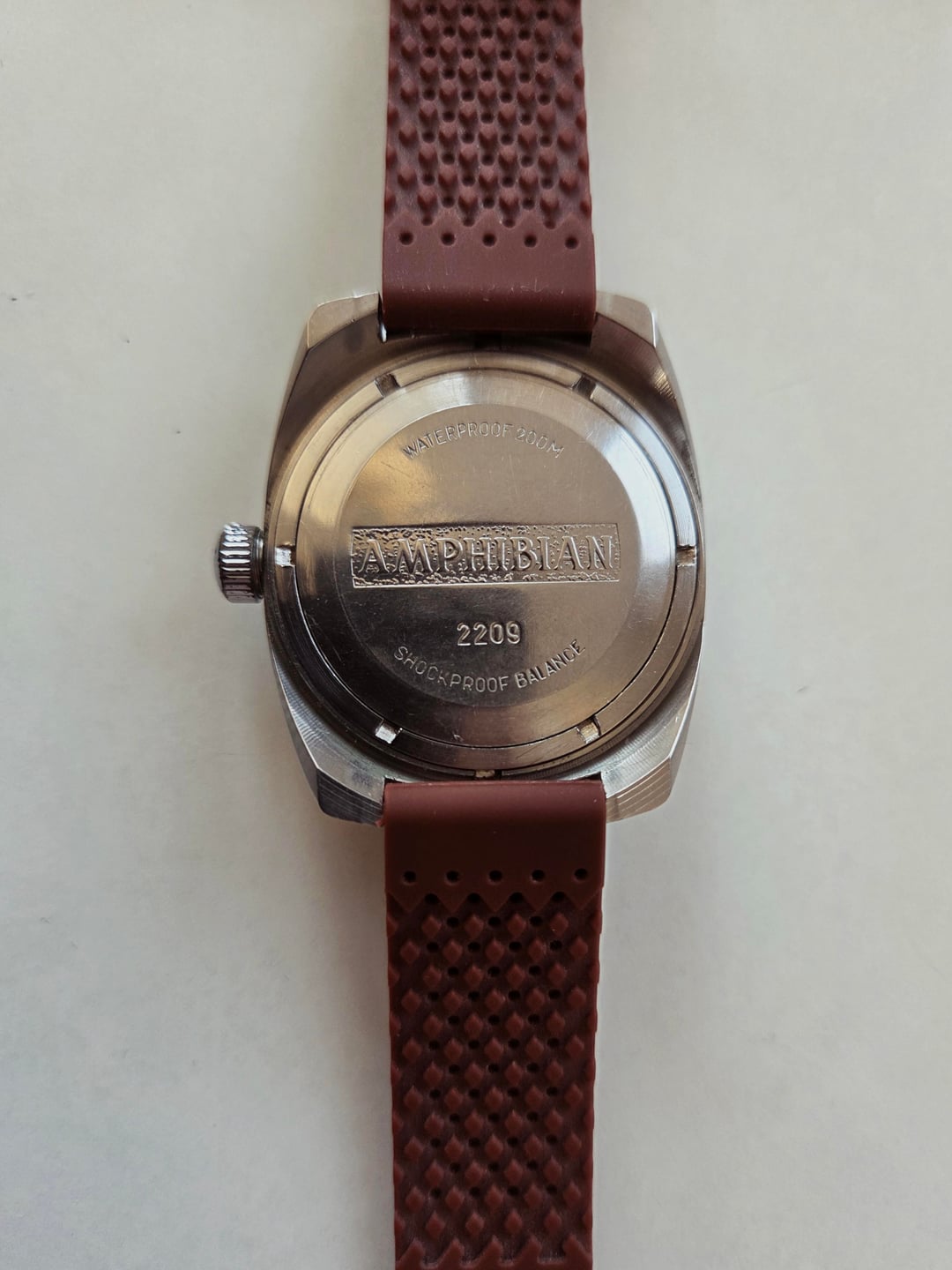 First generation tonneau Amphibian with paddle hands. Very rare model, circa 1979. Original domed crown + crystal. 2209 manual wind movement. Working, condition shown on photos. Not tested for WR. 38 (without crown) x 46 mm. 18 mm rubber strap. Priced at 75 $ + 10 $ for worldwide shipping from Croatia, EU. Paypal F&F.