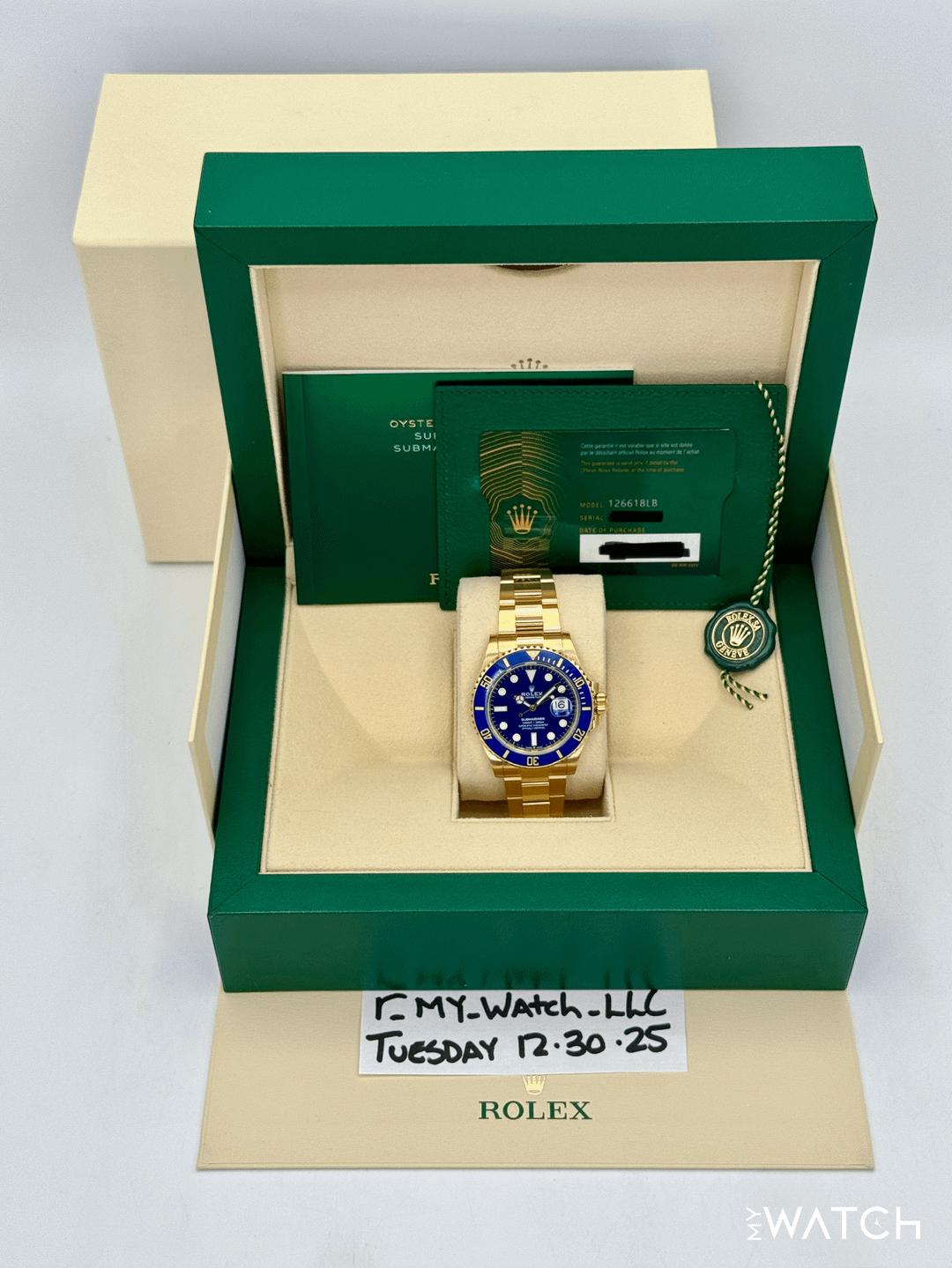 🔵2024 Rolex Submariner "Bluesy" 41mm 126618LB Yellow Gold Blue Dial 🔵TRADE or SELL us your luxury watch, all brands considered. Message me details. Includes the following: ✔️Original Rolex Double boxed ✔️Box and Papers - Yes ✔️Warranty card dated March 2024 ✔️5 year manufacturer warranty ✔️Manual and Warranty booklets ✔️Green Hang Tag included ✔️Size: 8.25inch wrist (Full Links) ✔️Watch is in excellent overall condition. Please see photos for details. ✔️Trades welcome Business Name: My Watch LLC LOCATION: Oak Park, Michigan [✔️MyWatchLLC.com](http://✔️MyWatchLLC.com) for current inventory ✔️Google Business Listing [https://g.co/kgs/Cmd6FPW](https://g.co/kgs/Cmd6FPW) ✔️Business Hours M-F 9-6 ✔️Facetime/Video chat/calls welcome to view the watch interested. ✔️Contact: 248-422-0909 via text or call for quickest response. 🟢TERMS: Visit [MyWatchLLC.Com](http://MyWatchLLC.Com) for payments accepted 🟢REFERENCES/REVIEWS: We are well reviewed on all platforms from google, trust pilot, rolexforums, additionally we have 300+ reference in multiple FaceBook watch groups, reference checks welcome. 🟢SHIPPING: If you are not local, we offer Fully Insured FedEx overnight shipping in the USA for a fee. International shipping available. [https://mywatchllc.com/products/2024-rolex-submariner-bluesy-41mm-126618lb-yellow-gold-blue-dial-2](https://mywatchllc.com/products/2024-rolex-submariner-bluesy-41mm-126618lb-yellow-gold-blue-dial-2)