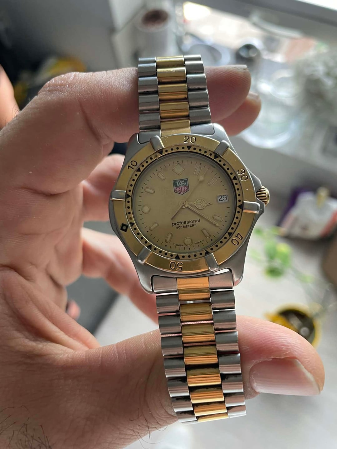 Selling my mid-90s TAG Heuer 2000 Professional 200m diver, ref WE1120-R. Classic two-tone with champagne dial, gold-plated bezel/crown/center links, sapphire crystal, quartz movement. Condition: Good honest vintage wear, some scratches and typical gold plating fade on edges/links. No major damage. Dial/crystal clean. Fresh battery installed, running great. Watch only, no box/papers. ~38mm case, fits up to 7.5” wrist. Asking $500 OBO shipped (PayPal, Venmo, Apple Pay, Zelle) shoot me offers. PM with questions. Thanks!