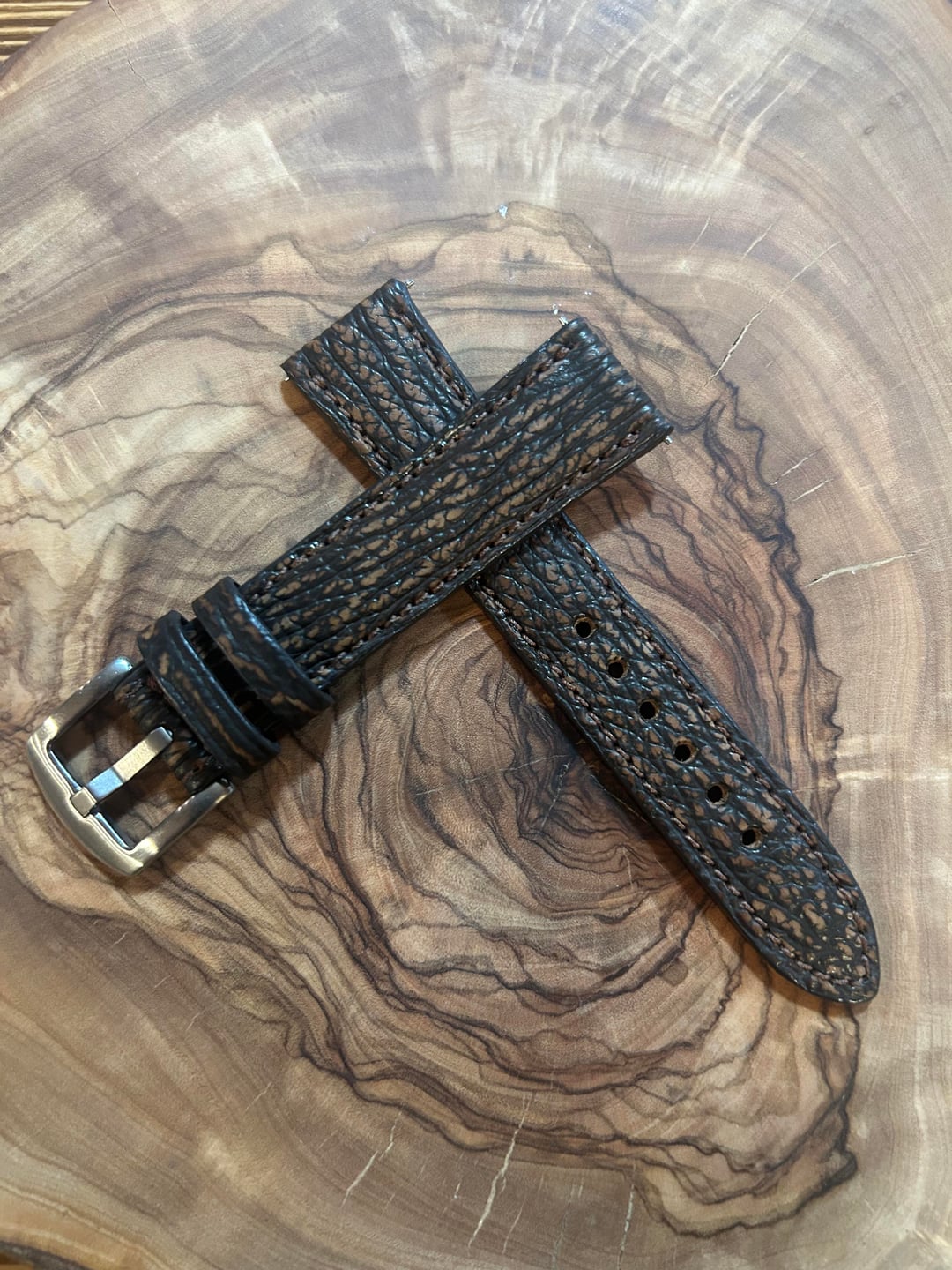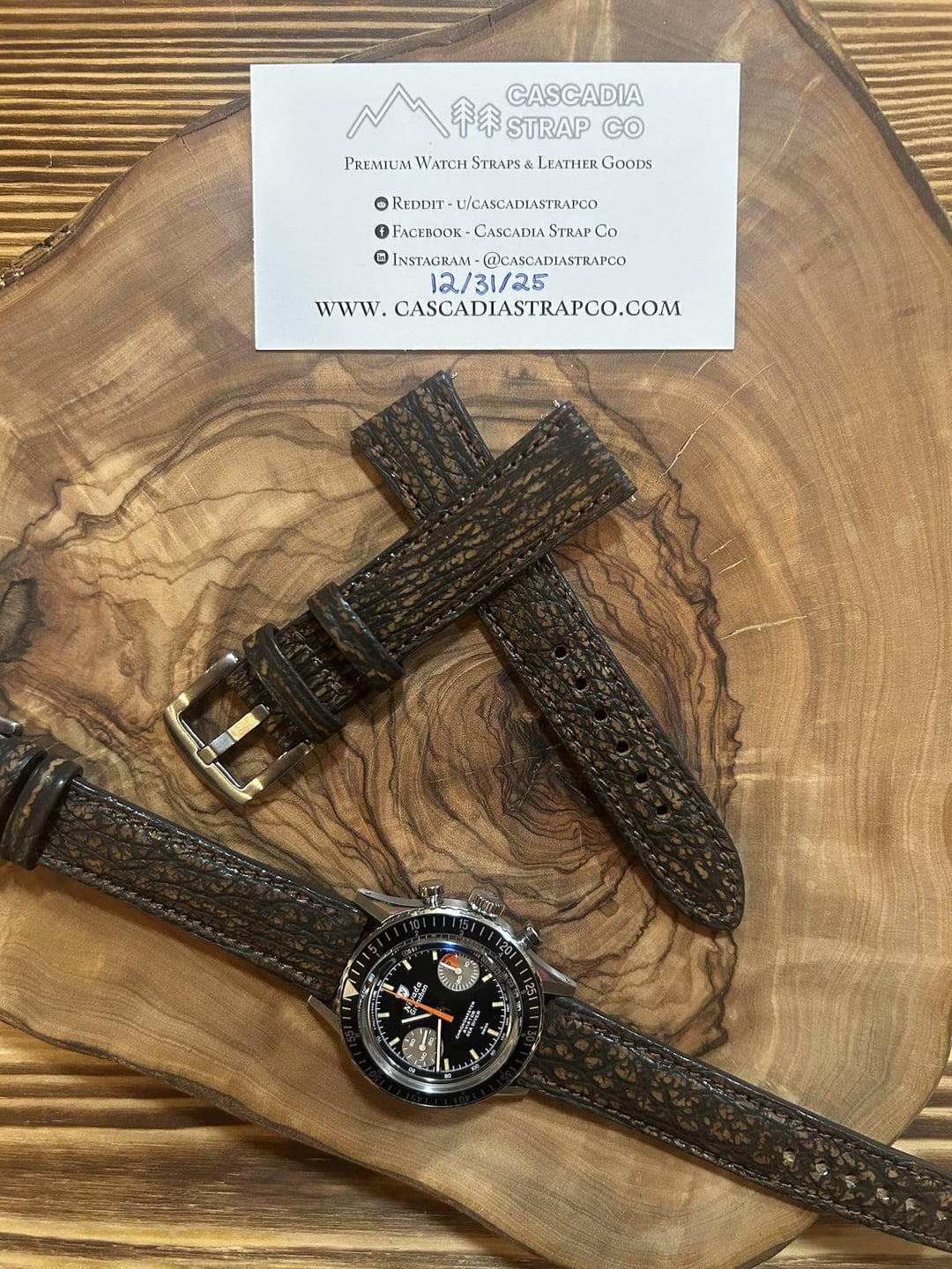 Hey r/watchexchange! Happy New Year!! 🎇🎉 Please make sure to follow us on Instagram! Instagram- @cascadiastrapco We have another brand new release to add to our holiday sale (SALE ENDS DEC. 31 AT MIDNIGHT) Introducing a very limited stock of our Brown & Black Shark! Handmade in the USA, blue shark leather sourced from Texas. We are continuing our annual HOLIDAY SALE! (HOLIDAY25 for 25% off everything!!) and (REDDITSHIP for free shipping for all of our reddit friends). Go ahead and double up on the codes we don’t mind 😉 Responsible sourcing of leather is important to us. We have personally visited and evaluated the tanneries where these leathers originated to ensure they meet our quality and ethical standards. These straps are 100% hand crafted and hand stitched by Cascadia Strap Co. You will not find them anywhere else! These straps are 120/80mm in length. They are 3.7-4mm thick, and the taper is 2mm thinner than the lug width. Timestamp - https://imgur.com/a/qafJzM6 Album - https://imgur.com/a/JC9q46V Sizes Available - 18, 19, 20, 21, and 22mm. Each strap is $~~79~~ $59.25 and as always, shipping is free for Reddit in the United States. Please contact us for international shipping availability. Who We Are Cascadia Strap Co are a couple of watch nerds from the Pacific Northwest who have a passion for all things watches. We are not a big company and we’re not rebranding mass-produced straps to make a quick buck. Our straps are all completely hand made by our team of craftsmen. We do this out of love for watches and the awesome watch community we’ve found. We always strive to make our products as affordable as we can, while still offering excellent quality straps. If you’d like to try a fun strap from a small business who values customer service, quality, and ethical material sourcing, please give us a try. We’d love to hear from you to answer any questions or just talk watches!! Instagram- @cascadiastrapco Website- www.cascadiastrapco.com Thanks everyone and Happy Holidays!!