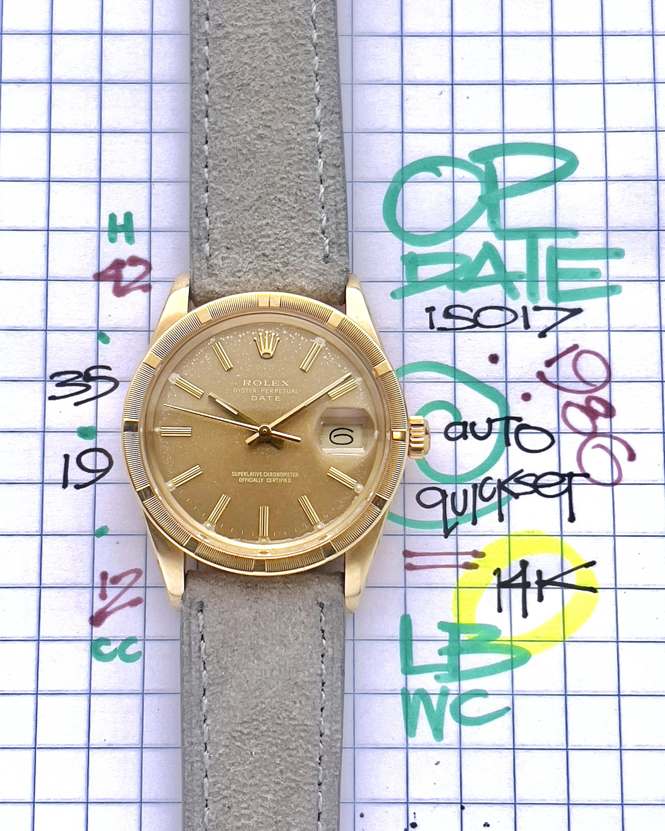 Rolex Oyster Perpetual Date 14k solid gold ref. 15017 circa 1986 A solid gold Rolex…mic drop. During the 1970-1980s, 14k gold we the most precious metal that would be imported into the States but to import taxes—therefore—we know this piece was intended for the USA market and stayed stateside. We point his out as the Day Date 1803 is an 18k creation. The 1500 series is arguably a perfectly proportioned piece and clearly inspires the modern popular OP series today. This 15017 features an engine turned style gold bezel (similar to the steel 15010) and it frames a lovely patina’d metallic toffee colored dial that will ghost in certain angles. Overall, the watch appears to have minimal signs of polish as all the factory finish and textures are distinguishable. On the back of the watch, the marks are the gold hallmark stamps and there are also marks where the original bracelet sat—we are offering this on a on suede strap. While no service history, the watch looks very healthy on timegrapher and quickset snaps like it should. Manual winding is a bit rough but automatic watches are meant to be self-wound and the manual should only be used to jumpstart ultimately to preserve the parts. The quickset occasionally sticks ever 14-15 days but can be manually advanced. ____________________________ * specs: 35mm case (measuring 8-2) and 34mm if only measuring bezel X 19 lug width X 42h (lug to lug) X 12.5cc including acrylic * Timestamp: https://imgur.com/a/bxvDPmQ * pics & More: https://drive.google.com/drive/folders/1f2Ka3SIojb-Ph7F0xbzv6DCEBz-pIC48 * no box or papers * 911…serial # ____________________________ ___________________________________ * Video is the best way to view the watch if in-person test drive is not available. Due to the different characteristic of the cameras and gadgets used, the color of the watch you purchase may not be the same as shown on this website or on our Instagram. * will consider trades that make sense but please consider time, shipping, and trade value—not market. - local special: can possibly accommodate at ButterScotch in Downtown Long Beach by appointment - All sales final unless the watch is misrepresented or lost in transit (always fully insured) - Link to [feedback here](https://watchcharts.com/repcheck/user/soycowboy?source=reddit&type=feedback) ____________________________ Asking a *negotiable* **$5999** via bank wire, Zelle, and/or venmo Price includes fully insured Fedex shipping in the USA— hand delivery in long Beach with drinks or coffee on me ;).
