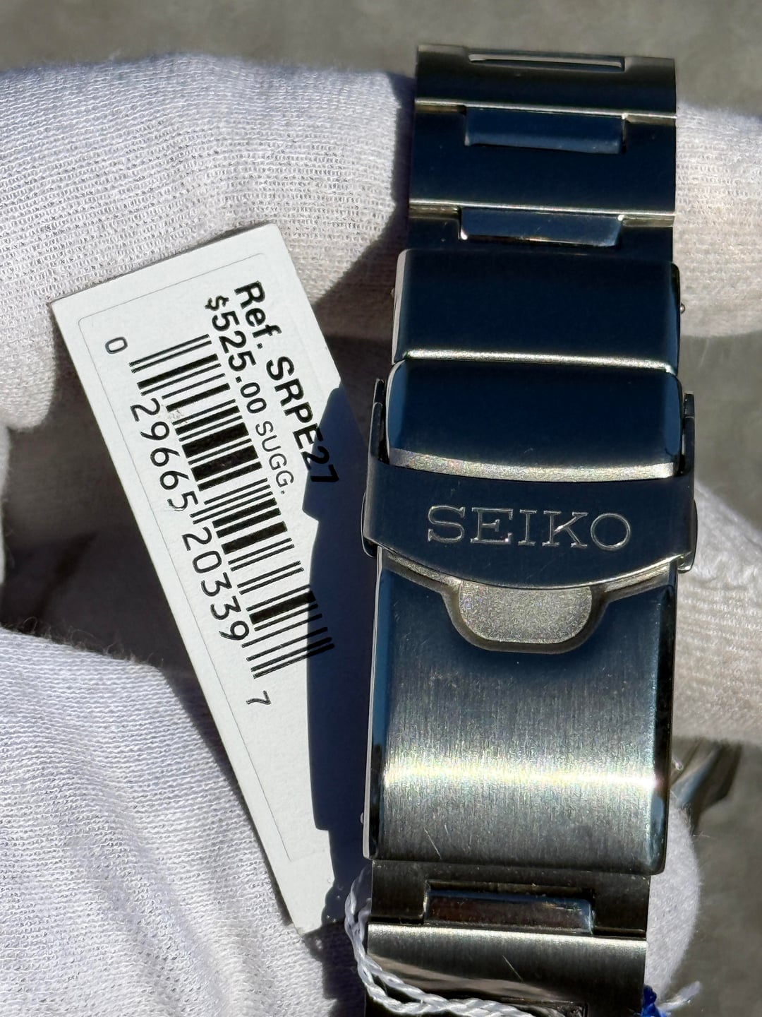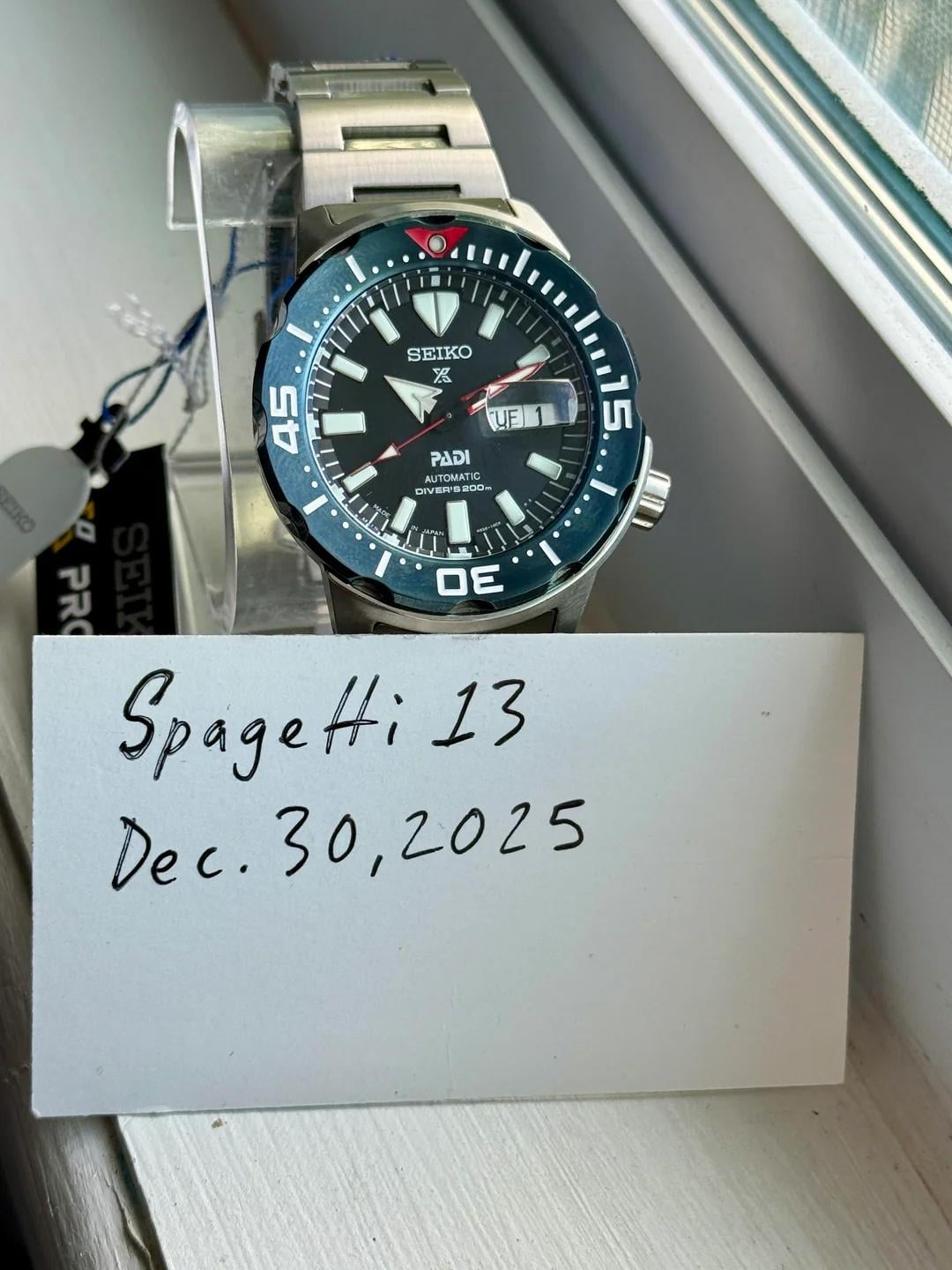 Happy new year! This watch is new with both hang tags, but missing the box. Purchased as new old stock in a Macy’s liquidation, so I’m passing along the savings. Seiko Prospex PADI Special Edition SRPE27. 4R36-11C0 Bracelet fits 7.75 inches, and more if you open the diver’s extension. **ASKING $269 SHIPPED**
