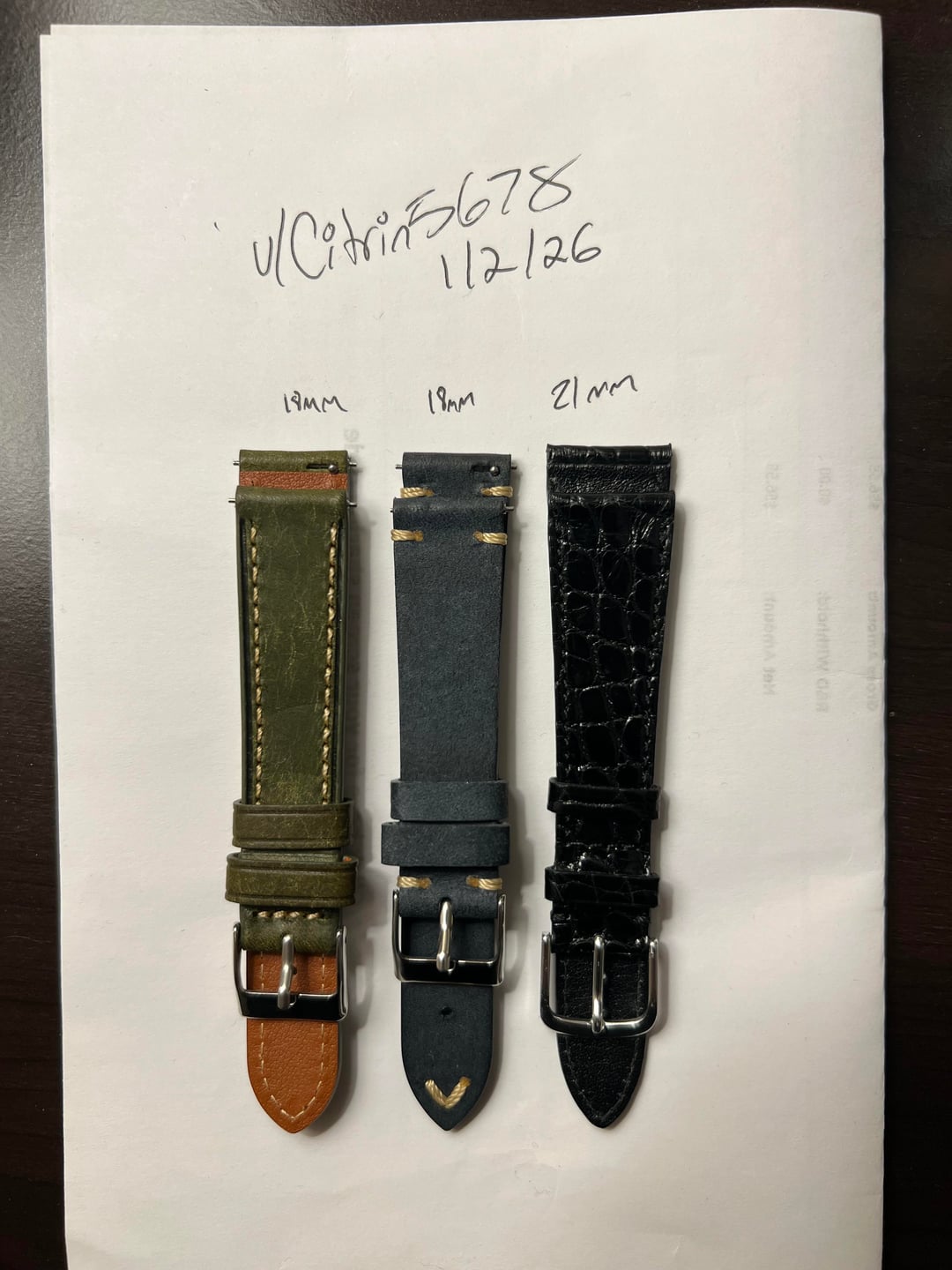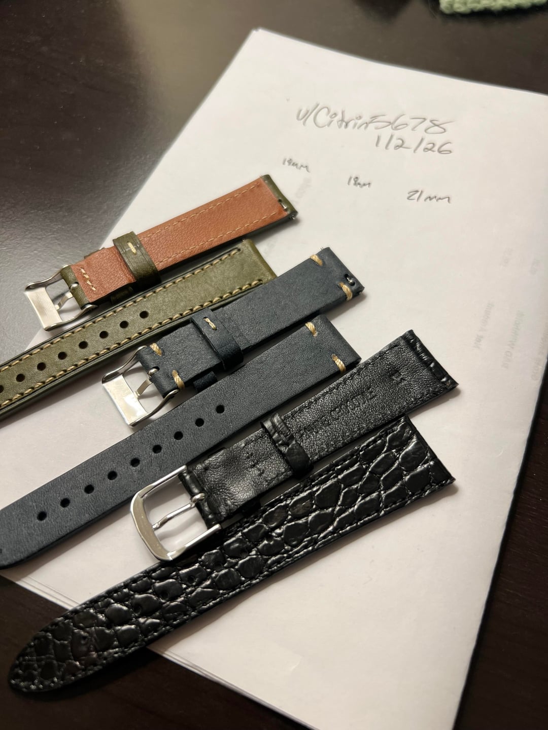 Hey guys! Today I have a few straps that I’m trying to cut down on. I have 2 unused 18mm handmade leather straps, one green full stitch, and one blue twin stitch each with quick release spring bars. $20 each. I have one lightly used 21mm black genuine crocodile strap. It is very elegant and I mostly used it on 20mm watches to dress them up! This one I am hoping to get ~80 since I paid 120+ for it but I’m open to offers. Shipping wise, I’m going to add a flat 10 to the total! I can use PayPal FF, GS(+4%), Zelle, Cashapp, Bank Wire. Please let me know if you have any more questions!