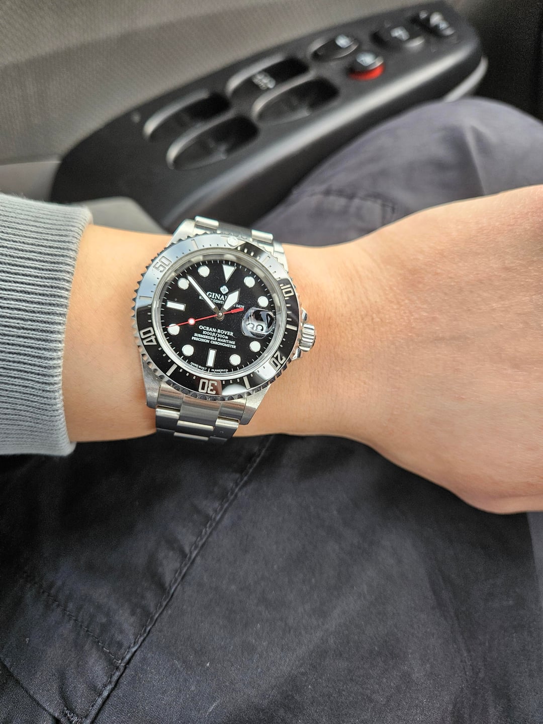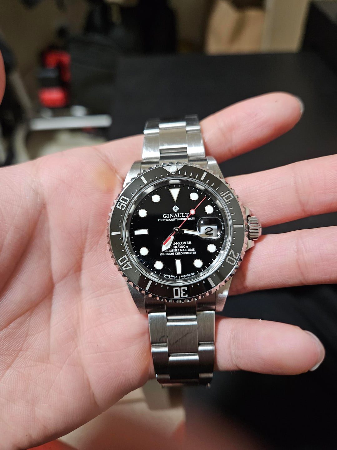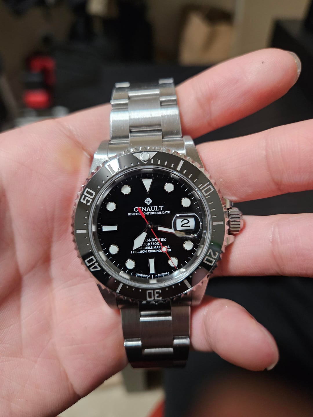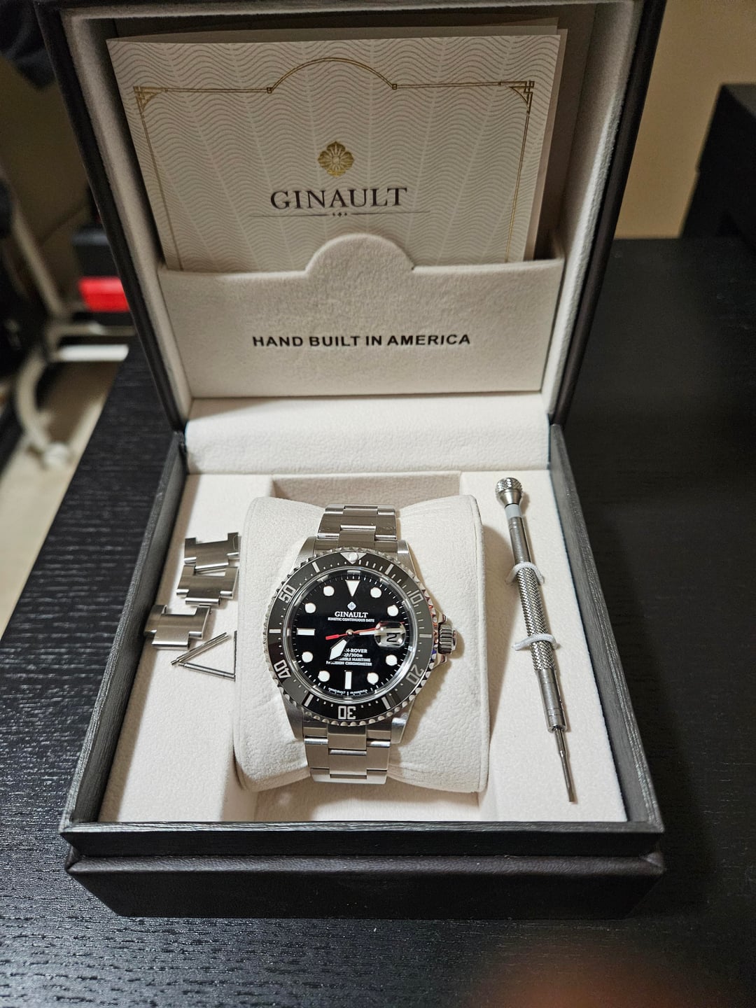 Up for sale is the Ginault Ocean Rover 2 in black. It's a great watch but is too big for my needs. Timestamp: [Ts](https://imgur.com/a/zcin8f7) -Condition: In excellent condition. Minor scratches on case and bezel, barely noticeable. Scratches mainly on bracelet. -Case: 40mm x 11.5mm, 47.7mm lug to lug -The watch includes box and papers and additional links Asking $860 via PayPal or zelle, insured shipping to CONUS Note: I will be down to do a video call to confirm the authenticity of the watch.