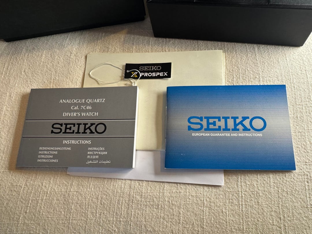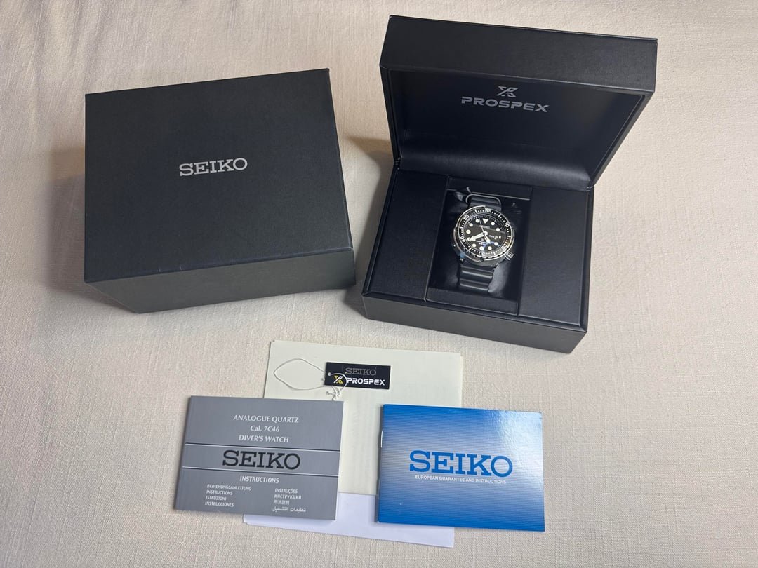 Hey everyone! I'm selling this now discontinued Seiko Prospex SBBN045 Tuna. Fully boxed with hang tag, stamped warranty card, and February 2024 service papers (they have some personal info on them so I can provide pictures to perspective buyers and will provide paper copies to the buyer). Reference # is S23629J1 (or in JDM as SBBN045). This reference features Seiko's 7c46 quartz movement which is exclusive to the Tunas, a diashield coated case, a sapphire crystal, and black day / date display. This example is in very good used condition (noticeable scratches/ marks on the bezel insert in the right light which I tried to capture). Case measures 47.7 wide and 14.3 thick, with a 48mm lug to lug measurement and 22mm lug width. Purchased here last year for $1,000, only wore once, and now looking for **~~$950~~ $850 shipped** in the US, payment via PP F&F or Venmo. Timestamp: https://imgur.com/a/Le3yYpF Photo album: https://imgur.com/a/WIja9CR