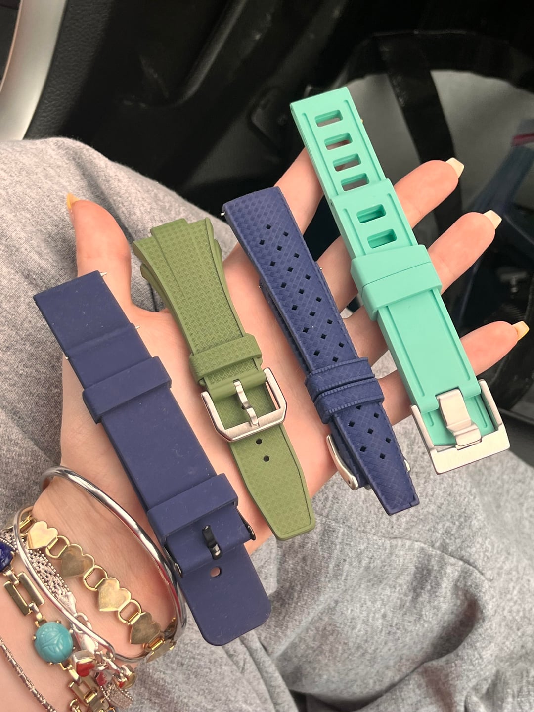 [WTS] Blue/Green Strap Lot: Helm, Delugs for PRX, 20mm navy waffle, 22mm navy Left to right Navy blue 22mm rubber/ $15 PRX 40mm delugs green/ $45 Navy 20mm waffle strap/ $20 Aqua helm strap rubber 22mm/ $20 All prices include shipping Venmo, PayPal