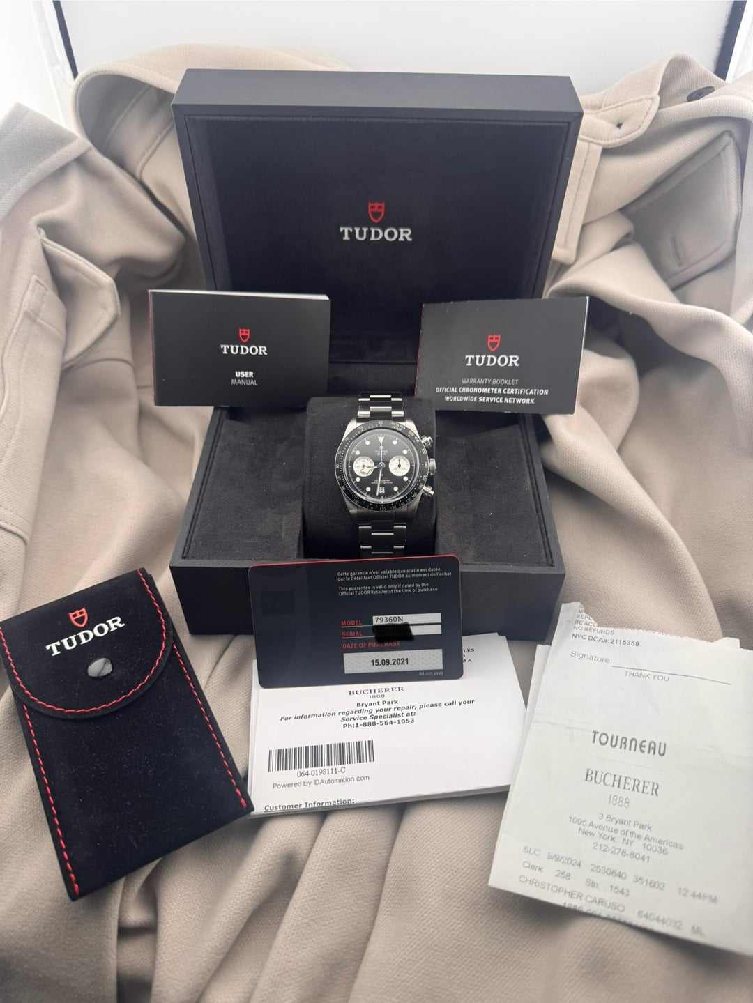 Tudor Black Bay Chronograph 79360N (“Reverse Panda”), one of Tudor’s most desirable modern chronographs, blending vintage motorsport aesthetics with a robust in-house movement. This example was recently serviced in 2024 and is running strong. Condition is excellent with light, honest wear consistent with careful ownership. Comes as a full set including the Tudor service pouch. ⸻ 💰 Price $3,750 + shipping MSRP: $5,625 No trades at this time. ⸻ 📦 What’s Included • Tudor Black Bay Chronograph ref. 79360N • Inner box • Outer box • Warranty card • Manuals & hang tags • Full bracelet with all links • Tudor service pouch (2024 service) ⸻ 📝 Condition 8.5–9/10 — Excellent • Dial: Clean reverse panda with strong contrast • Crystal: No scratches • Case: Great shape with minimal handling marks • Bracelet & clasp: Light micro scratches from normal wear • Movement: Recently serviced and running perfectly All photos taken with a high-resolution camera to accurately represent condition. ⸻ 📍 Location & Shipping • Charlotte, NC • Fully insured U.S. shipping • Secure packaging, tracked & signature required • Local meetups welcome ⸻ 💳 Payment Accepted • Bank wire • Zelle • Cash (local) • Venmo (case-by-case) ⸻ 🧾 About Me (Casetowrist) I’ve been selling and trading watches for 10+ years, prioritizing transparency, trust, and smooth transactions. Happy to meet at a local watchmaker for authentication (buyer covers fee). Instagram: @casetowrist Website: Casetowrist.com