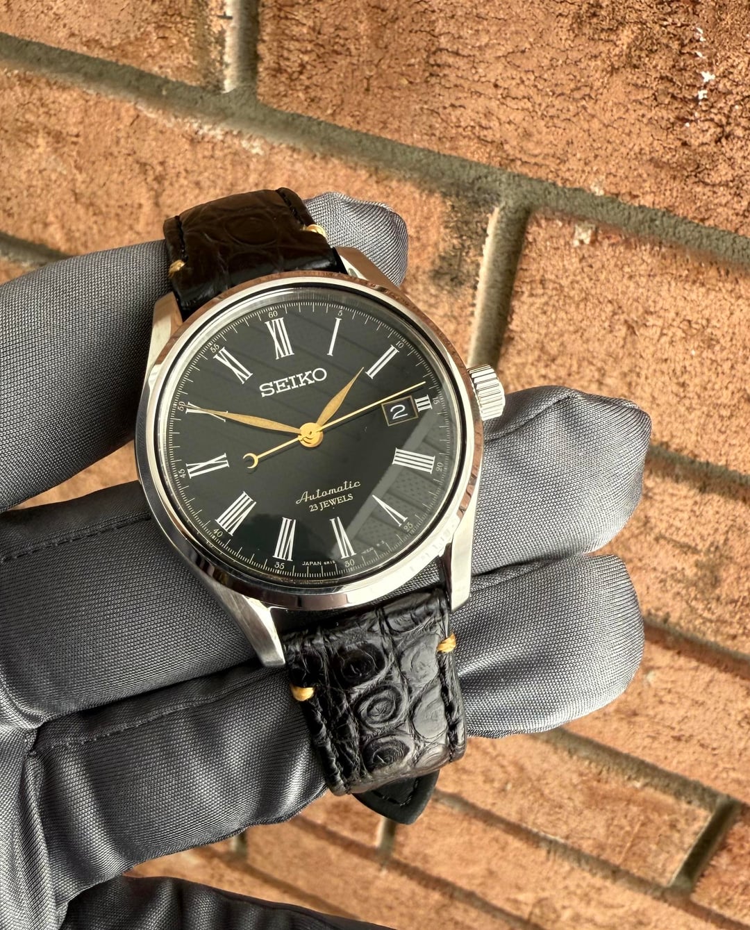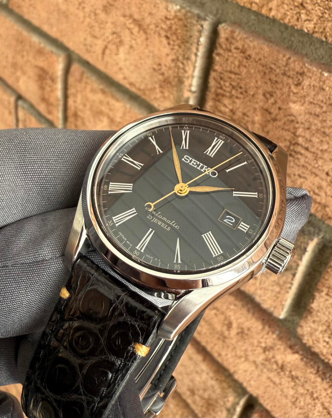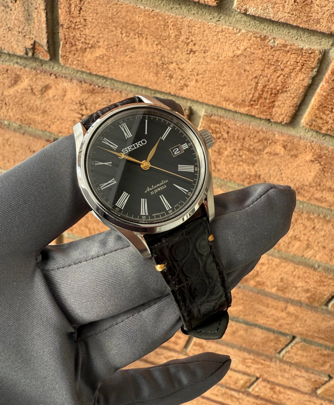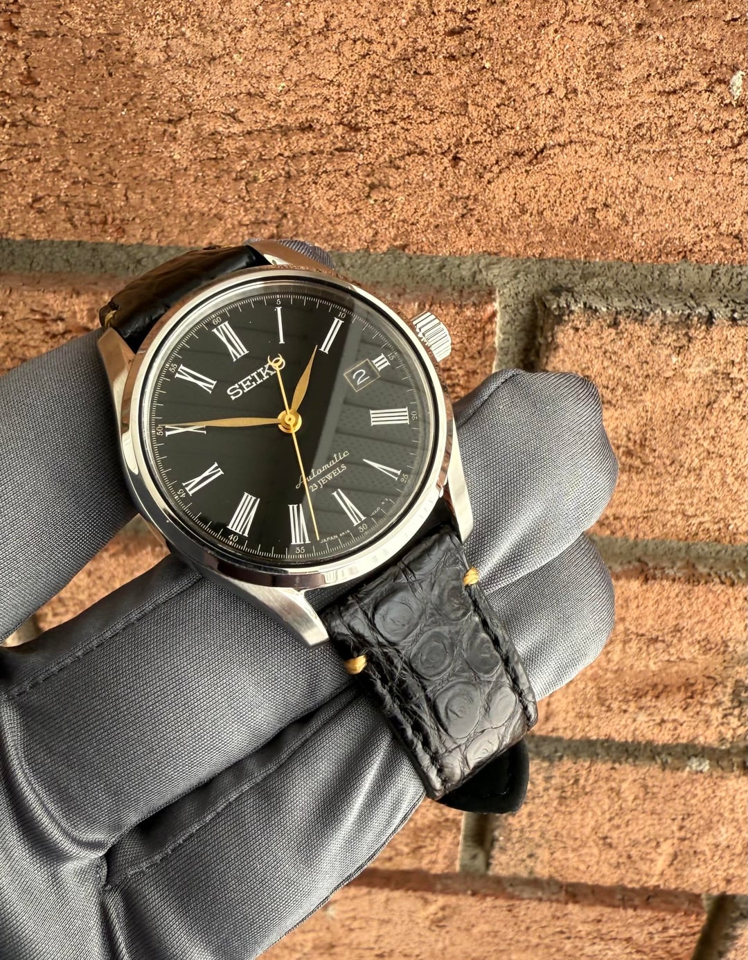 On offer here is the now discontinued SARX029. This watch represents the essence of seiko at a time where it delivered unmatched value in watchmaking. The handmade urushi lacquer dials are a sight to behold, where the depth of the deep black dial can’t be captured by my pedestrian photography skills. That said, some great pics and articles can be found in other reddit posts. The near magical dial provides an apt backdrop to the radiant powder gold hands. Lastly, the watch features a genuine crocodile strap, a feature only seen on Grand Seikos nowadays. The watch is accompanied by its original box and sleeve plus the manual only. No warranty card is included. I do not have a timegrapher and I have not timed the watch. The movement winds smooth and I have not observed any great variance in time keeping. This is a classic 40/20, 40mm case with 20mm lug width. Even with its dressy nature it does feature 100m of water resistance to serve as a daily. The watch Is in very good condition but given the high polish case, light scratching will be visible under scrutiny. There are no deep scratches, gouges and the crystal is clear. Watch ships out of Canada and is priced at $740 (USD) plus the cost of insured shipping. Payment is via paypal, transaction history or references needed. G&S or F&F accepted, all fees are on buyer.