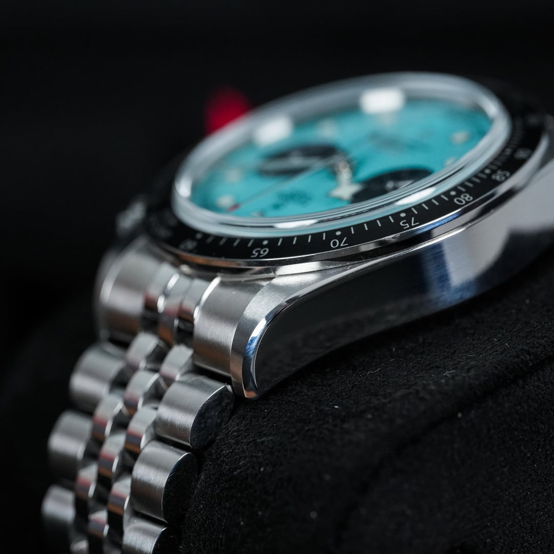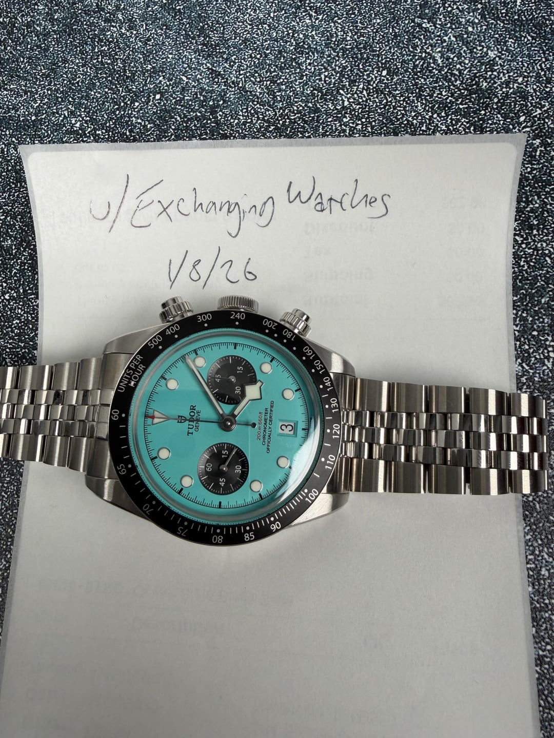A bold and highly sought-after Black Bay Chronograph featuring the striking “Flamingo Blue” (Tiffany-tone) dial. This 41mm stainless steel reference combines Tudor’s vintage-inspired design language with modern chronograph performance, delivering a watch that stands out immediately on the wrist while remaining versatile and wearable. This example is offered in excellent condition, dated in 2025, and comes as a full set. With demand for the Flamingo Blue dial continuing to grow and availability remaining limited, this represents a strong opportunity to secure one of Tudor’s most talked-about modern chronographs. Please view pictures carefully, as I use a strong macro lens to highlight any and all imperfections. This may exaggerate minor details or reveal dust particles that are not visible in normal wear. I am always happy to provide additional photos from different angles upon request. I take pride in providing straightforward, accurate listings and handling every transaction personally. Feel free to reach out with any questions—I’m happy to help ensure a smooth and easy buying experience. 10,100 shipped. Trades considered