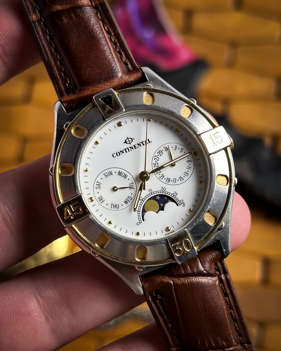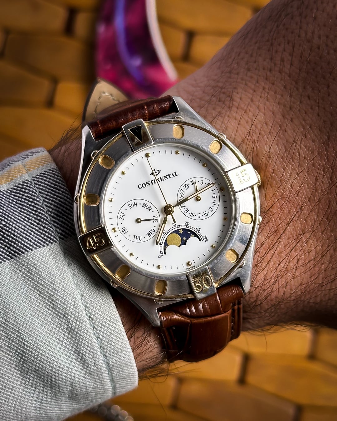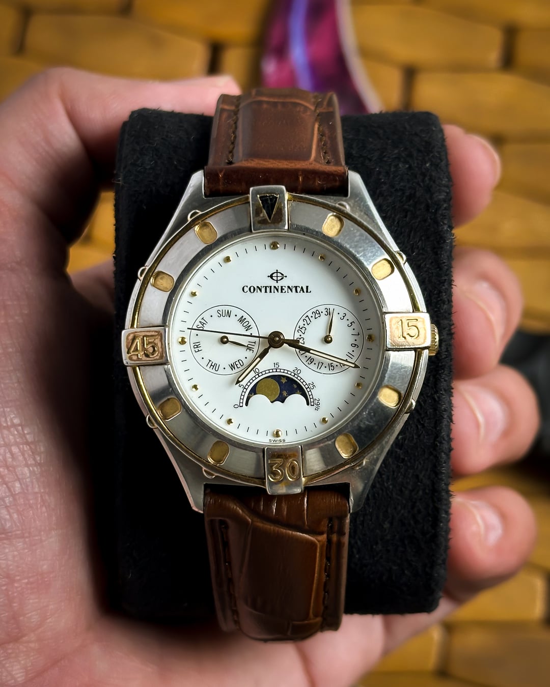 [Timestamp](https://drive.google.com/file/d/1fuuPkIoNBN_JdknTZHNzLTmY7VrXNaJ9/view?usp=sharing) Hey Watchexchange! This handsome vintage timepiece from Continental offers a complex and elegant aesthetic, popular in the late 20th century. **Continental is a traditional Swiss brand with roots tracing back to 1924, known for producing quality timepieces.** The watch features a desirable **triple calendar complication** and a beautiful **moonphase display**, making it a fantastic and affordable piece of Swiss dress watch history. The watch is powered by a **7-jewel Swiss PUW 2550.2590N Spaceline quartz movement**. The **PUW Spaceline** movements were reliable quartz calibers produced by the German manufacturer Pforzheimer Uhren-Rohwerke, commonly used by Swiss private labels like Continental to offer complex complications at an accessible price point. The focal point is the **pristine white dial** featuring an intricate layout: * Three sub-dials provide the full calendar: one for the **Day**, one for the **Date**, and the third features the stunning **moonphase display** with moon day markings. * The sub-dials are tracked by **sleek gold-tone leaf hands**. * Time is displayed via **sleek pencil hands** and **dotted gold indices**. The case is a beautiful two-tone design, featuring a classic stainless steel body accented with **18k gold plating**. It is defined by a distinct **unidirectional** **rotating bezel** with **15, 30, and 45 markings** and an arrow marker at 12. The watch is presented on a new **brown leather strap** with a classic crocodile texture, perfectly complementing the gold-plated accents. **🔹 Key Dimensions** * Case Diameter: **38mm** (without crown) * Lug-to-Lug: **43mm** * Thickness: **10mm** * Lug Width: 1**8mm** 💵 **Price: $199 shipped!** 📦 **Payment: PayPal F&F** or G&S (**+4.5% fee by buyer**) or **bank wire (US banks accepted)** 📩 **DM me for more pics or a custom timestamp.** If you're looking for an elegant Swiss vintage watch with high complexity, this Continental delivers exceptional value. Follow my [**Instagram**](https://www.instagram.com/everistwatches/) and **Reddit profile** for more **vintage drops**.
