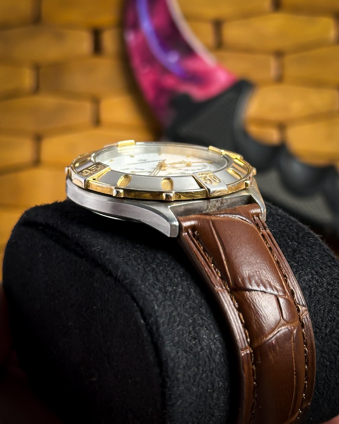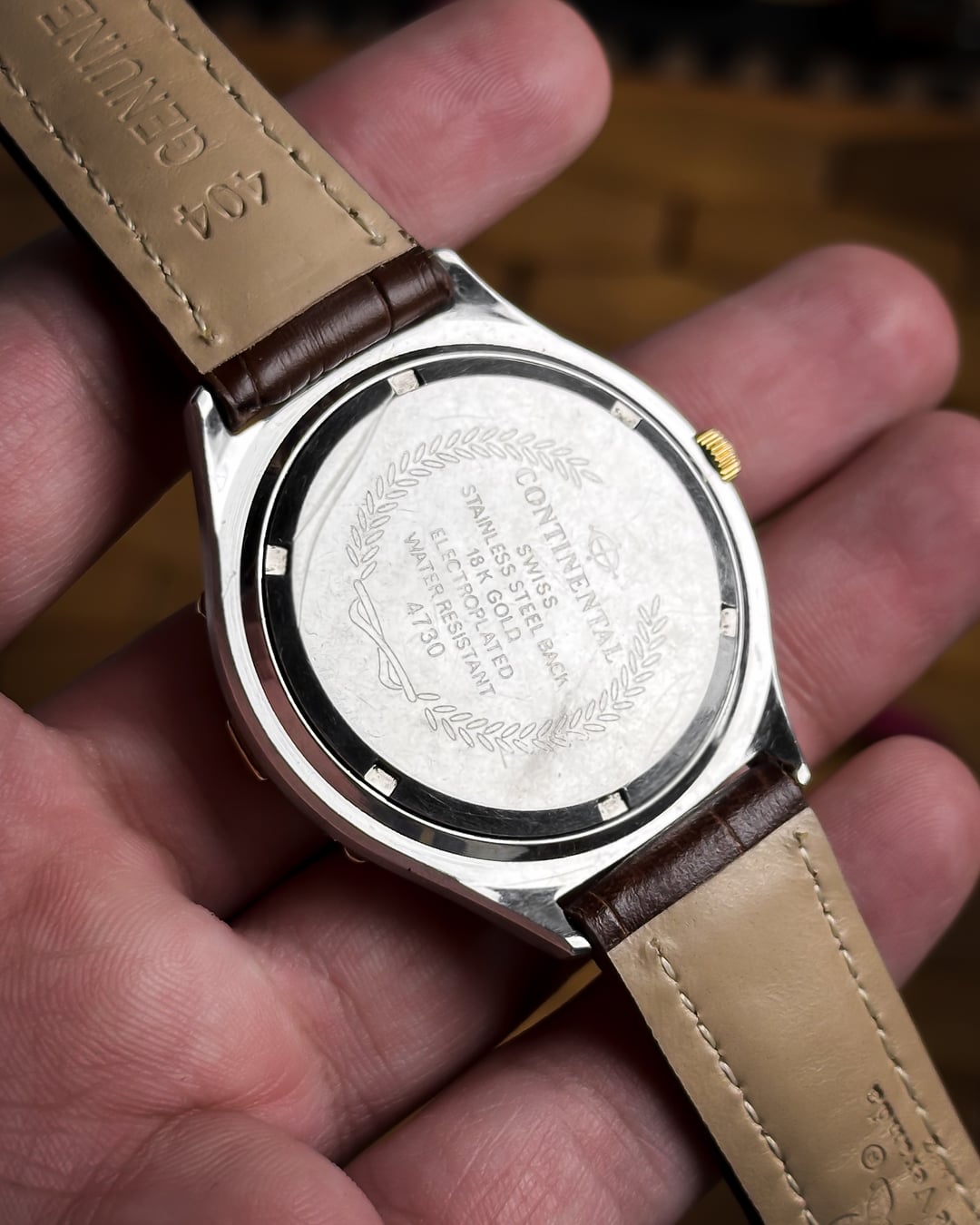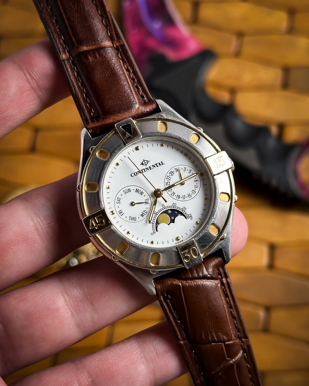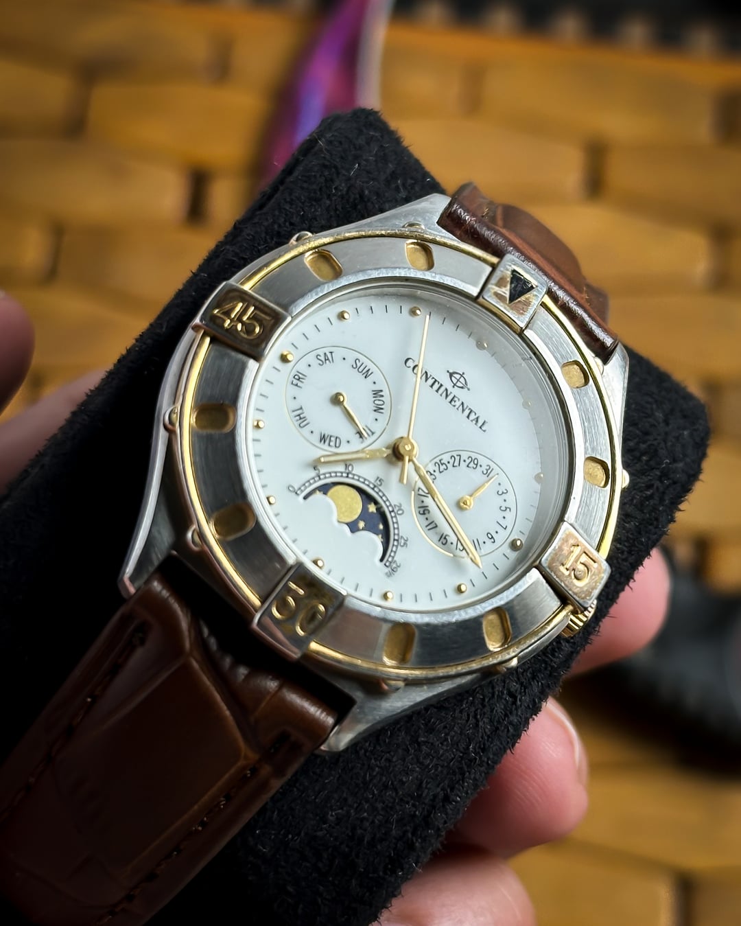 [Timestamp](https://drive.google.com/file/d/1fuuPkIoNBN_JdknTZHNzLTmY7VrXNaJ9/view?usp=sharing) Hey Watchexchange! This handsome vintage timepiece from Continental offers a complex and elegant aesthetic, popular in the late 20th century. **Continental is a traditional Swiss brand with roots tracing back to 1924, known for producing quality timepieces.** The watch features a desirable **triple calendar complication** and a beautiful **moonphase display**, making it a fantastic and affordable piece of Swiss dress watch history. The watch is powered by a **7-jewel Swiss PUW 2550.2590N Spaceline quartz movement**. The **PUW Spaceline** movements were reliable quartz calibers produced by the German manufacturer Pforzheimer Uhren-Rohwerke, commonly used by Swiss private labels like Continental to offer complex complications at an accessible price point. The focal point is the **pristine white dial** featuring an intricate layout: * Three sub-dials provide the full calendar: one for the **Day**, one for the **Date**, and the third features the stunning **moonphase display** with moon day markings. * The sub-dials are tracked by **sleek gold-tone leaf hands**. * Time is displayed via **sleek pencil hands** and **dotted gold indices**. The case is a beautiful two-tone design, featuring a classic stainless steel body accented with **18k gold plating**. It is defined by a distinct **unidirectional** **rotating bezel** with **15, 30, and 45 markings** and an arrow marker at 12. The watch is presented on a new **brown leather strap** with a classic crocodile texture, perfectly complementing the gold-plated accents. **🔹 Key Dimensions** * Case Diameter: **38mm** (without crown) * Lug-to-Lug: **43mm** * Thickness: **10mm** * Lug Width: 1**8mm** 💵 **Price: $199 shipped!** 📦 **Payment: PayPal F&F** or G&S (**+4.5% fee by buyer**) or **bank wire (US banks accepted)** 📩 **DM me for more pics or a custom timestamp.** If you're looking for an elegant Swiss vintage watch with high complexity, this Continental delivers exceptional value. Follow my [**Instagram**](https://www.instagram.com/everistwatches/) and **Reddit profile** for more **vintage drops**.