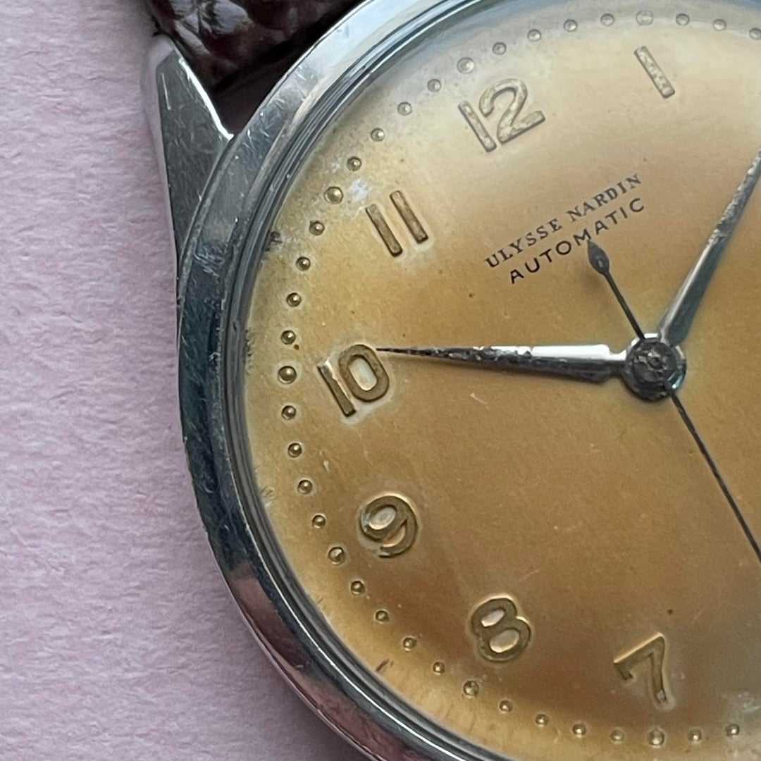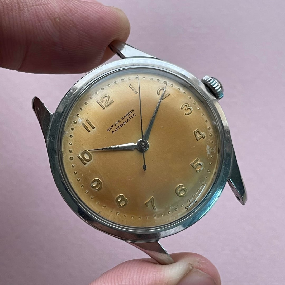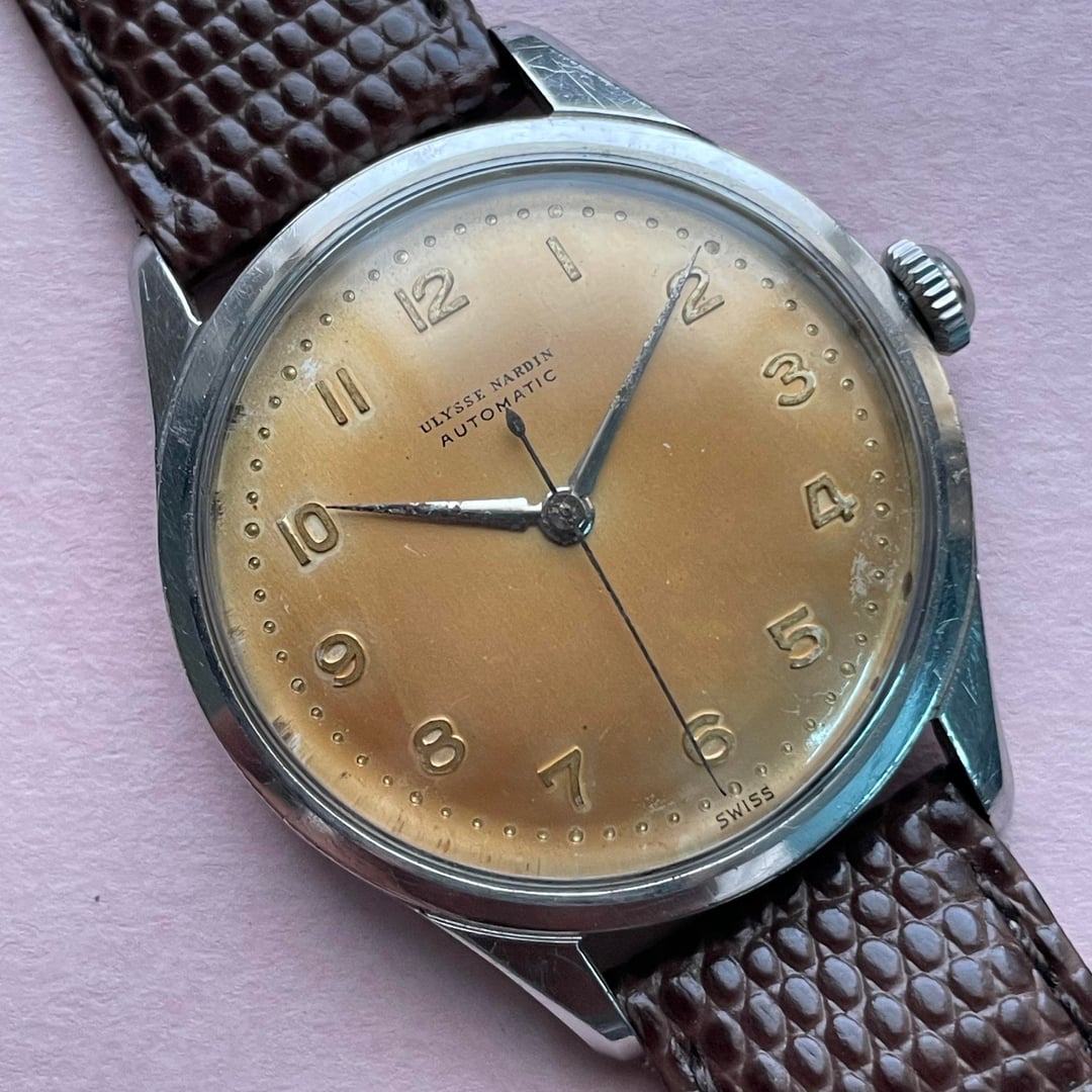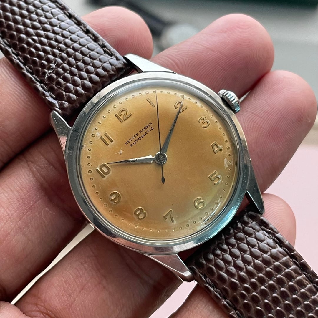 Up for sale is a vintage Ulysse Nardin powered by an automatic movement, housed in an approximately 36mm case and showcasing a beautifully aged patina dial that perfectly reflects its era. The watch is running well and keeping good time. Its condition is consistent with its vintage age, displaying definite signs of wear visible in the photos. It comes fitted with an aftermarket strap and buckle. 💲 Asking $575 – includes FedEx tracked shipping 💳 Payment via Zelle, Wise, or wire transfer 📌 Please note: The watch is shipped from Asia and will be shipped within 2–3 days of payment.