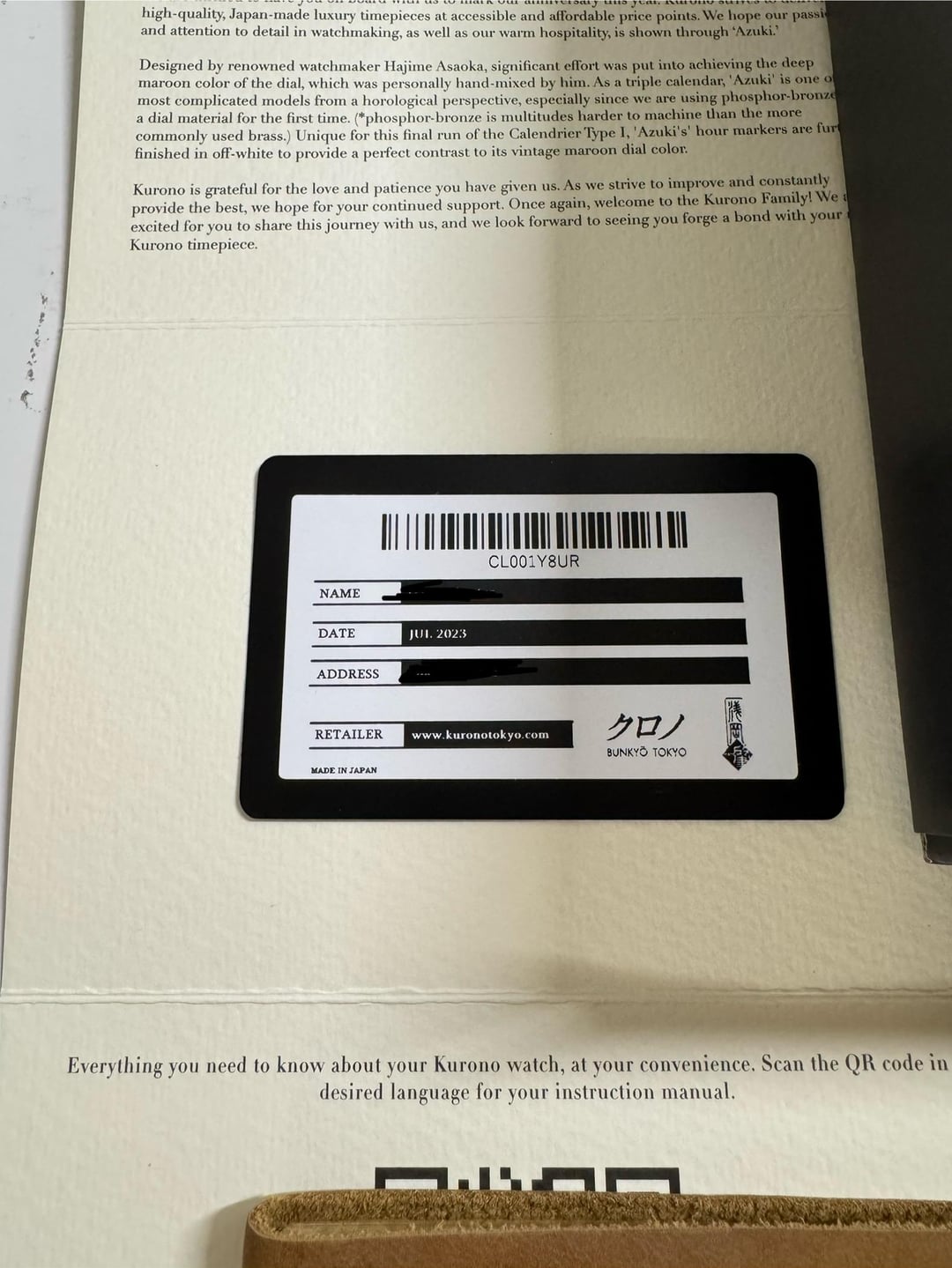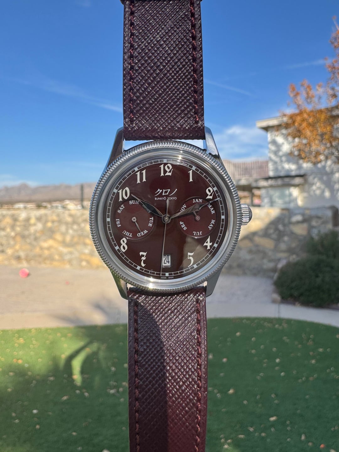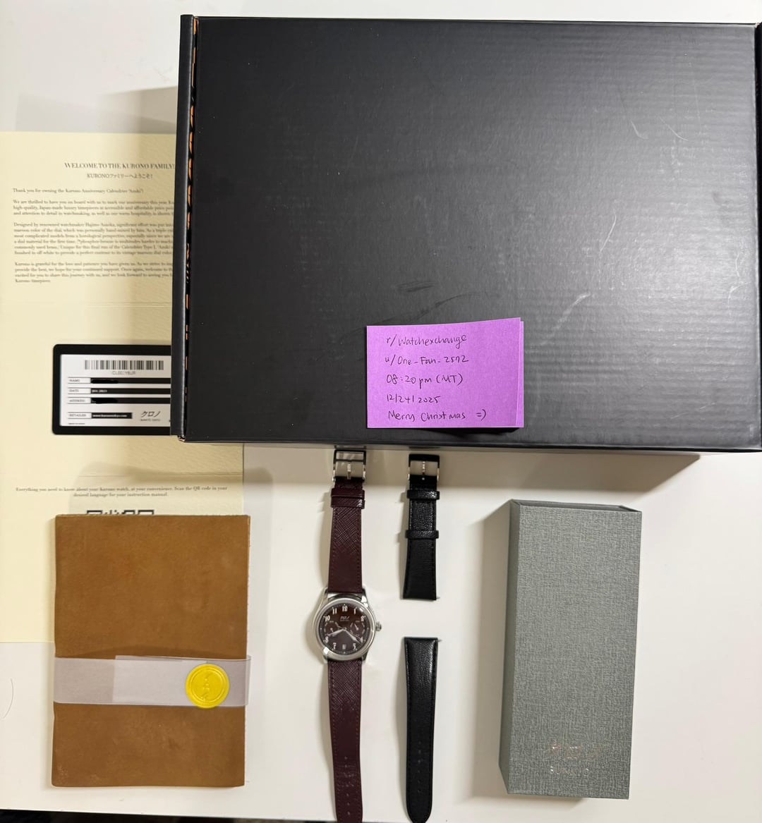 Hi Watchex, New Year Sale pricing on my **Kurono Tokyo Calendrier “Azuki”**, one of the most sought-after colorways from Kurono. Offered as a **2023 full set**. **Details** * Brand / Model: **Kurono Tokyo Calendrier** * Dial: **Azuki (deep burgundy / red-brown tone)** * Year: **2023** * Condition: **Excellent overall** * Case size: **38mm** * Movement: Automatic * Crystal: Sapphire The Azuki dial is stunning in person and beautifully showcases Hajime Asaoka’s design language. **Includes** * Watch * Inner & outer box * Burgundy strap & original Kurono black leather strap * Warranty card / papers → **True full set** **Price** 💲 **$2,499 shipped** **Logistics / Payment** * 📍 Location: **TX** * 💳 Payment: **Zelle, Venmo, PayPal F&F** * 🚚 Shipping: CONUS, fully insured & tracked Photos, videos, and **timestamps available anytime upon request**. Questions welcome — happy to chat watches.