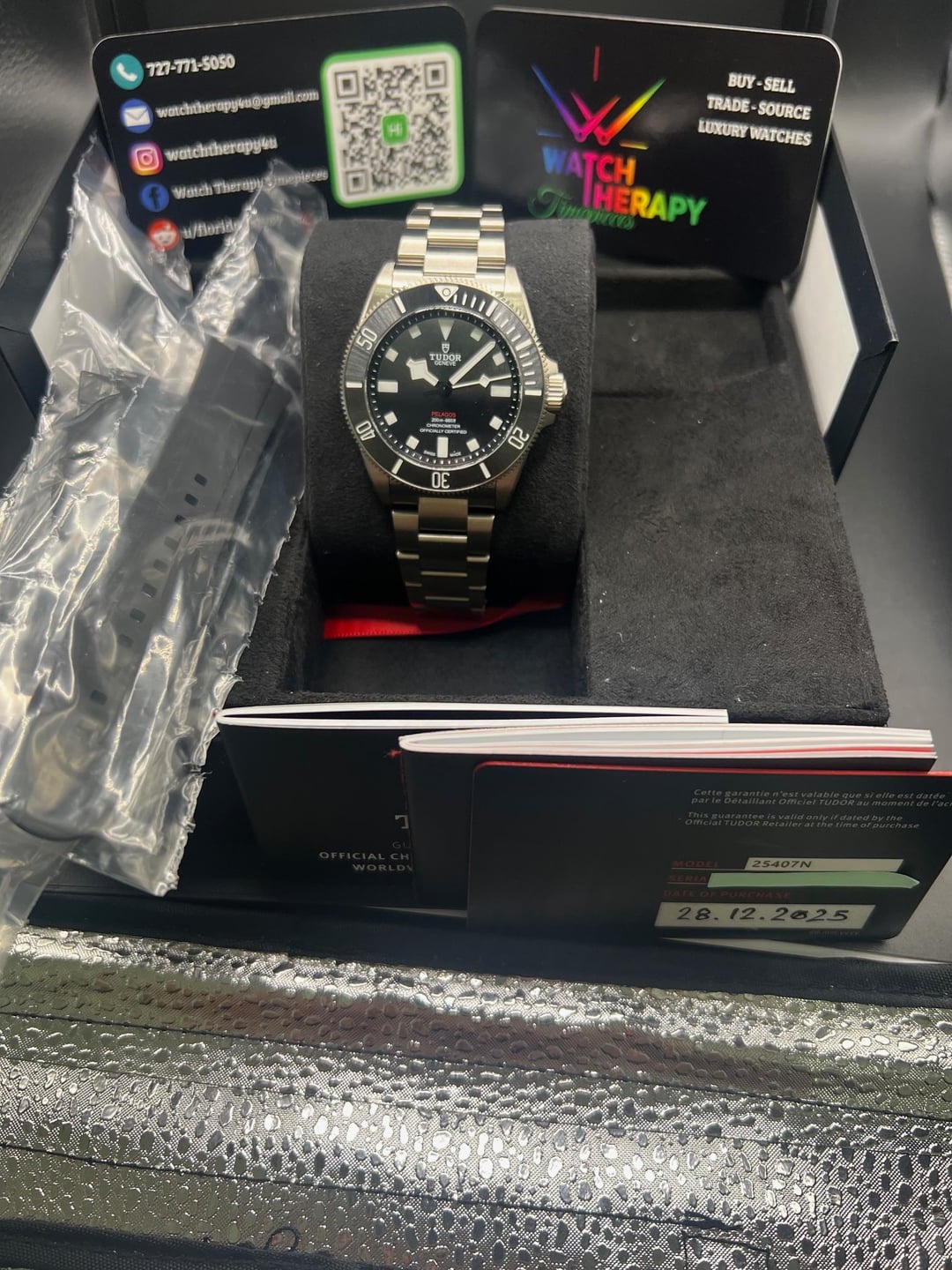 **F/S: New Tudor Pelagos 39 Black Titanium 12/25 “P39” Ref. 25407N** **Mods: This is a different watch than the one just marker Sold, TY.** **Shipping from Florida.** **Specs:** \* Beautiful sunburst black satin ceramic dial \* Self-winding \* Size 39 Titanium case w/TI bezel \* Titanium bracelet \* 200M Water Resistance \* 70-hour power reserve \* MT5400 (COSC) movement **Includes**: Warranty card 12/25, double boxed, booklets, extra OEM strap and full links. **Condition:** 10/10 unworn **Price: $4,199.00 + Insured shipping to your local FedEx for pick-up in Con US**. I am also open to a face-to-face public transaction in or around the Tampa Florida Region, within reason. I have many strong and viable references within Reddit and from Buy/Sell/Trade Watch Facebook groups. Always willing to jump on a call or meeting link to show you the watch. Thank you and please reach out if you have any questions or concerns. Florida residents may be subject to sales tax w/o a valid resale cert. ***No Trades, TY*** **Location**: Tampa Florida **Payment:** Zelle or Wire Timestamp: [https://imgur.com/a/l2yPyJY](https://imgur.com/a/l2yPyJY) FB: Watch Therapy Timepieces IG: [@watchtherapy4u](https://www.reddit.com/u/watchtherapy4u/)