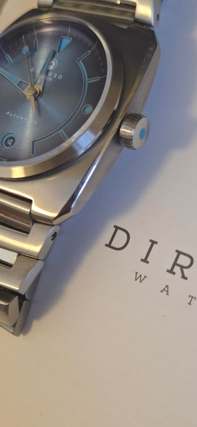Beautiful Direnzo 02R Aerolite with an eye-catching, light-catching steel blue/blueberry dial. It's a special watch but I need to make room for a new Direnzo. If you know Direnzo, then you know this watch. Great condition. Sold out and difficult to obtain. Here’s an Imgur album: [https://imgur.com/a/mL3rXwy](https://imgur.com/a/mL3rXwy) This has been rarely worn (sadly). Under warranty until January 2027. Sized for a 7.25" wrist, plus 5 extra links. This watch has tremendous lume and even the crown has lume. The watch is waterproof to 100 meters and the case and metal bracelet are hardness coated, making it almost impossible to scratch. Asking **$699** shipped CONUS. International buyers pay shipping. Local San Francisco Bay Area pickup is ok. PayPal F&F. Add 4% for G&S. No trades please. Thanks! Here are the details: Swiss made DRZ 02R Aerolite (Elaborated movement with Incabloc shock protection system) Metal bracelet with butterfly clasp Wallet Warranty card Instructions Specs: Case -- 316L Steel with scratch resistance coating (HV 800) Crystal -- Flat sapphire with anti-reflective coating Bracelet -- Metal bracelet with butterfly clasp and half links Diameter without crown -- 39mm Lug to Lug -- 44mm Height --10.8mm Water resistance --10 ATM Movement -- Sellita SW-200-1 Elaborated + Incabloc Caseback -- Screw down with sapphire crystal Weight -- 150gr. with bracelet (all links) Warranty -- 24 months